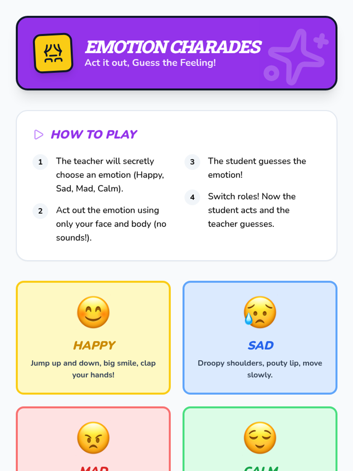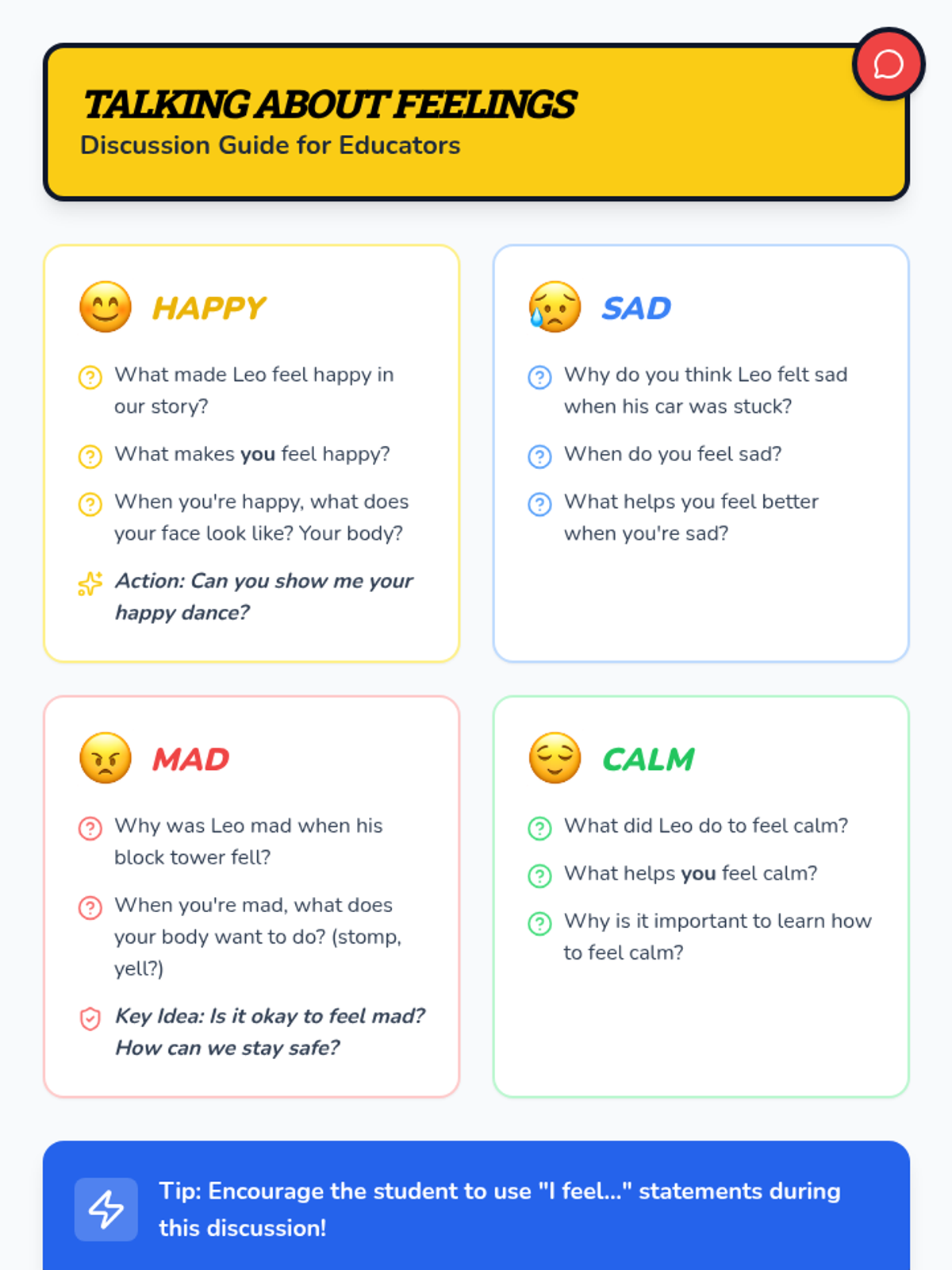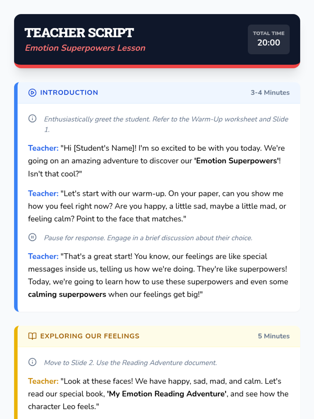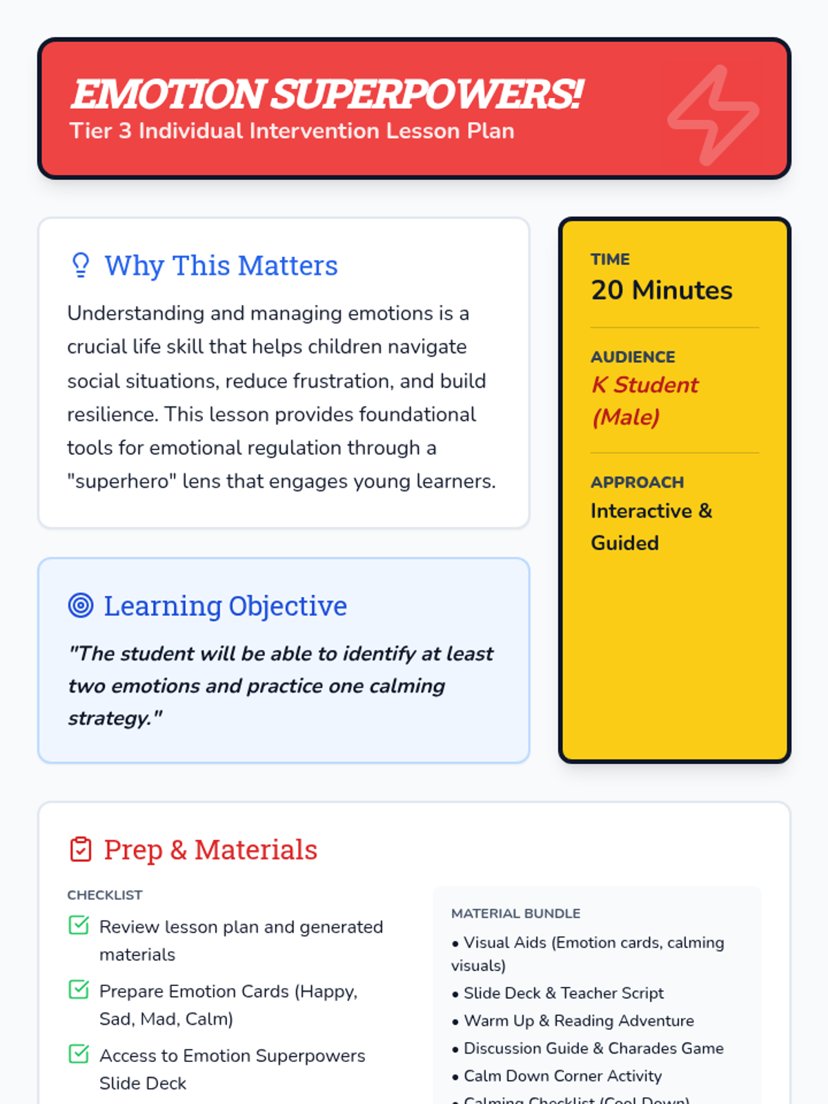 A 20-minute Tier 3 intervention for a Kindergarten student focused on identifying happy, sad, mad, and calm feelings and practicing calming strategies like deep breathing and counting.