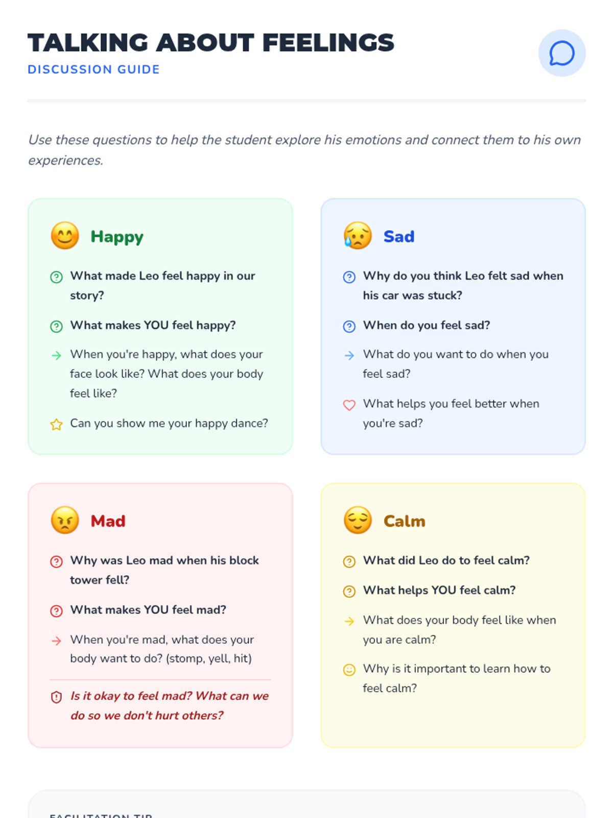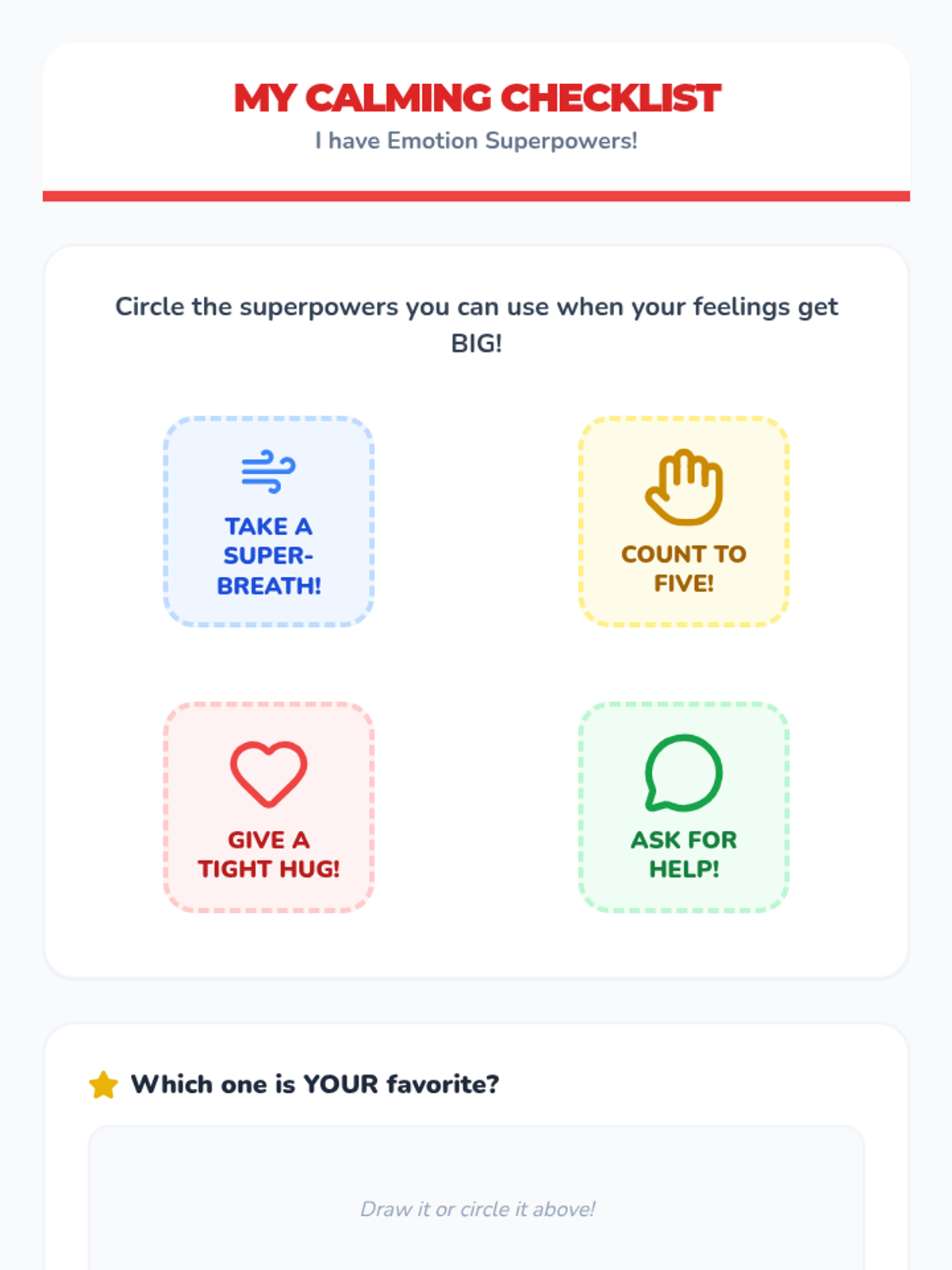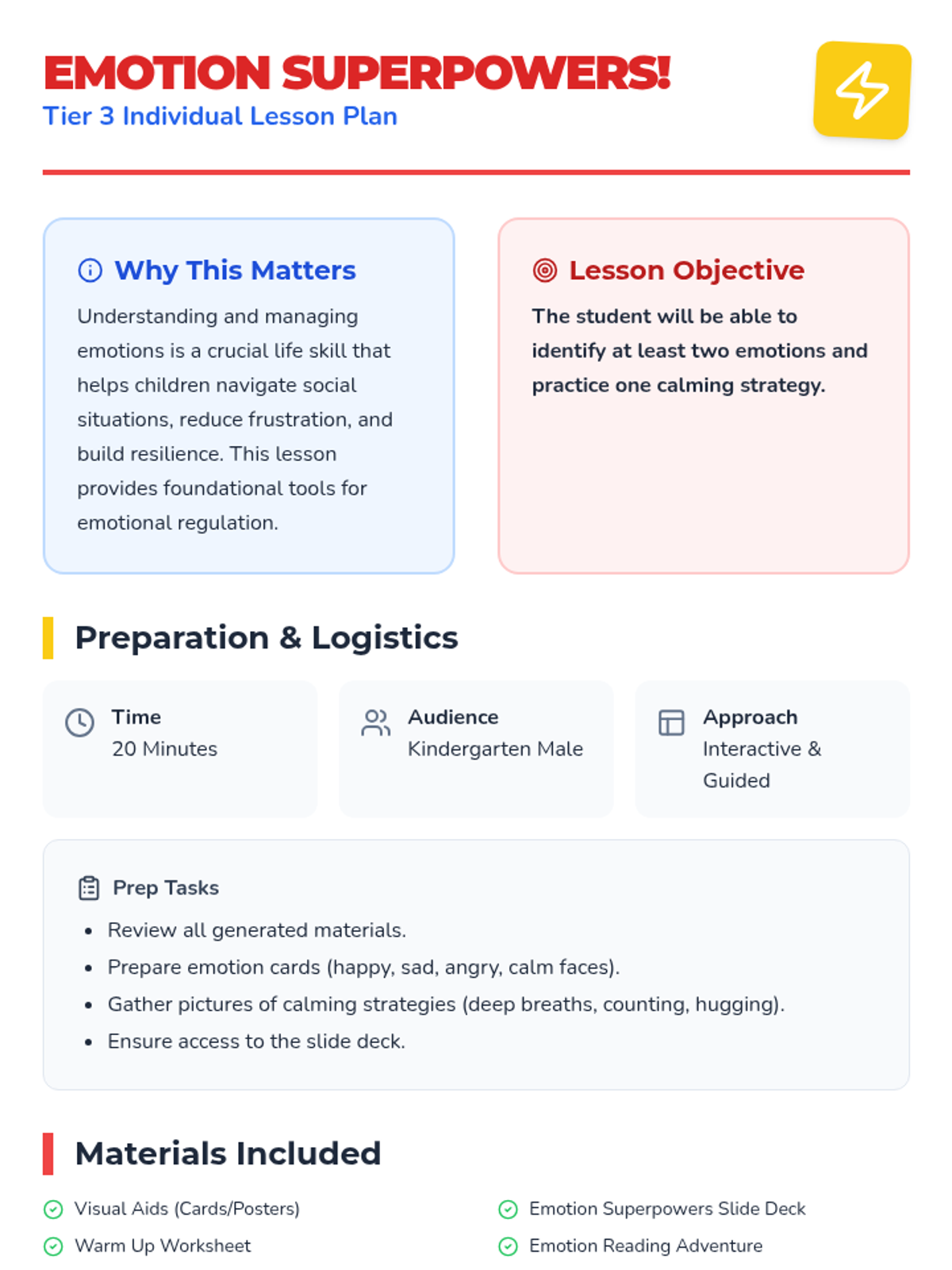 This 20-minute, individual lesson for a Kindergarten male student focuses on recognizing and managing big emotions. It provides practical strategies for identifying feelings and using calming techniques, helping him develop essential self-regulation skills.