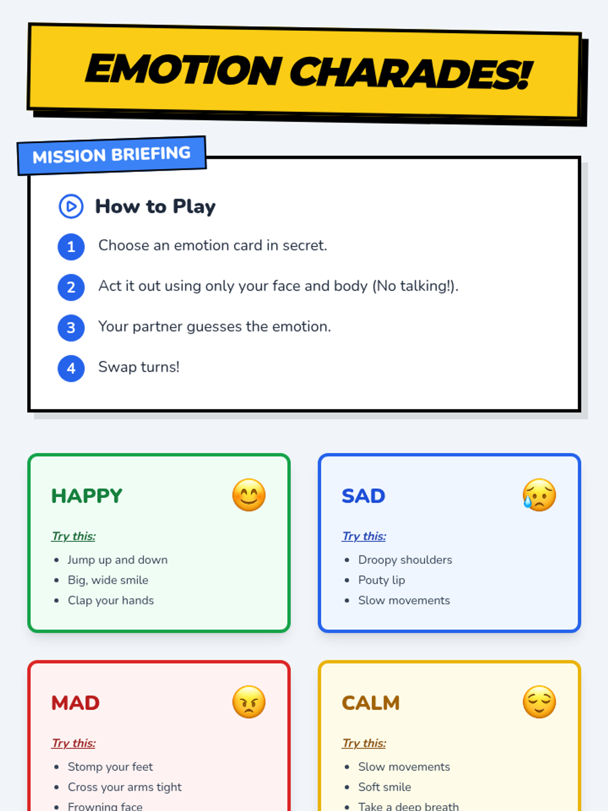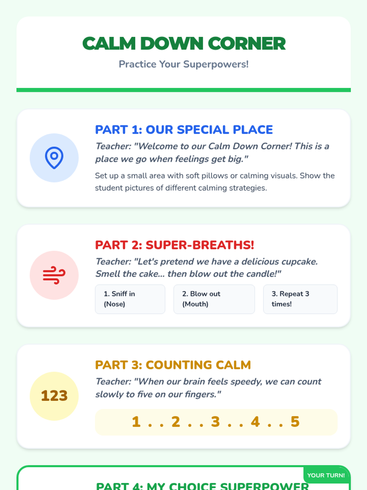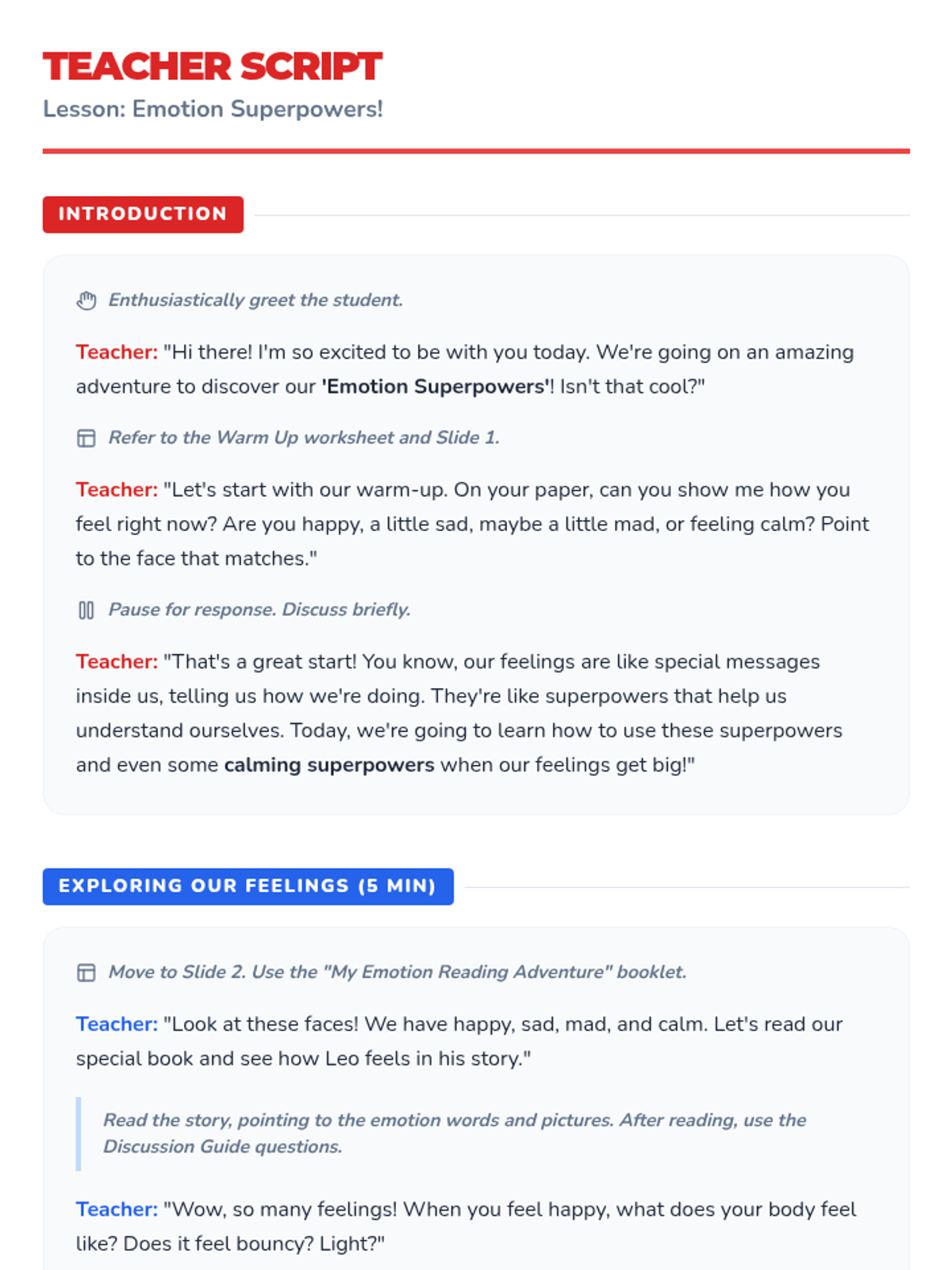This 20-minute, individual lesson for a Kindergarten male student focuses on recognizing and managing big emotions. It provides practical strategies for identifying feelings and using calming techniques, helping him develop essential self-regulation skills.