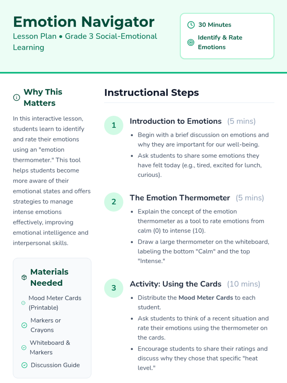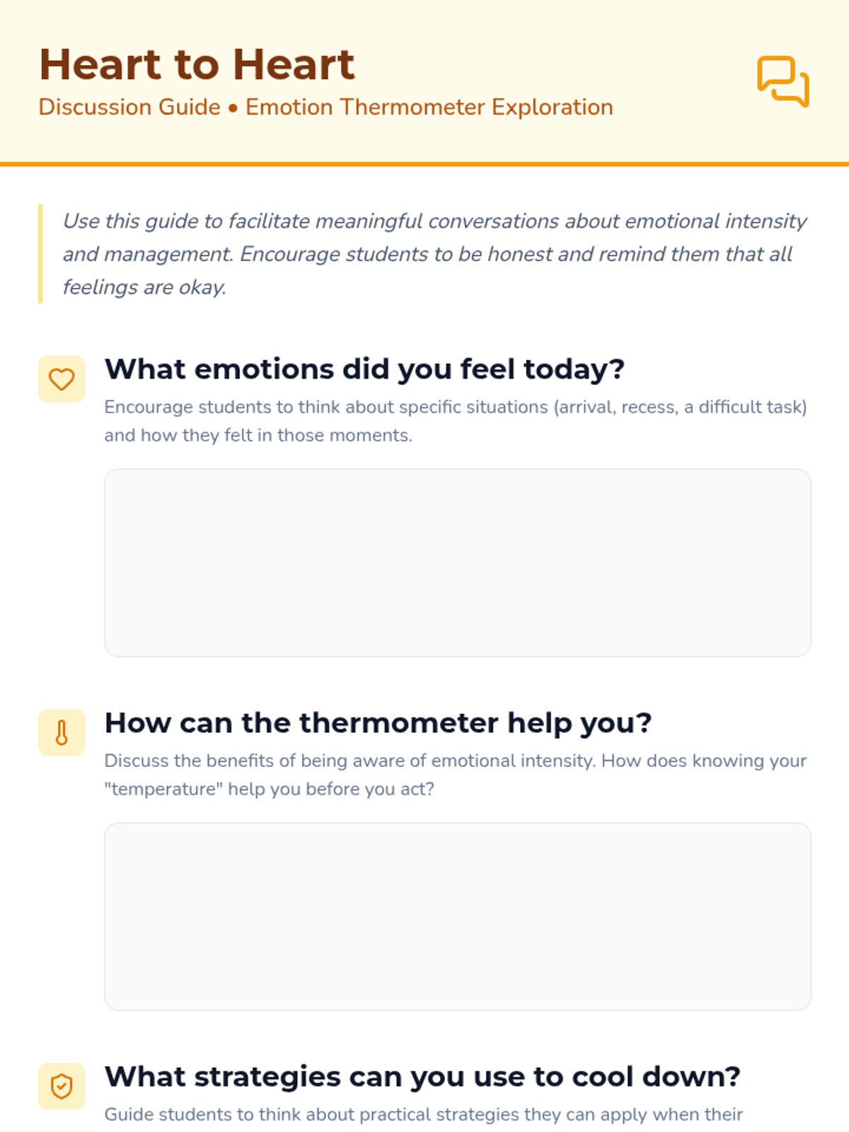 Students will learn to identify and rate their emotions using an 'emotion thermometer,' improving emotional awareness and learning management strategies for intense feelings.