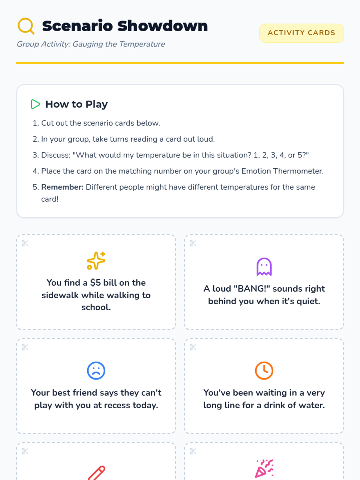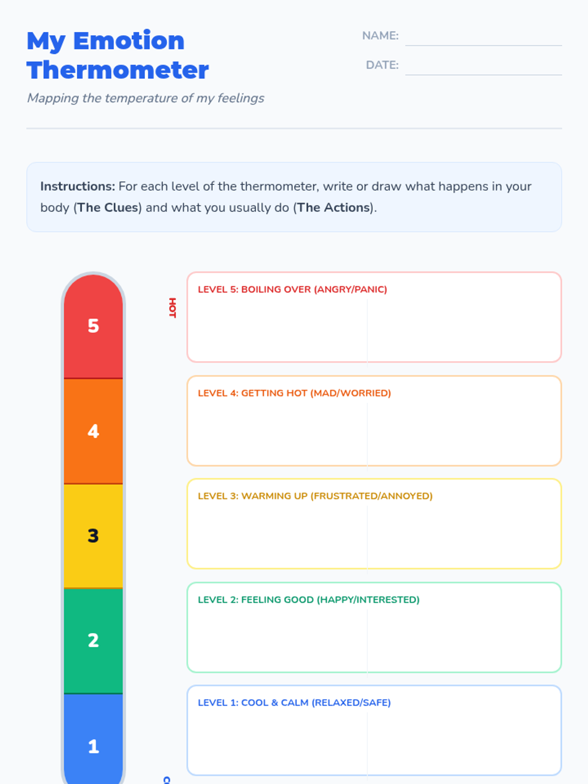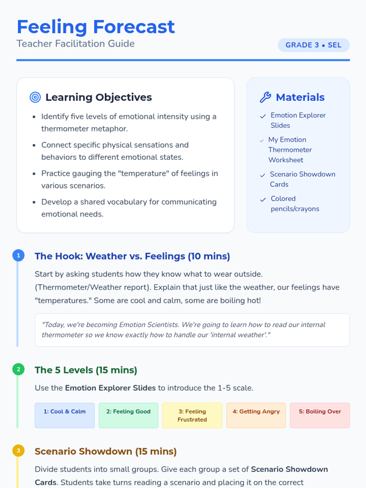 A 3rd-grade lesson using the 'Emotion Thermometer' metaphor to help students identify, name, and gauge the intensity of their feelings from calm to overwhelmed.