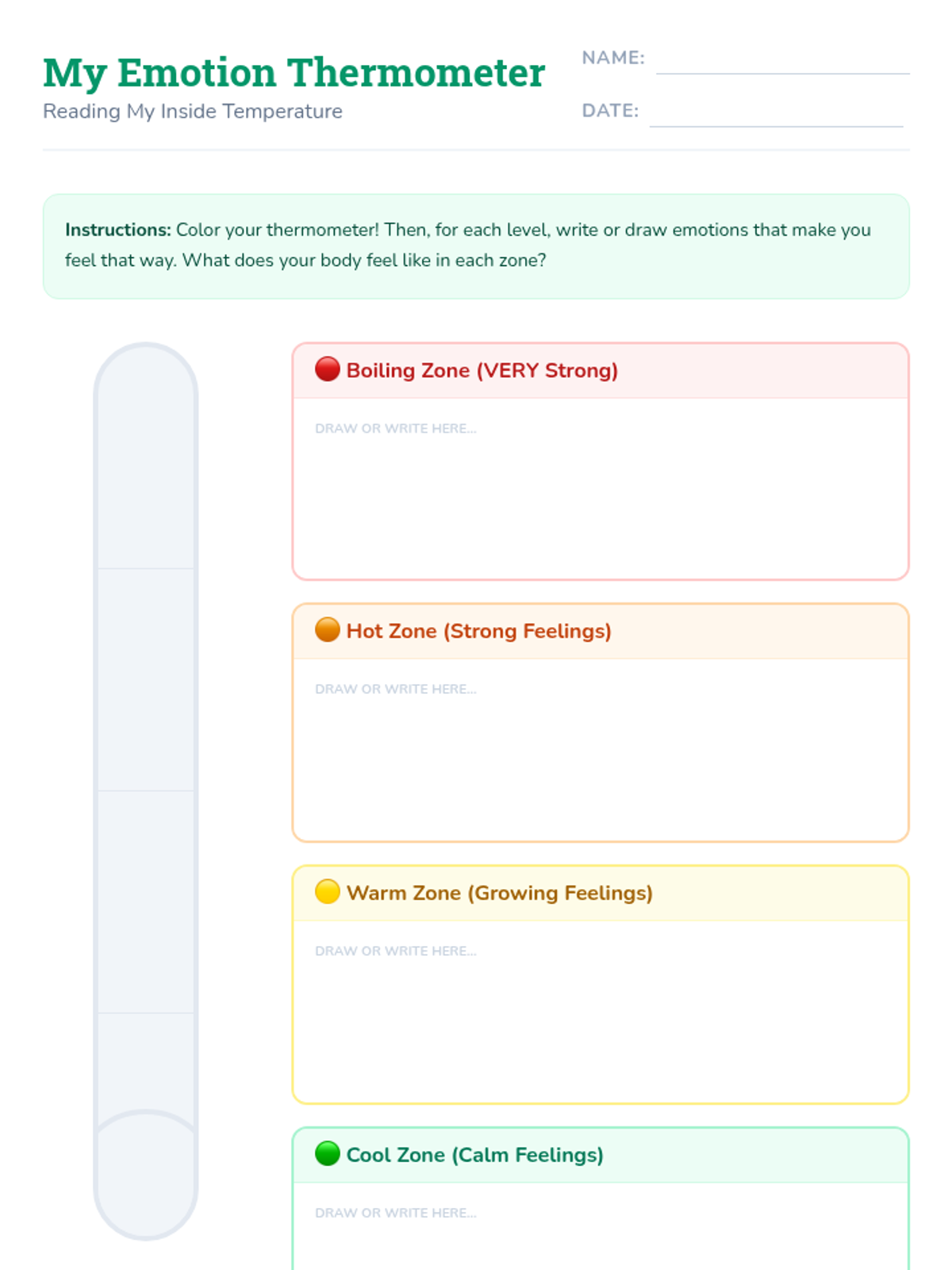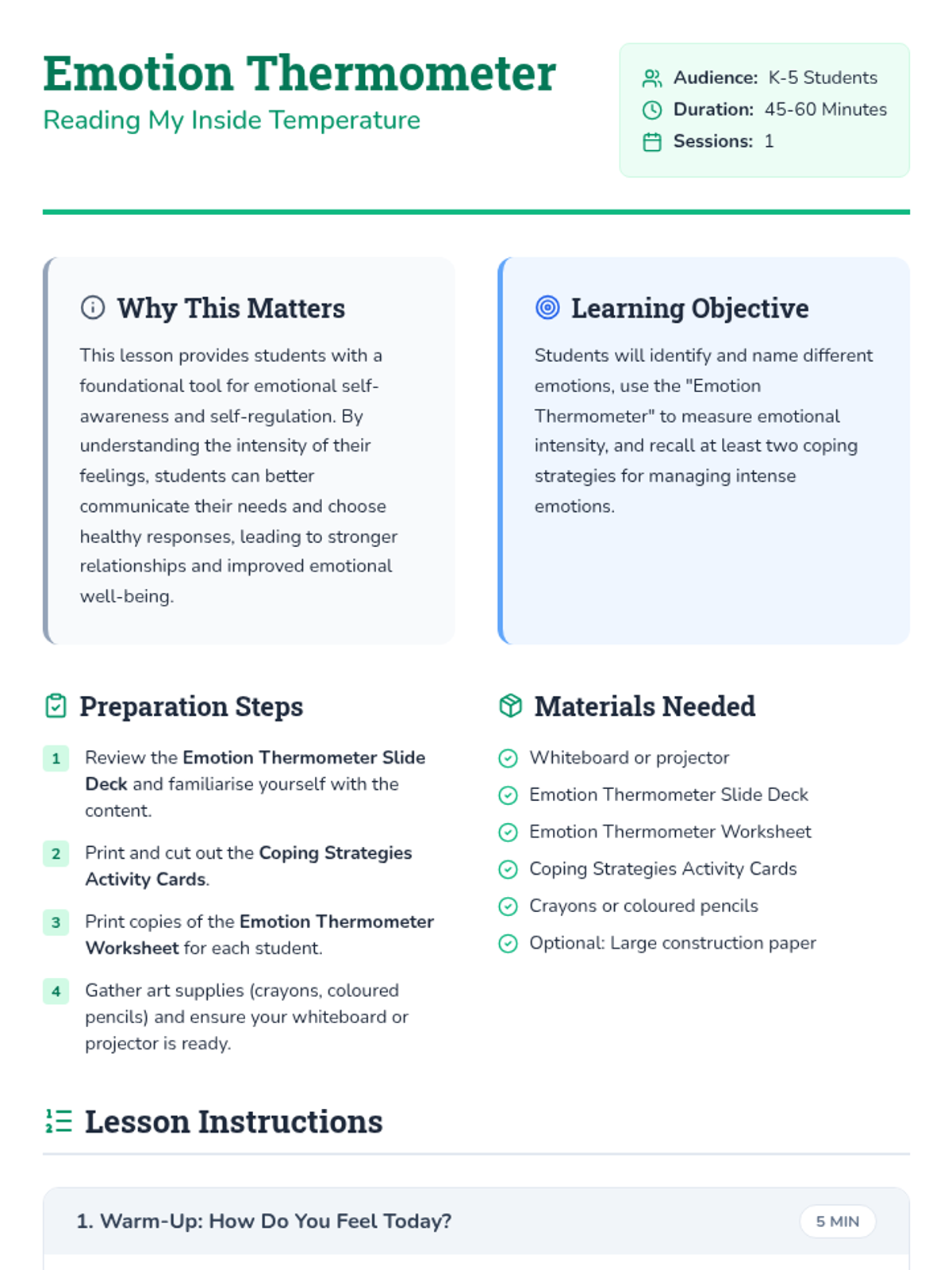 A foundational SEL lesson for K-5 students to identify emotional intensity using a 'thermometer' visual and learn effective coping strategies for self-regulation.