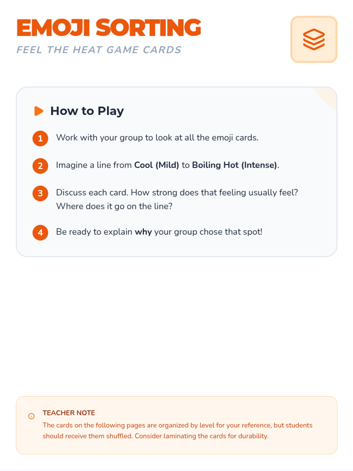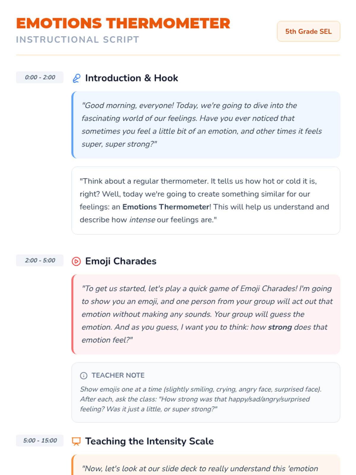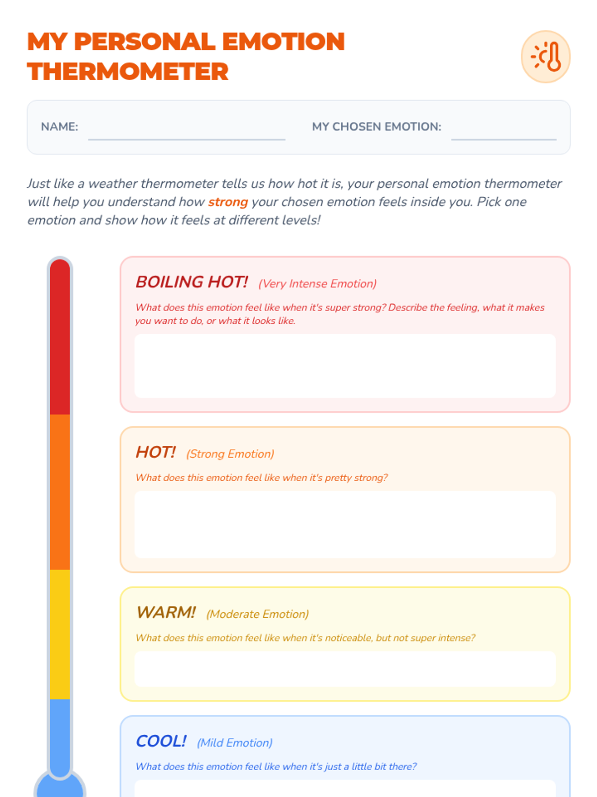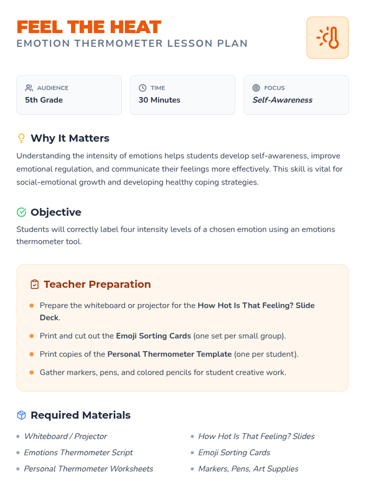 A social-emotional learning lesson for 5th graders to identify and scale the intensity of their emotions using a thermometer metaphor. Students move from simple identification to understanding the nuances of emotional 'temperature'.