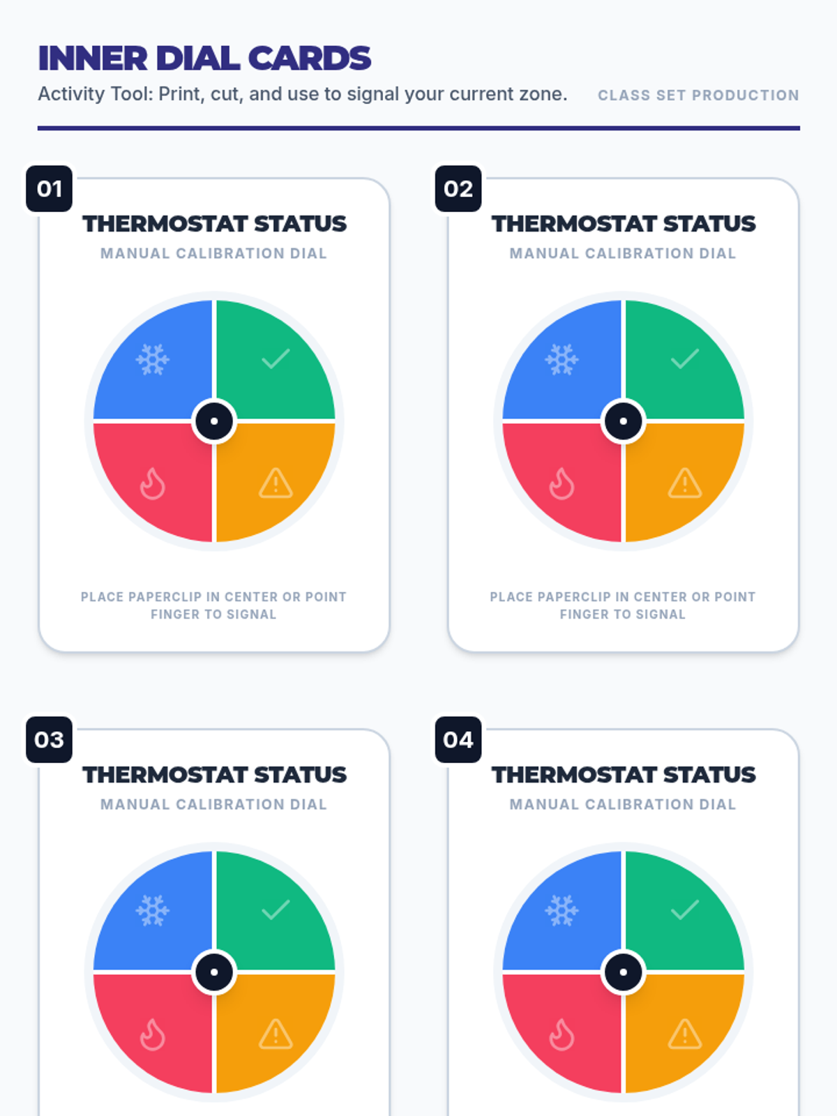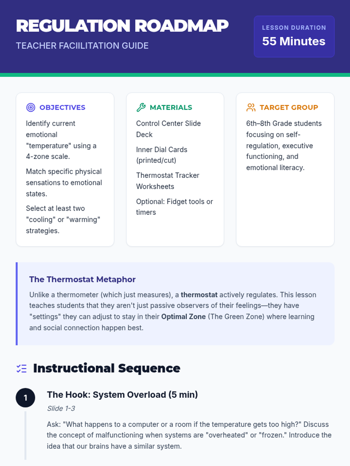 A lesson for 6th-8th graders using a thermostat metaphor to identify and regulate emotional states. Students explore different 'zones' and practice specific strategies to return to a balanced state of focus.