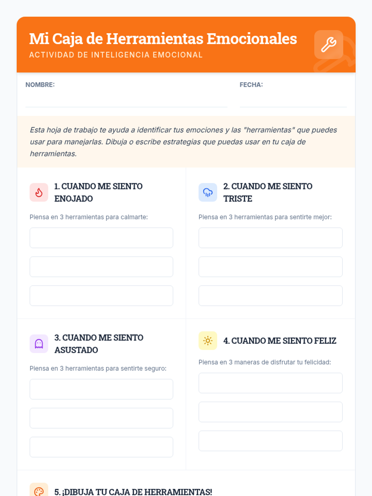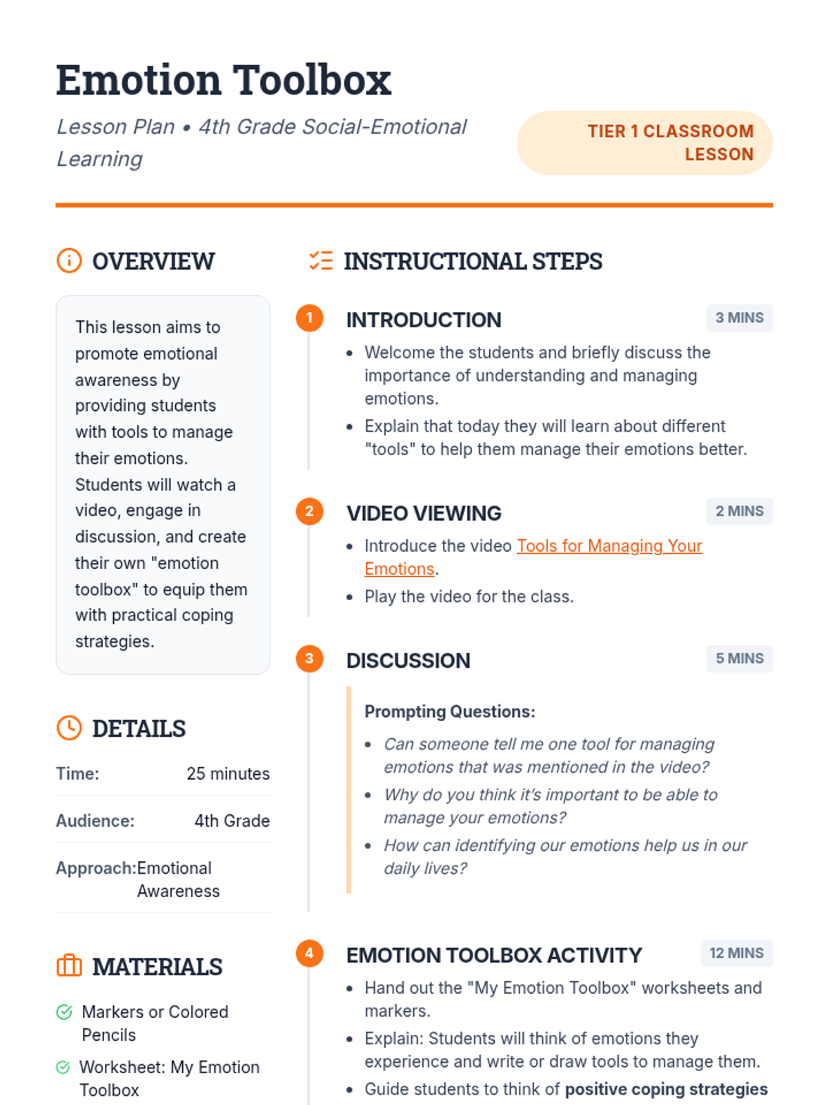 A lesson for 4th-grade students to promote emotional awareness and provide practical tools for managing emotions through a video, discussion, and creative toolbox activity.