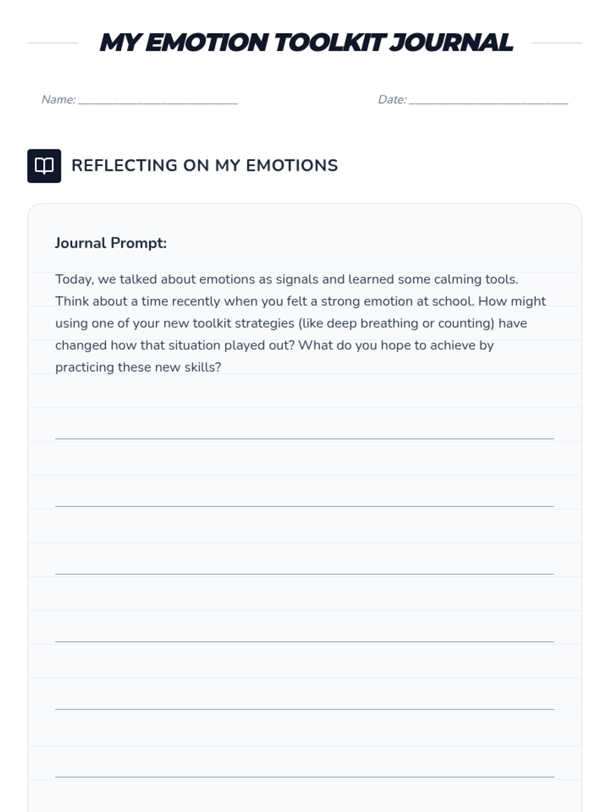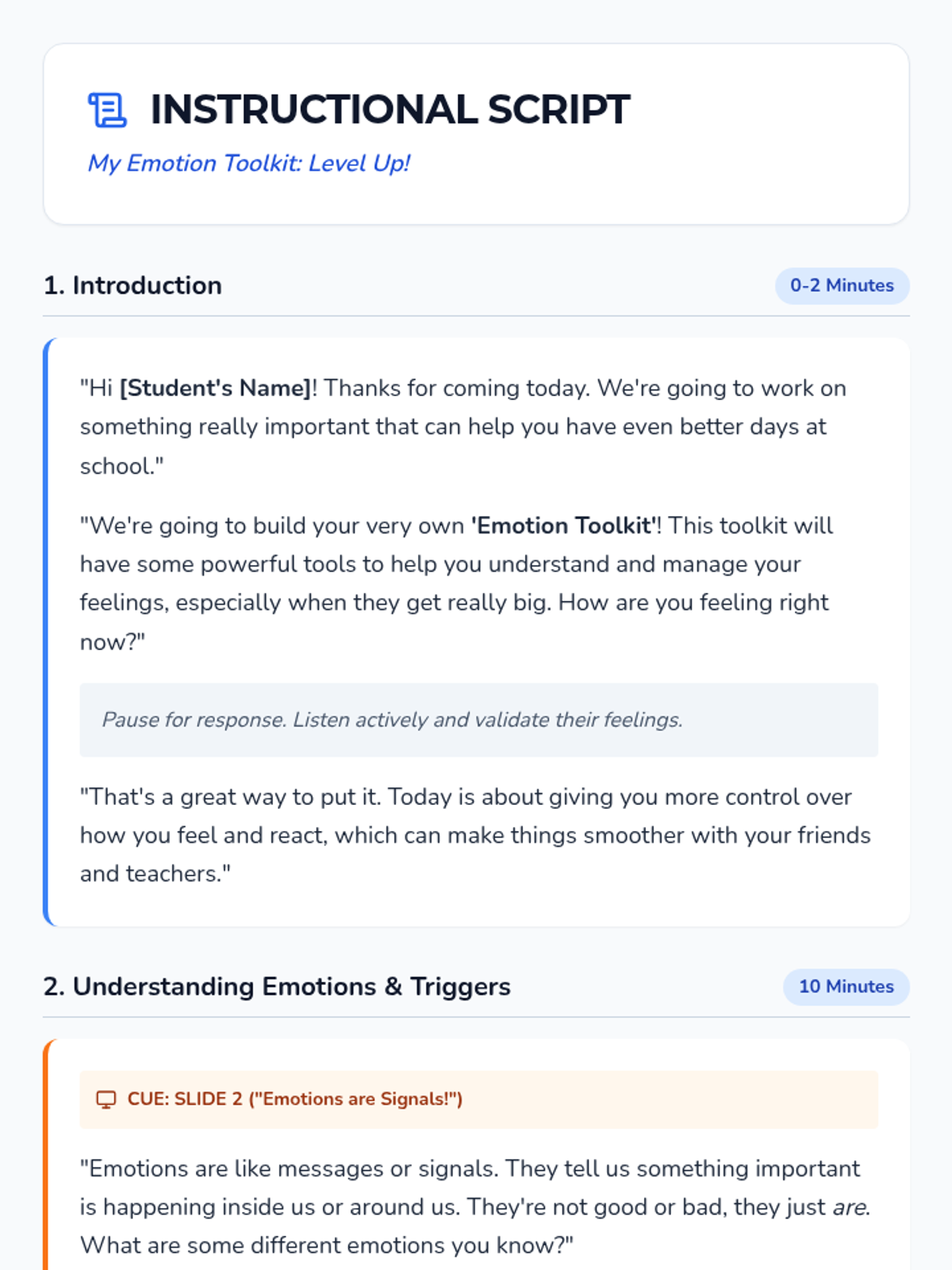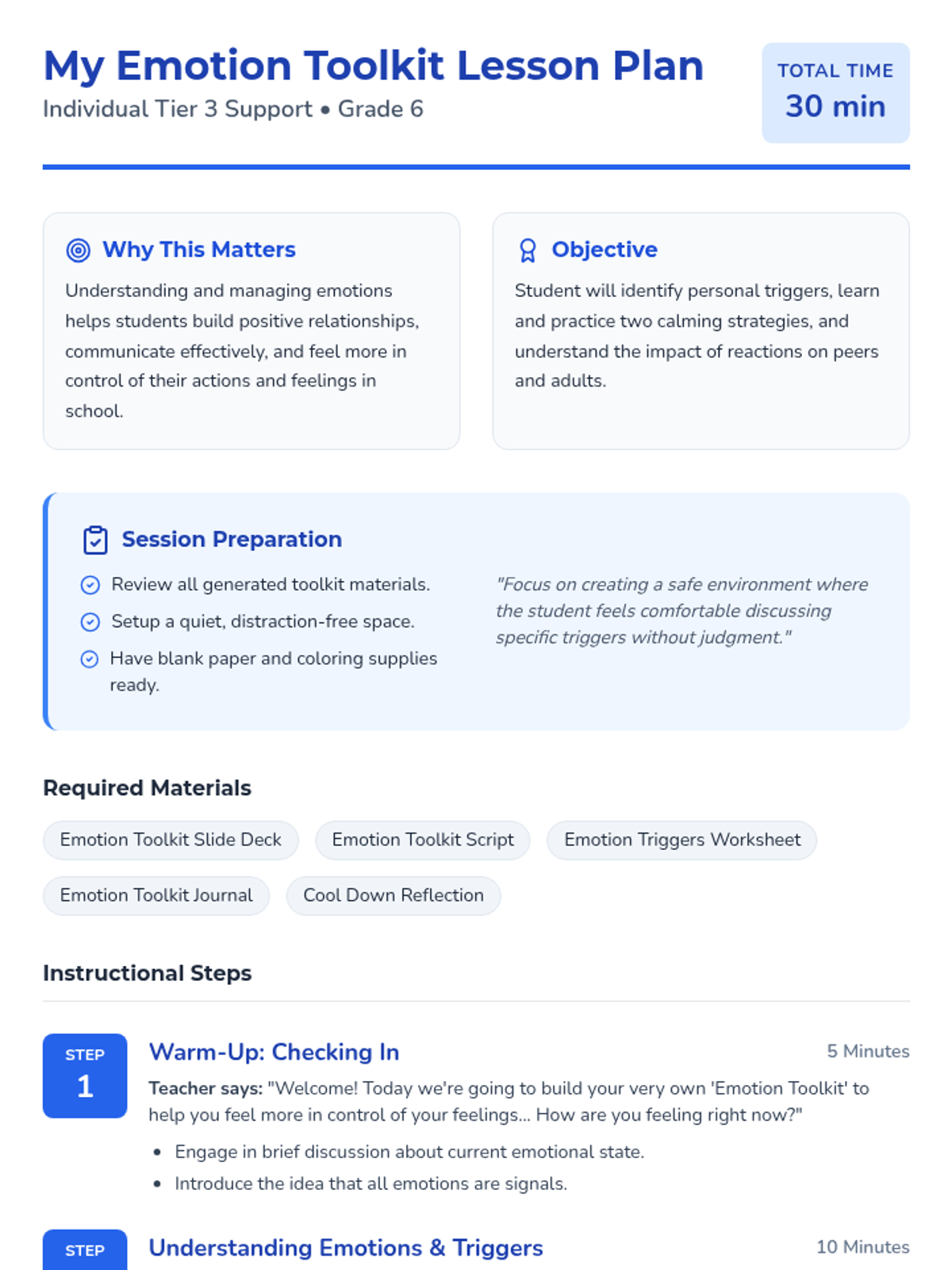A 30-minute Tier 3 individual session for 6th-graders to identify emotional triggers and practice calming strategies for better school interactions.