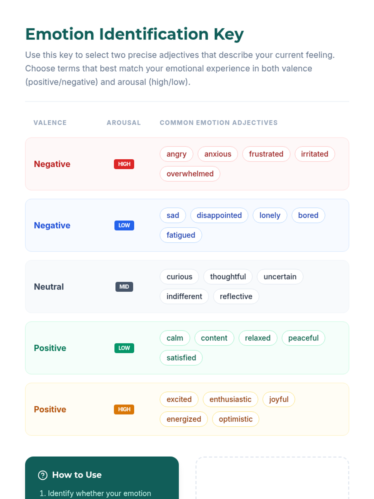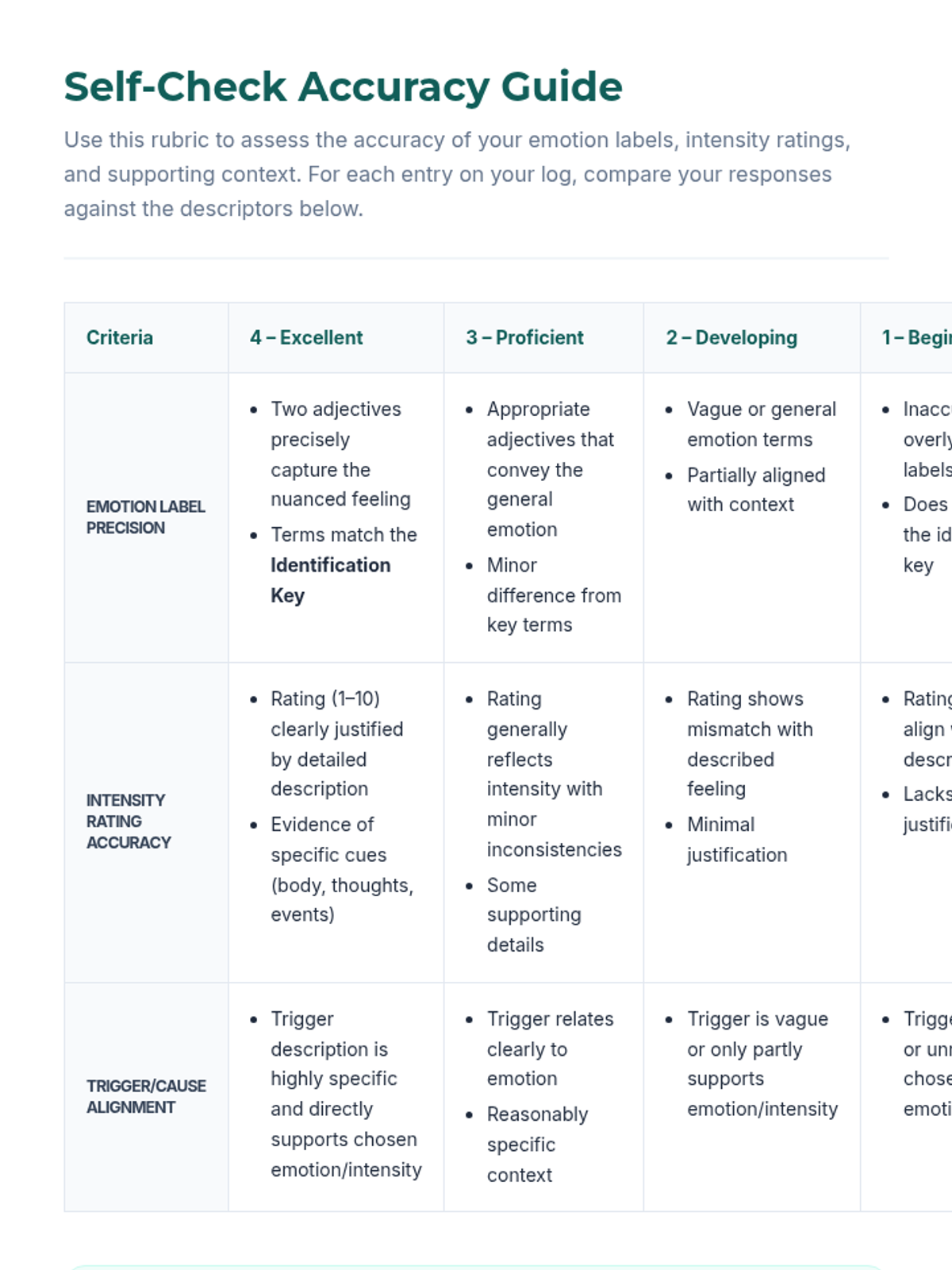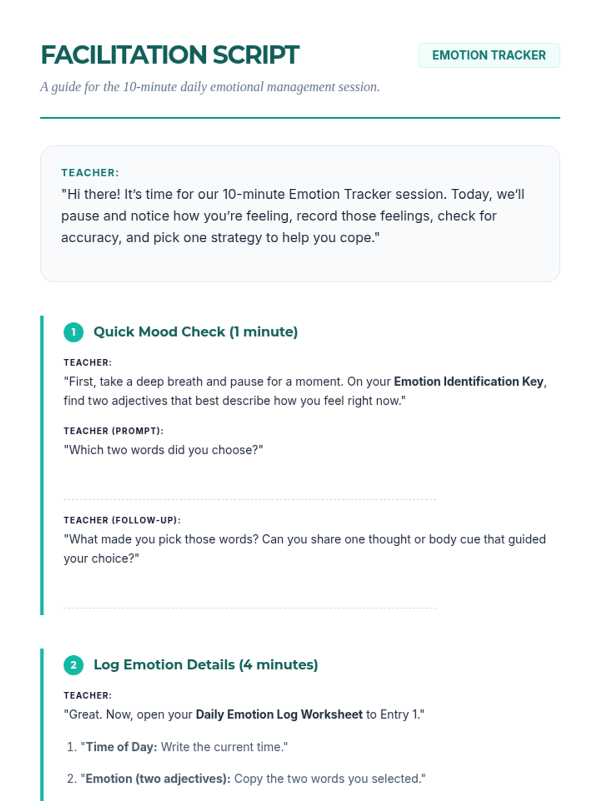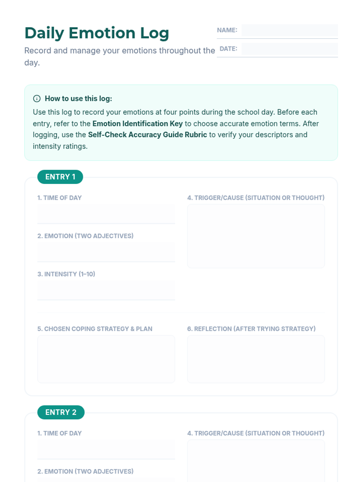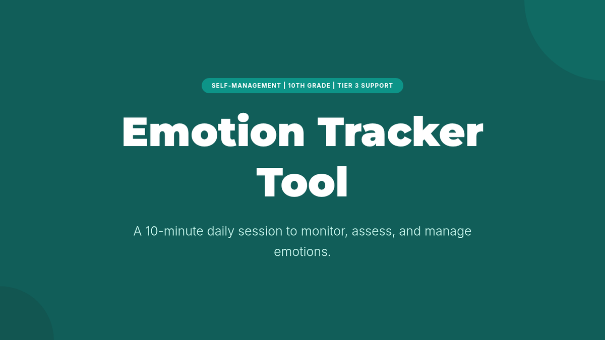 A personalized, 10-minute daily session tool for a 10th grade student to log and manage emotions, fostering self-awareness and proactive self-management skills. This Tier 3 individual support helps identify emotions, track patterns, and apply coping strategies.