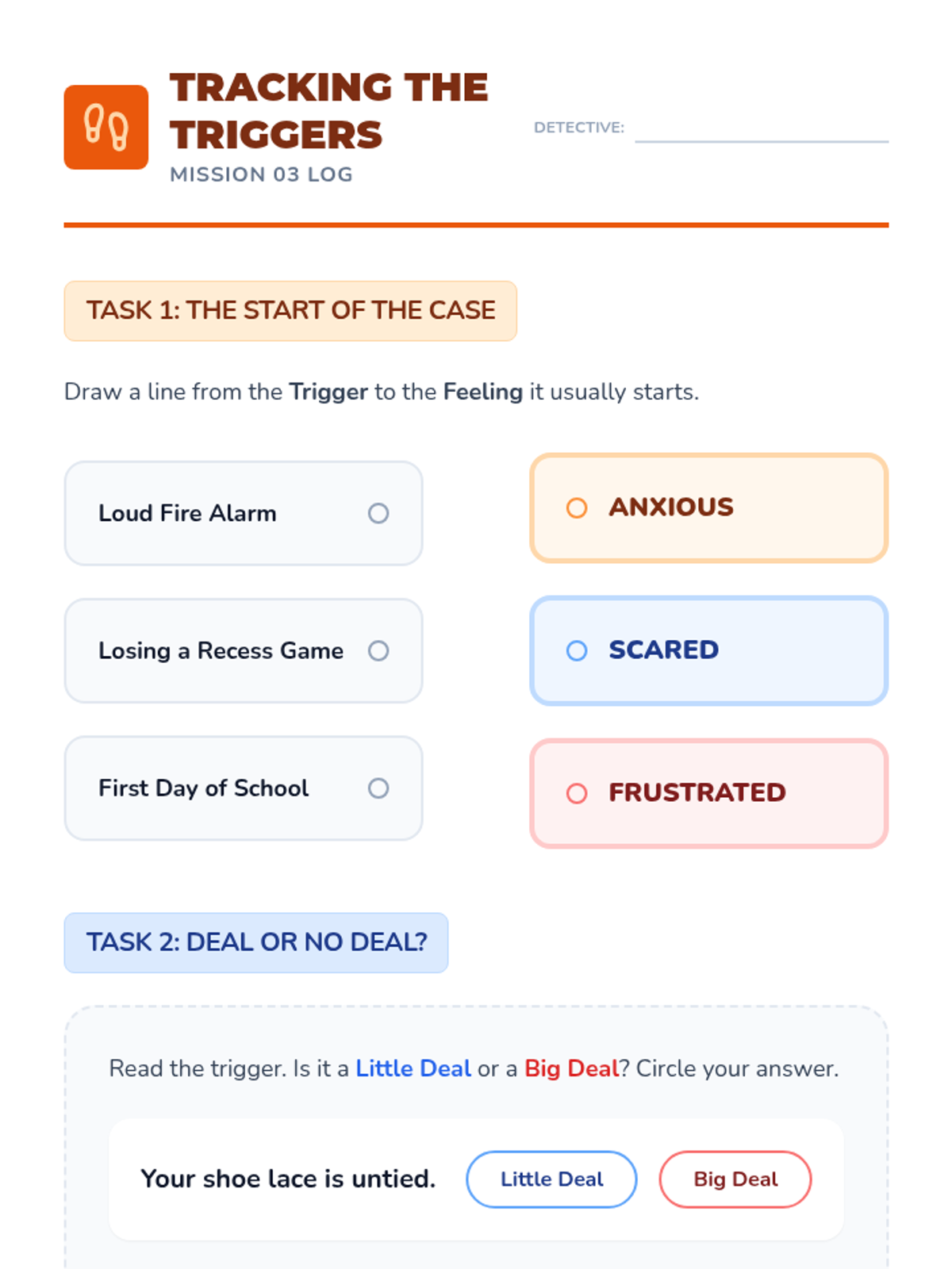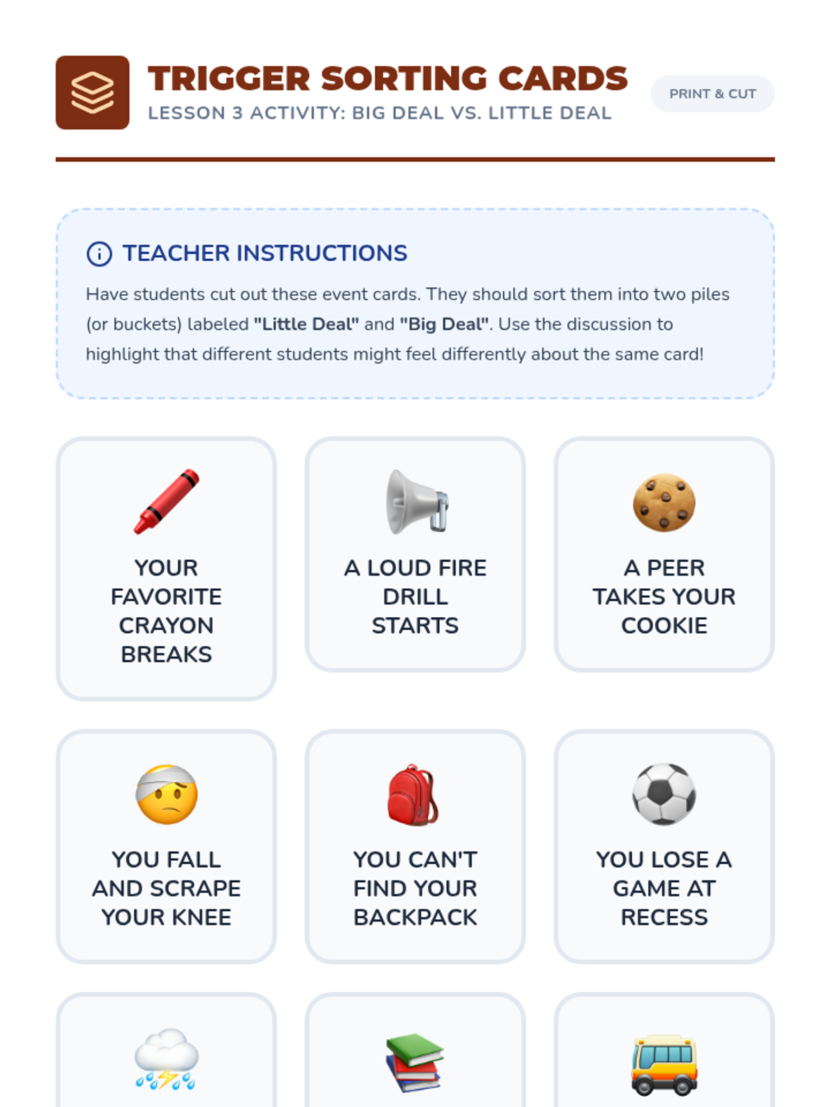 Students identify specific 'triggers' that cause emotional shifts and practice cause-and-effect reasoning for their reactions.