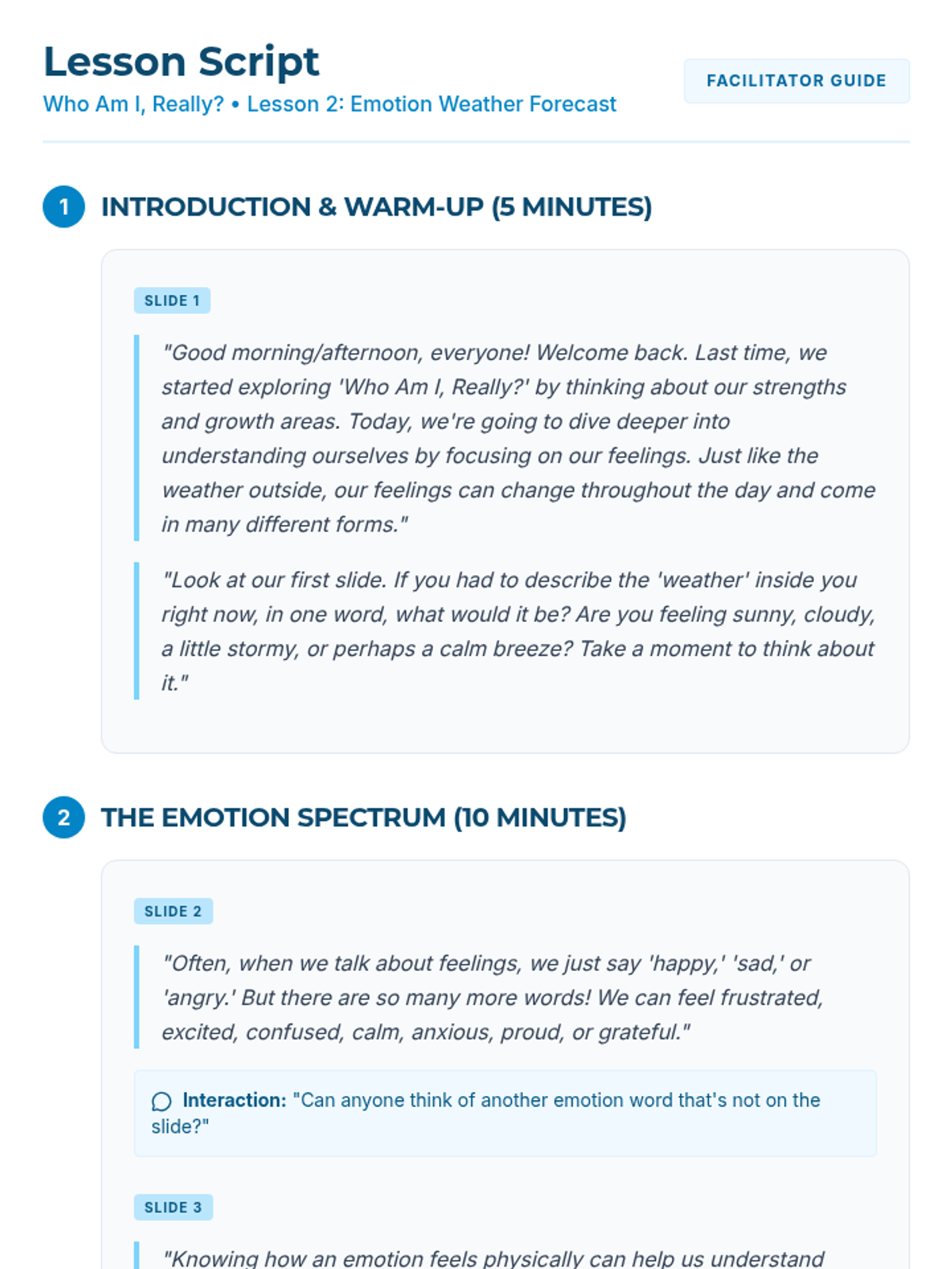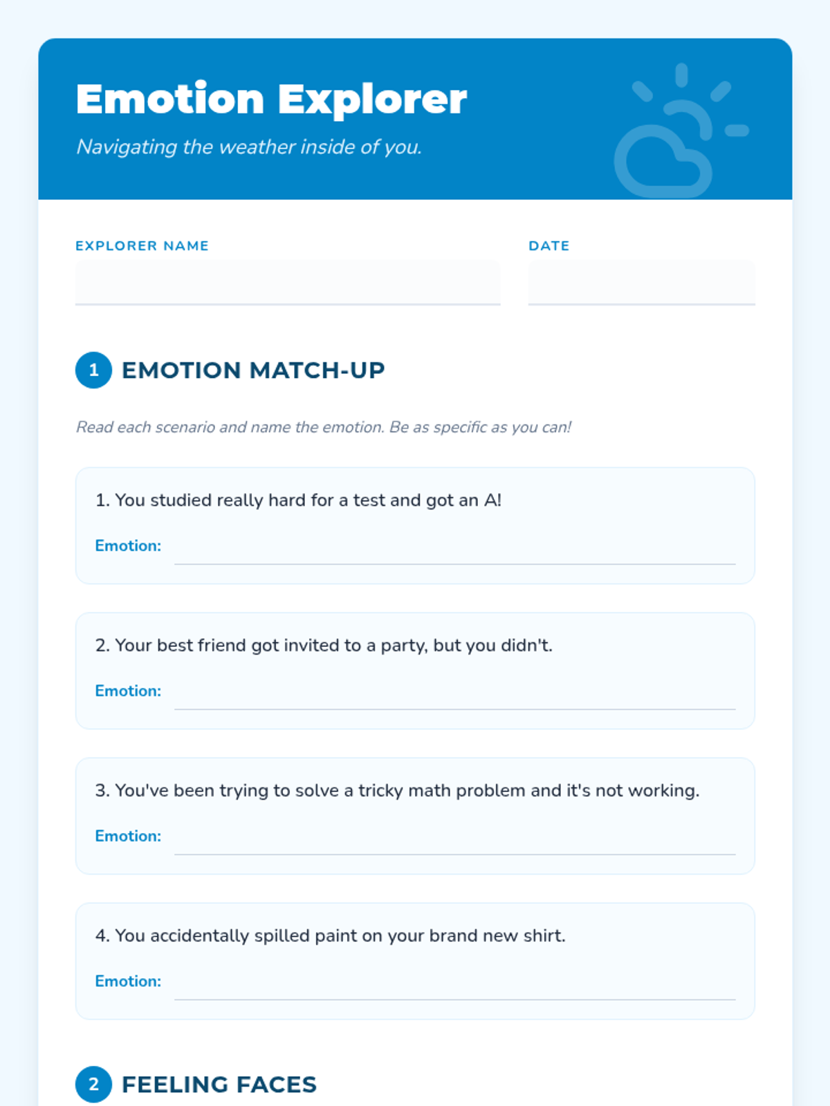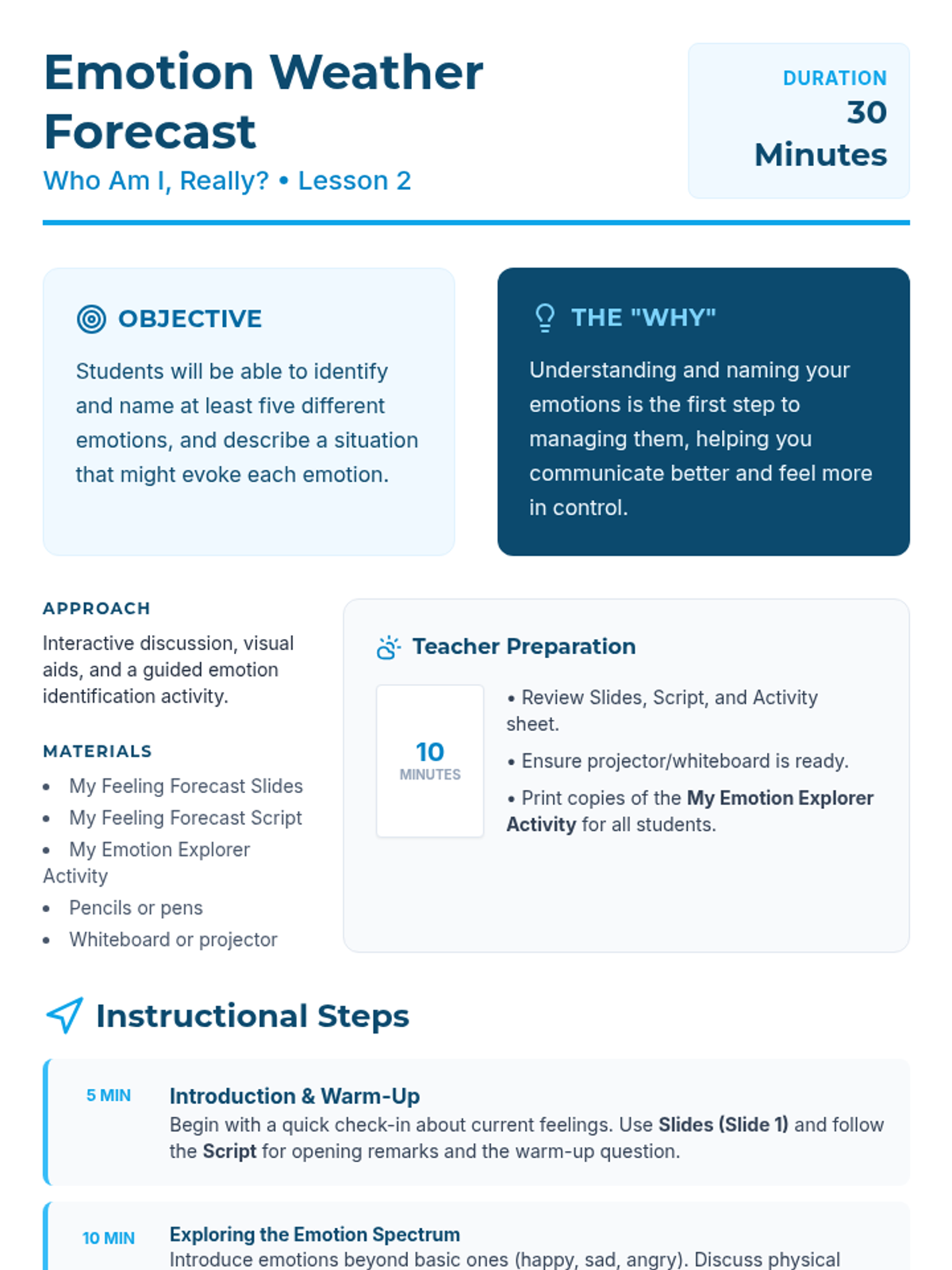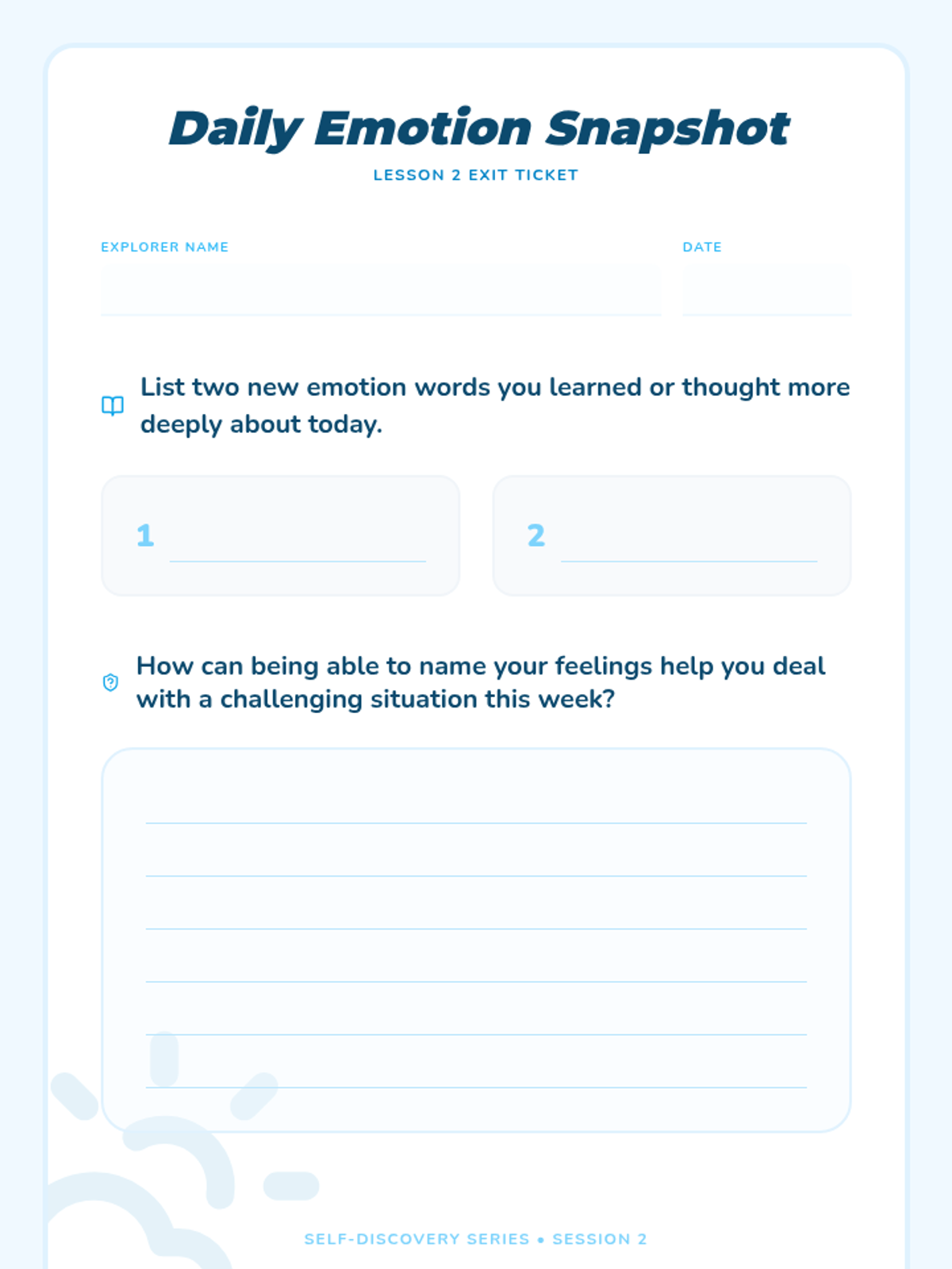 Students expand their emotional vocabulary, learn to recognize physical sensations associated with feelings, and practice naming emotions in various scenarios.