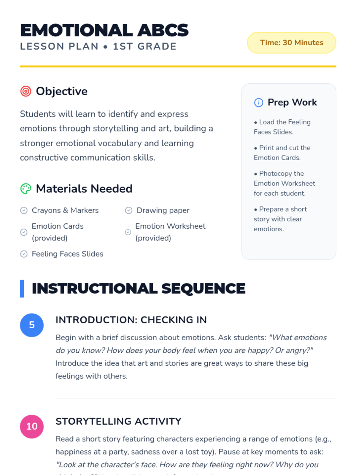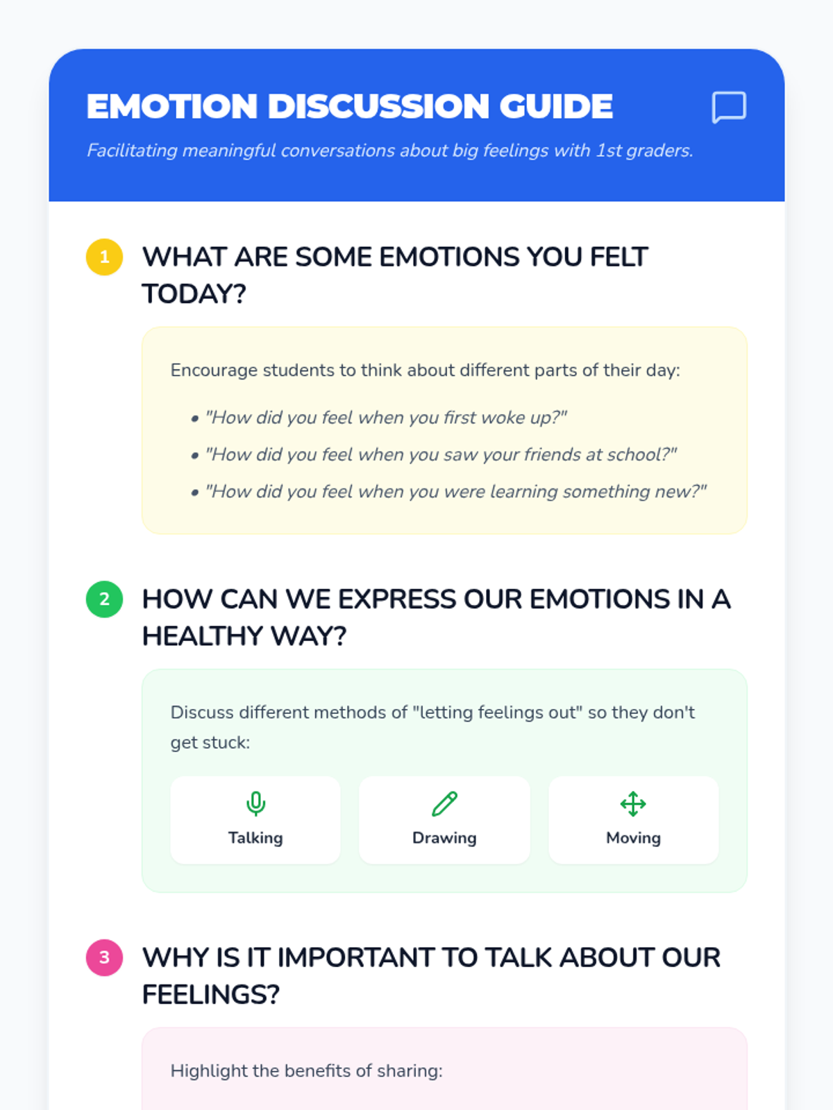 A 1st-grade lesson that helps students identify and express their emotions through storytelling, art, and discussion. Students build their emotional vocabulary and learn constructive ways to communicate their feelings.