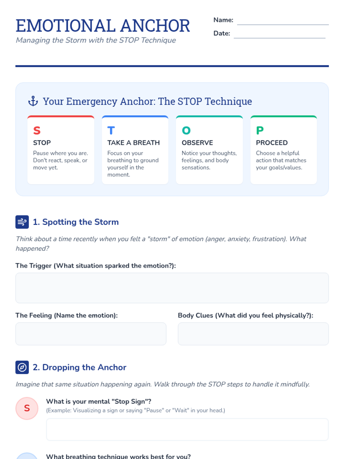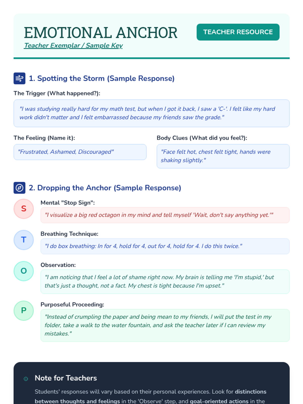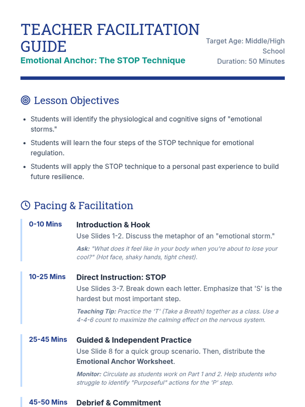 A lesson on managing difficult emotions using the CBT-based STOP technique, designed to help students pause and choose helpful responses.