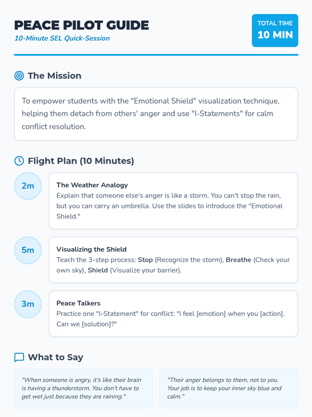 A quick, 10-minute SEL lesson focused on helping students maintain their emotional boundaries when others are angry and providing simple tools for conflict resolution.