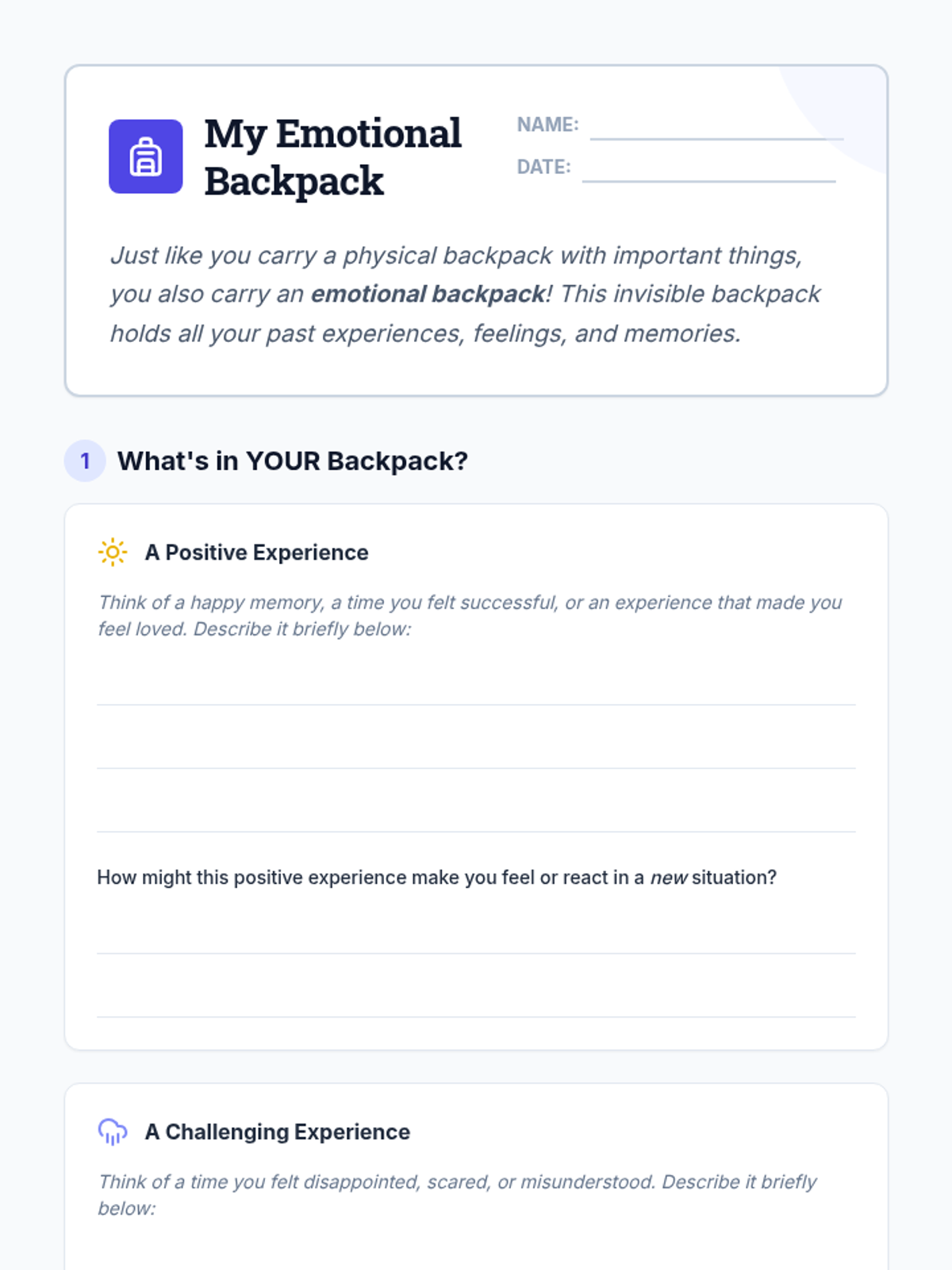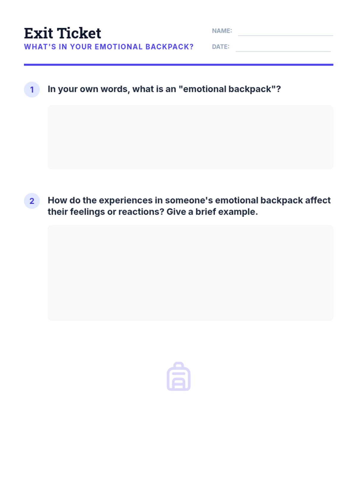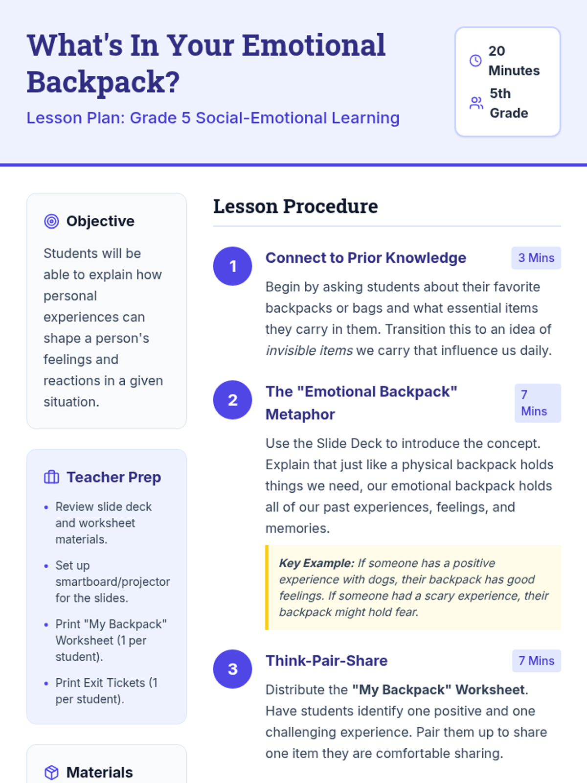 This 20-minute SEL lesson for 5th Grade students uses the metaphor of an 'emotional backpack' to help them understand how past experiences influence present reactions and to foster empathy for others.