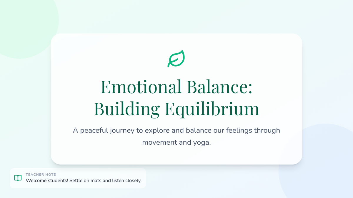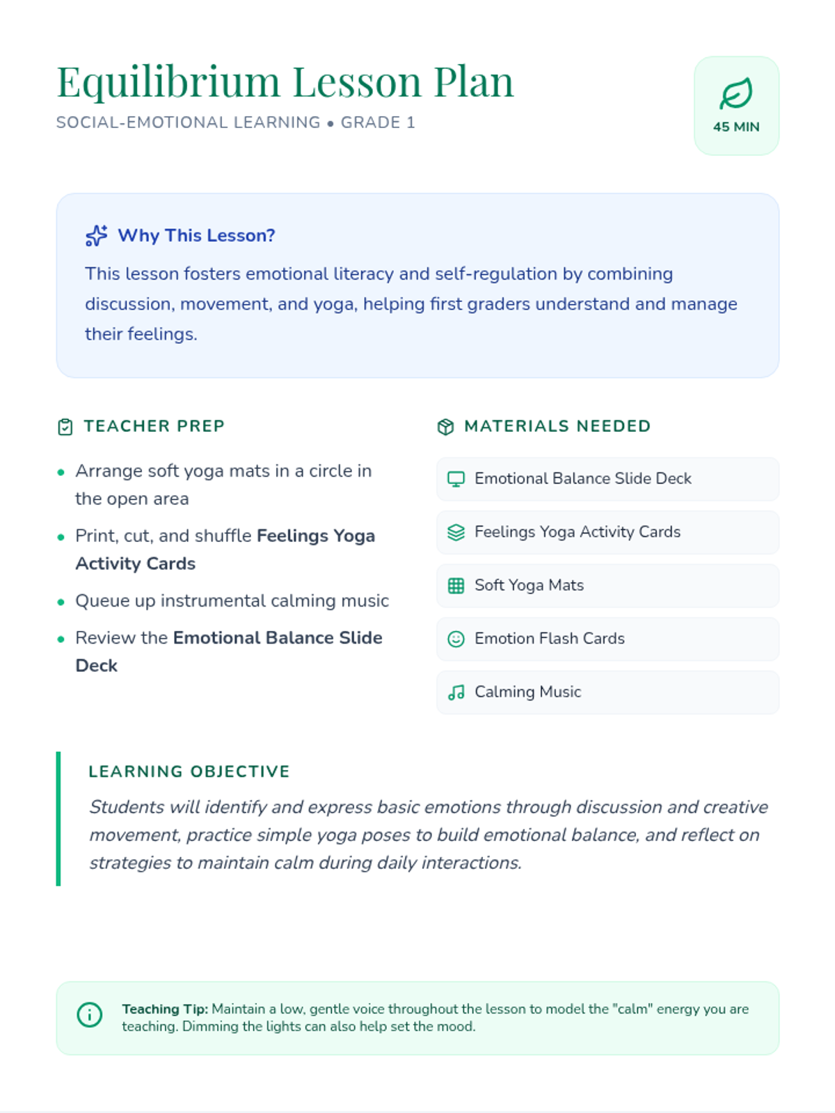 First graders will discover 'Emotional Balance: Building Equilibrium', a tranquil lesson that teaches them to identify and express their emotions through creative movement and simple yoga poses. This lesson helps young learners understand the importance of balancing their feelings and responses in their daily interactions.