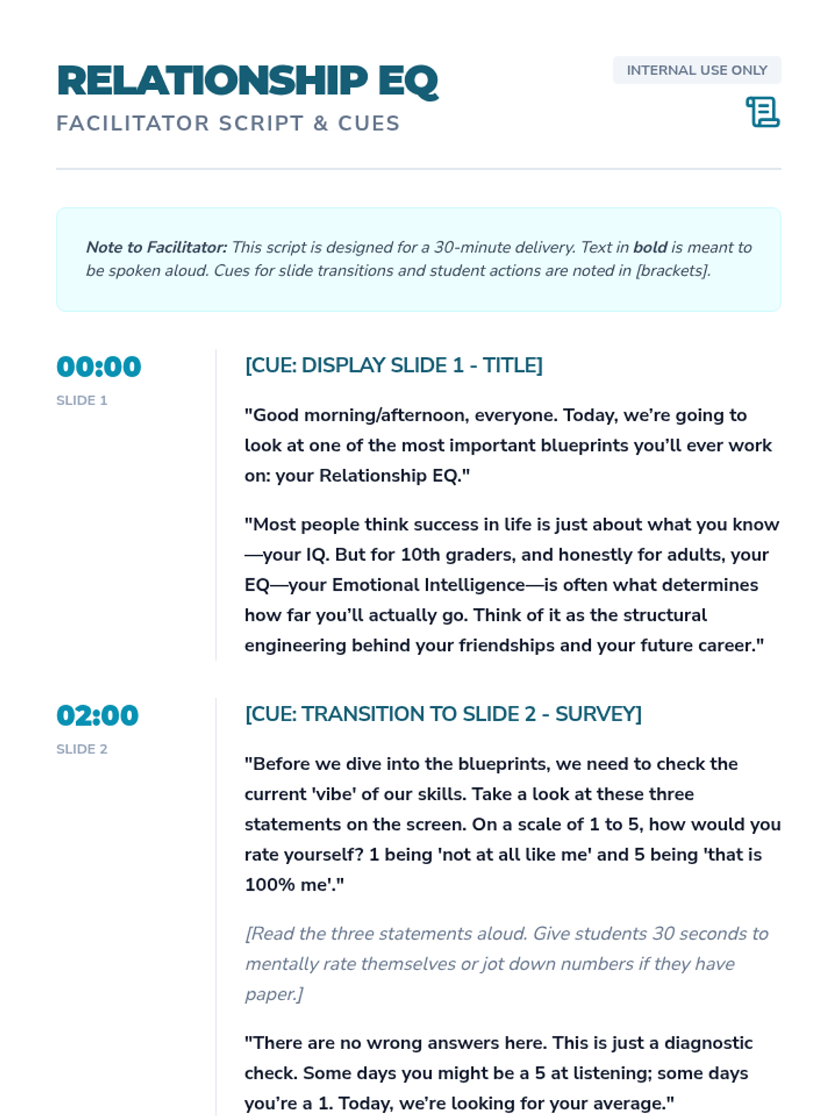 A 30-minute social-emotional learning lesson for 10th graders focused on assessing interpersonal skills and setting actionable growth goals. Students explore the components of emotional intelligence through a blueprint-themed instructional arc.