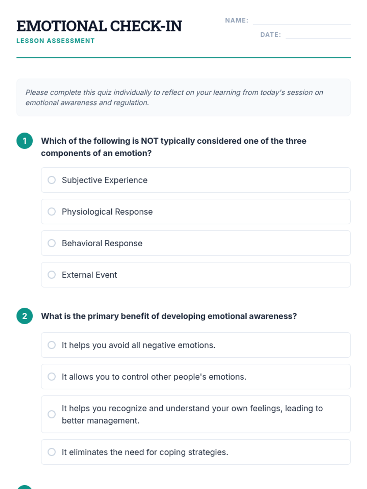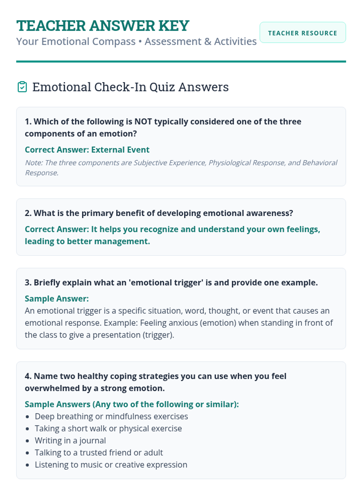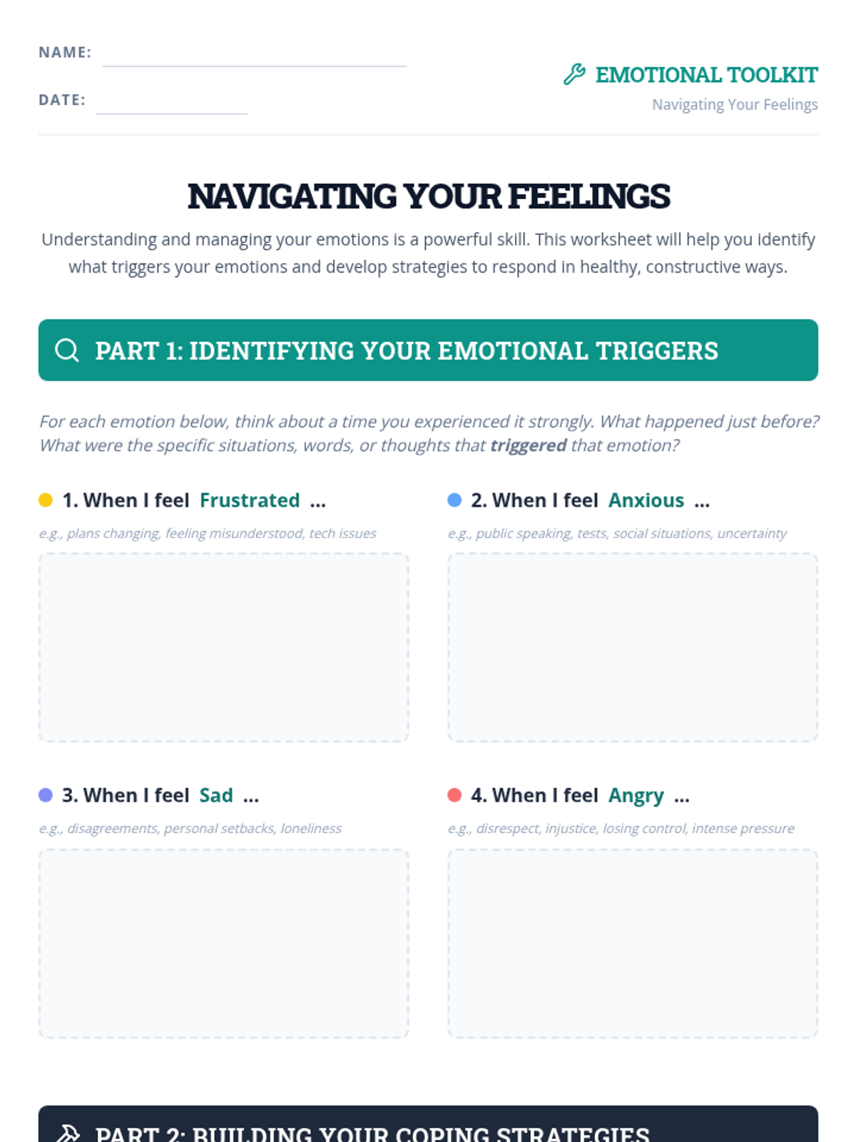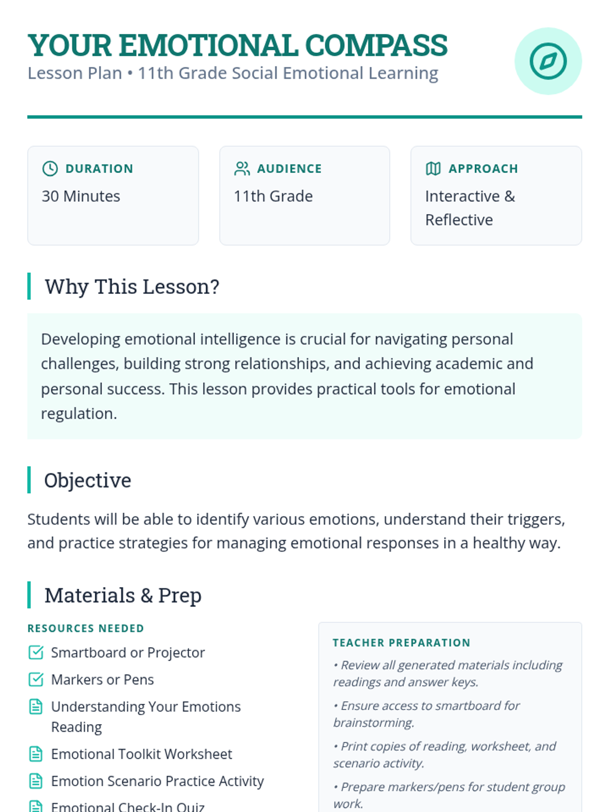 A comprehensive lesson designed for 11th-grade students to develop emotional intelligence by identifying emotions, understanding triggers, and practicing healthy coping strategies.