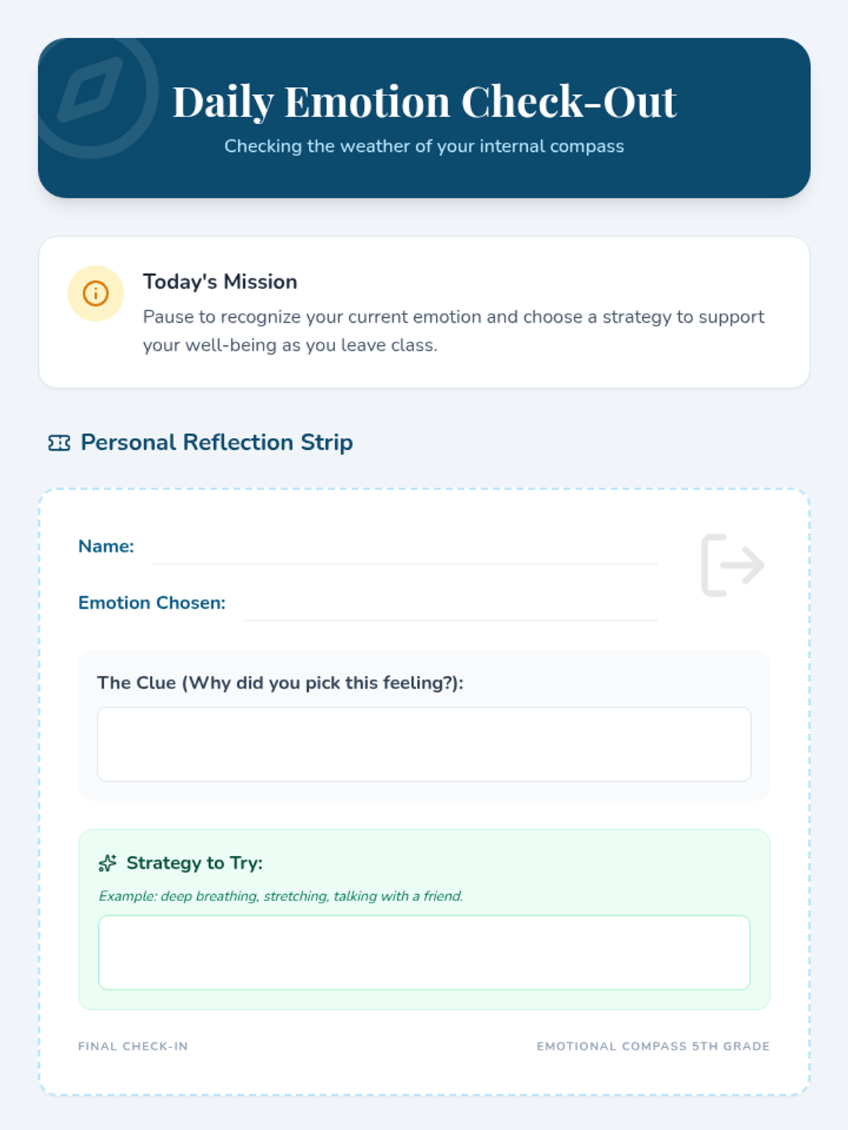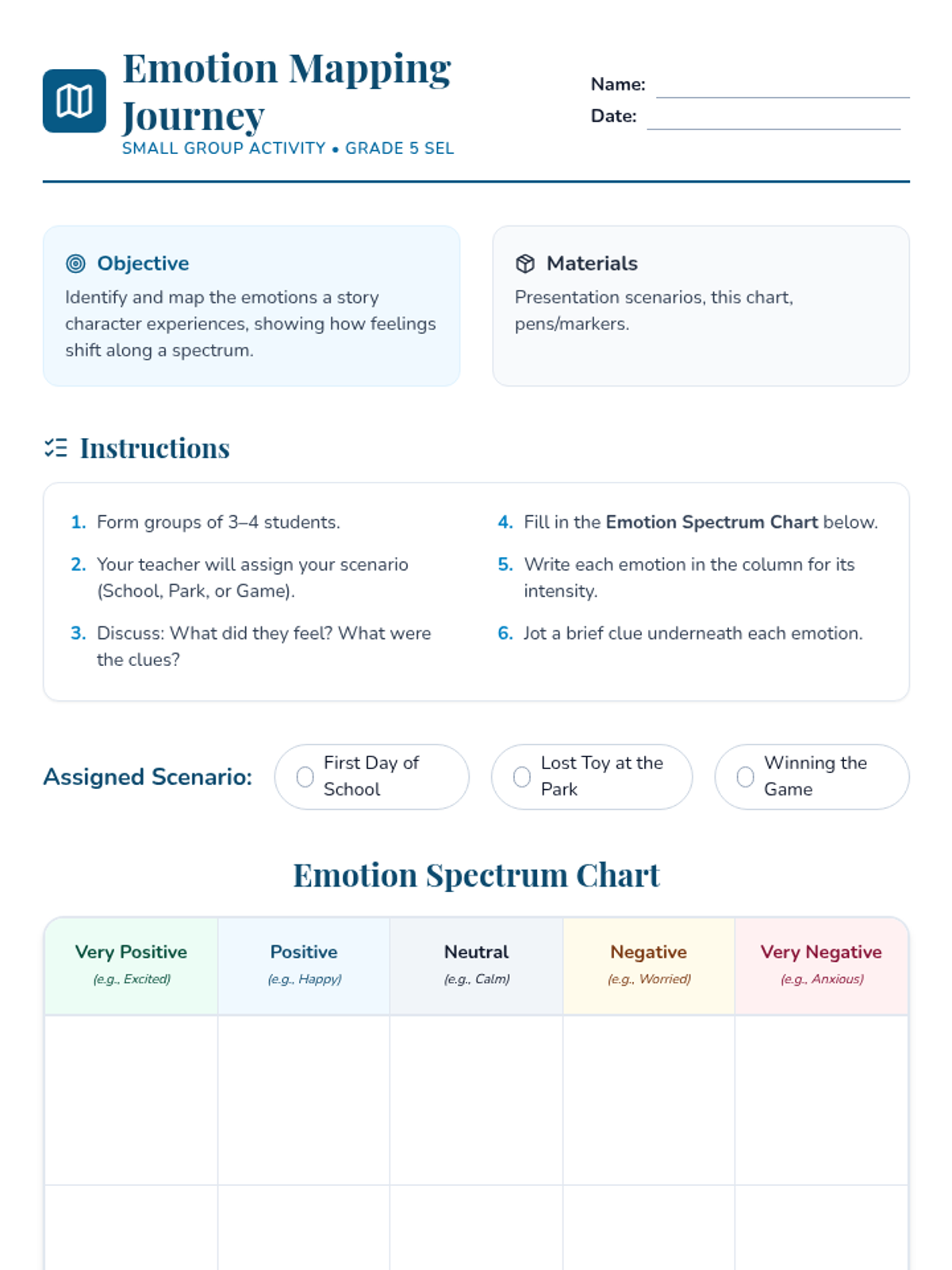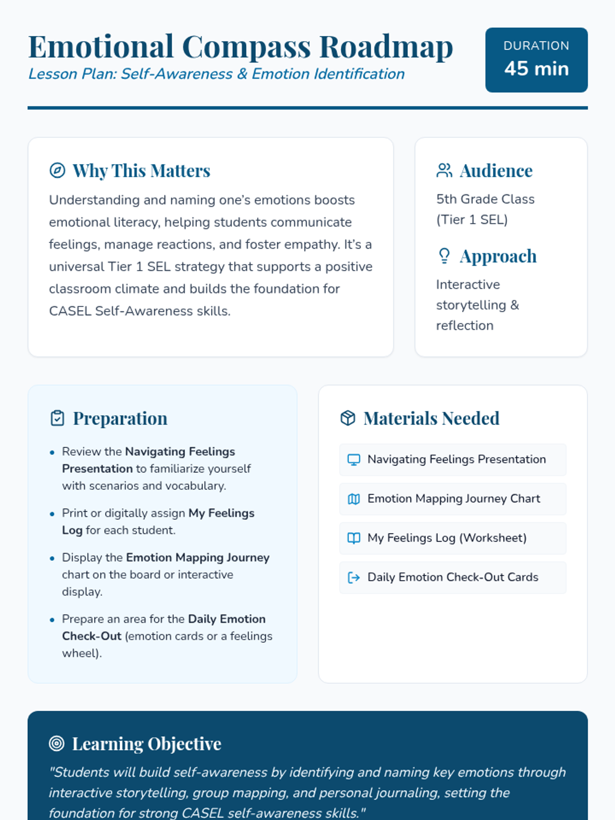 A whole-class exploration of self-awareness through interactive storytelling and reflection, helping 5th-grade students recognize and name emotions using the CASEL framework.