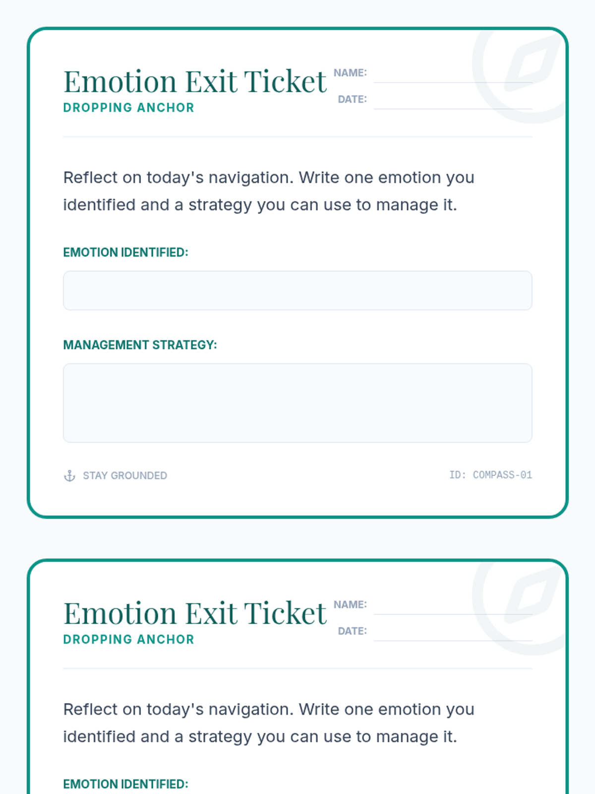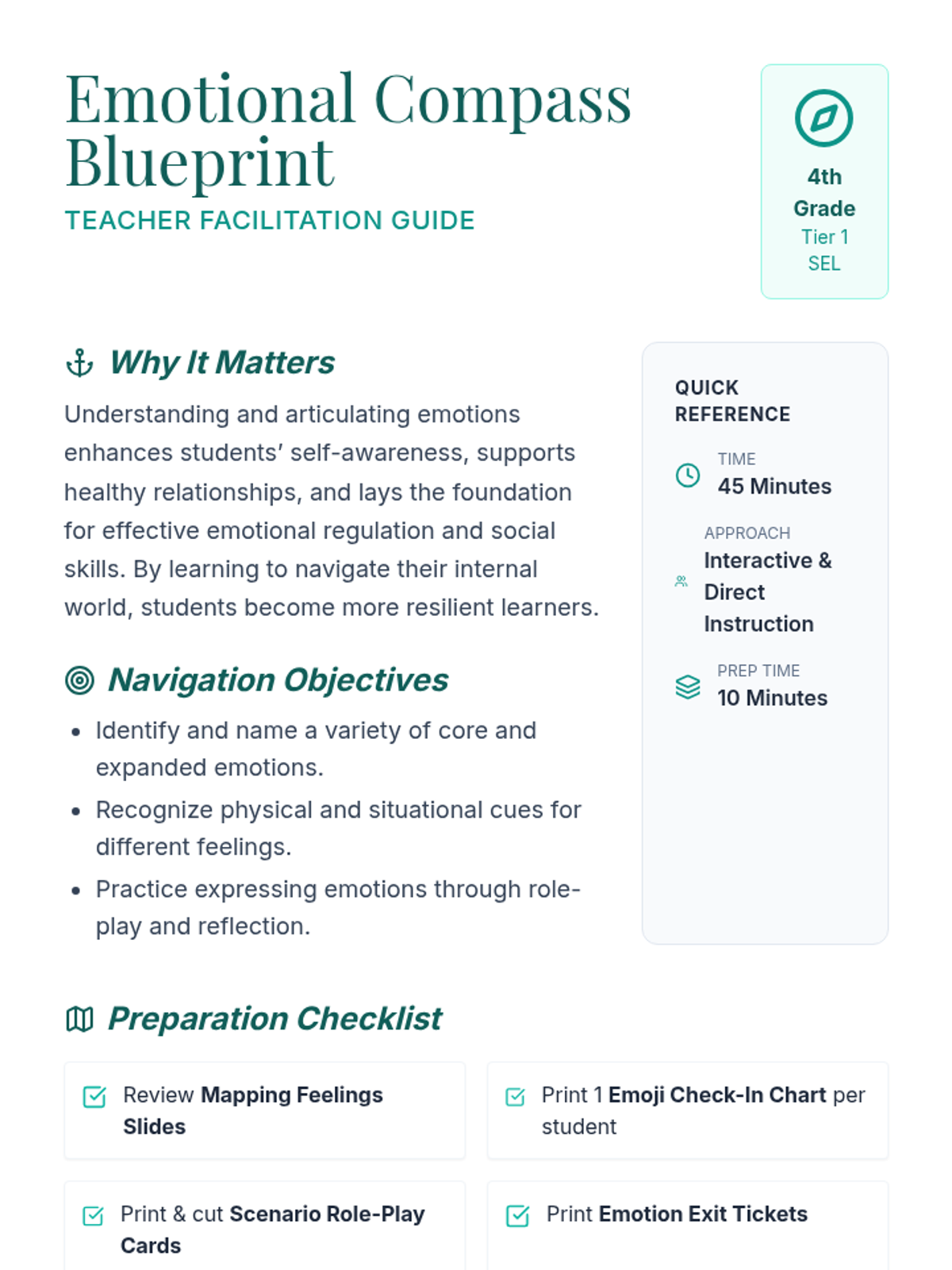 An introductory lesson for 4th graders to identify and name emotions using an 'emotional compass' metaphor, featuring real-life scenarios and self-awareness activities.