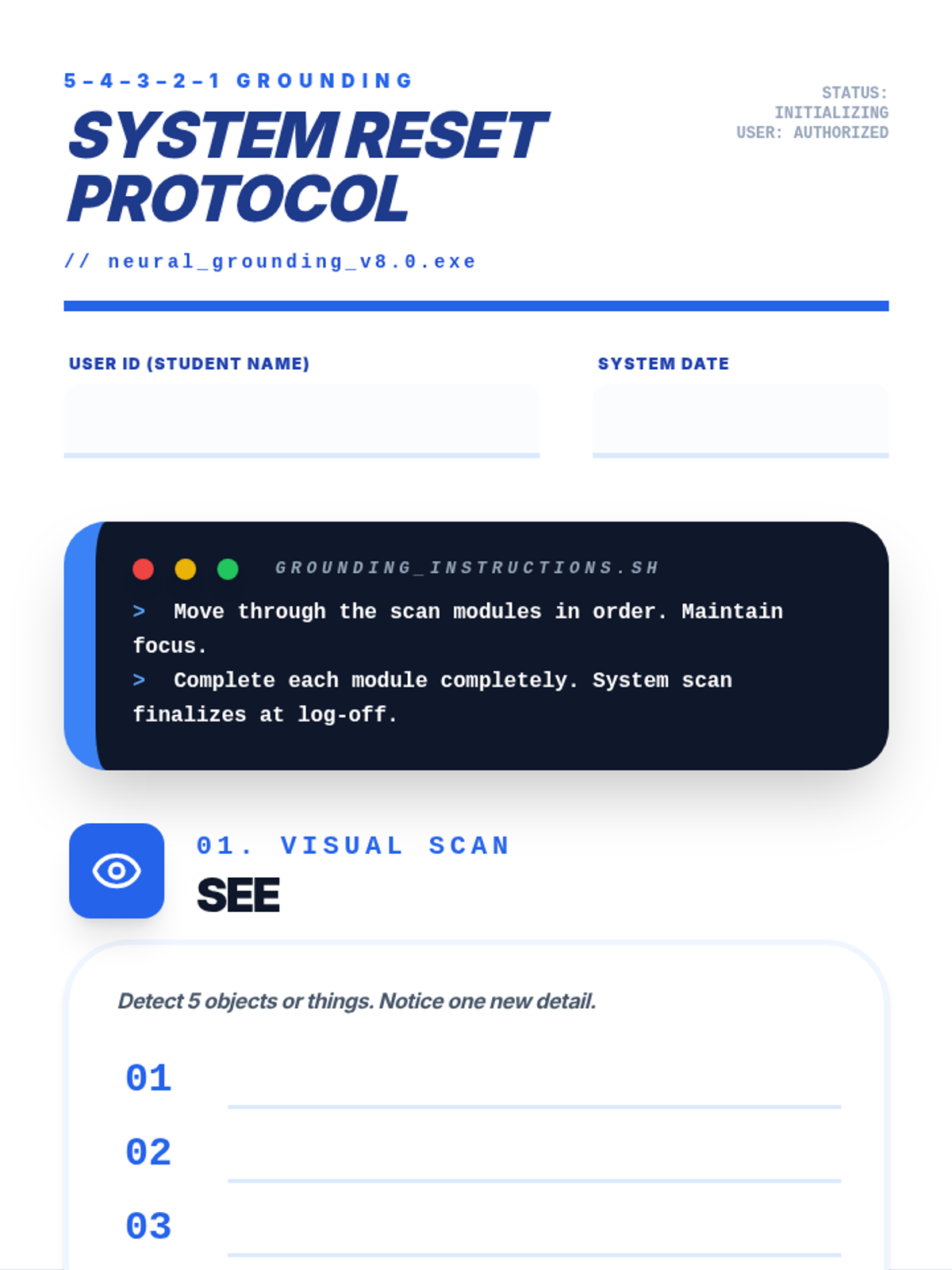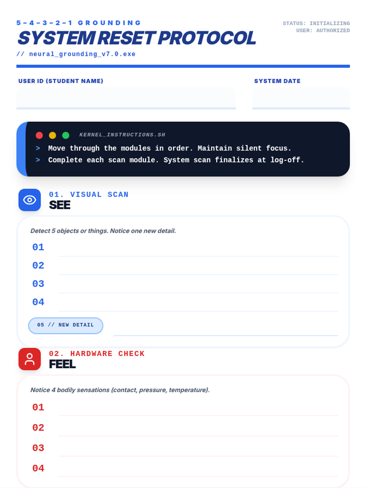 A lesson teaching students how to use the 5-4-3-2-1 grounding technique to manage stress and anxiety, framed through a technical 'system reset' metaphor. Students learn to recognize the 'spinning' state of anxiety and intercept it using sensory inputs.