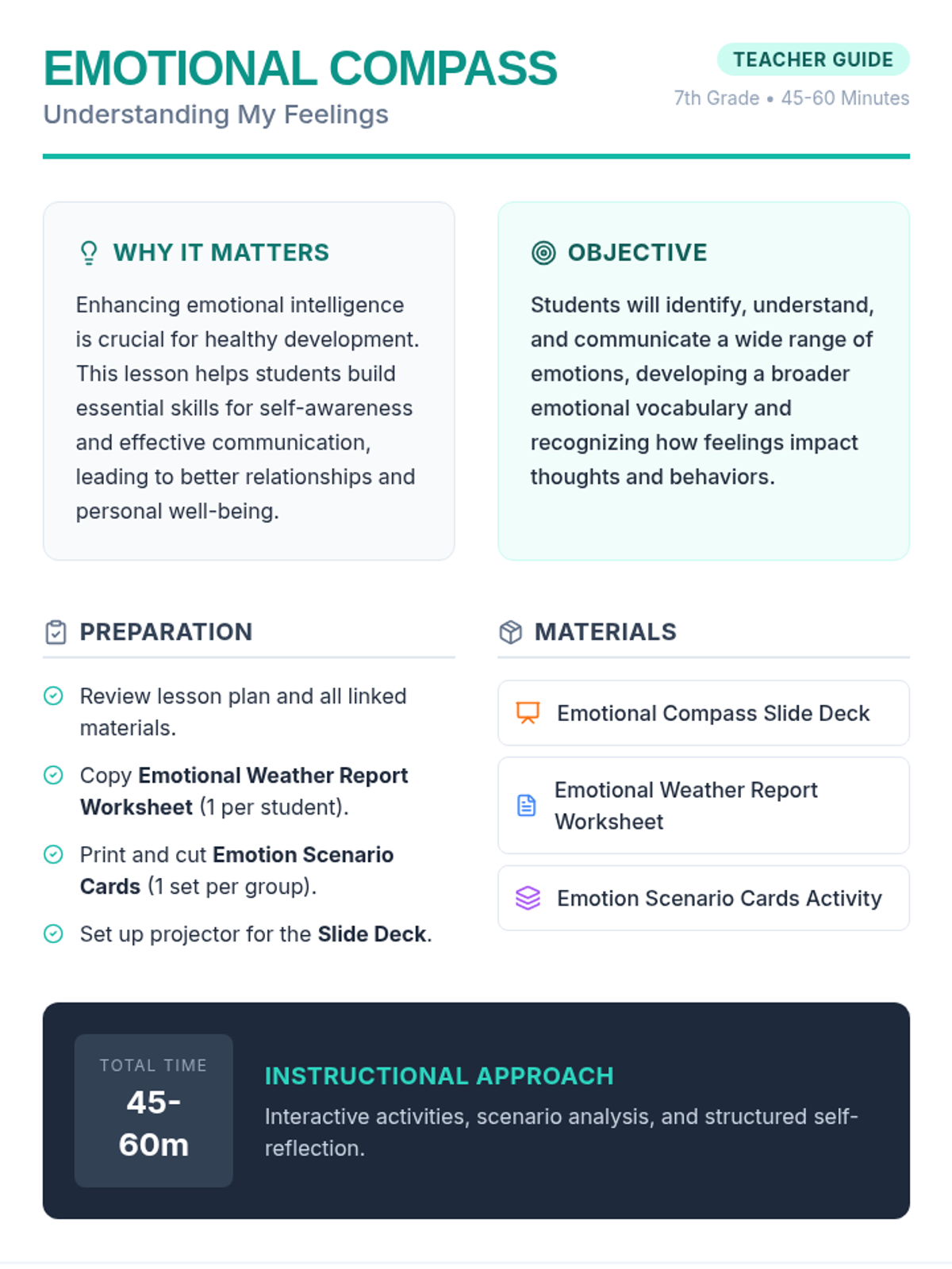 A comprehensive 45-60 minute lesson for 7th graders designed to expand emotional vocabulary and improve self-awareness through the metaphor of an internal emotional compass.