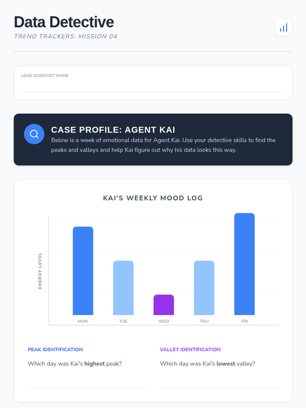 Students analyze mock data to identify emotional patterns, learning how to use graphs and charts to understand their own long-term well-being.