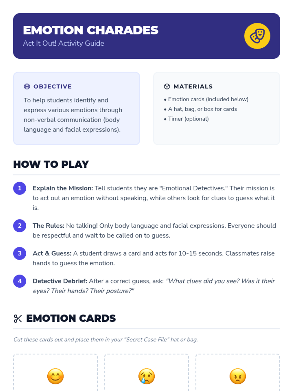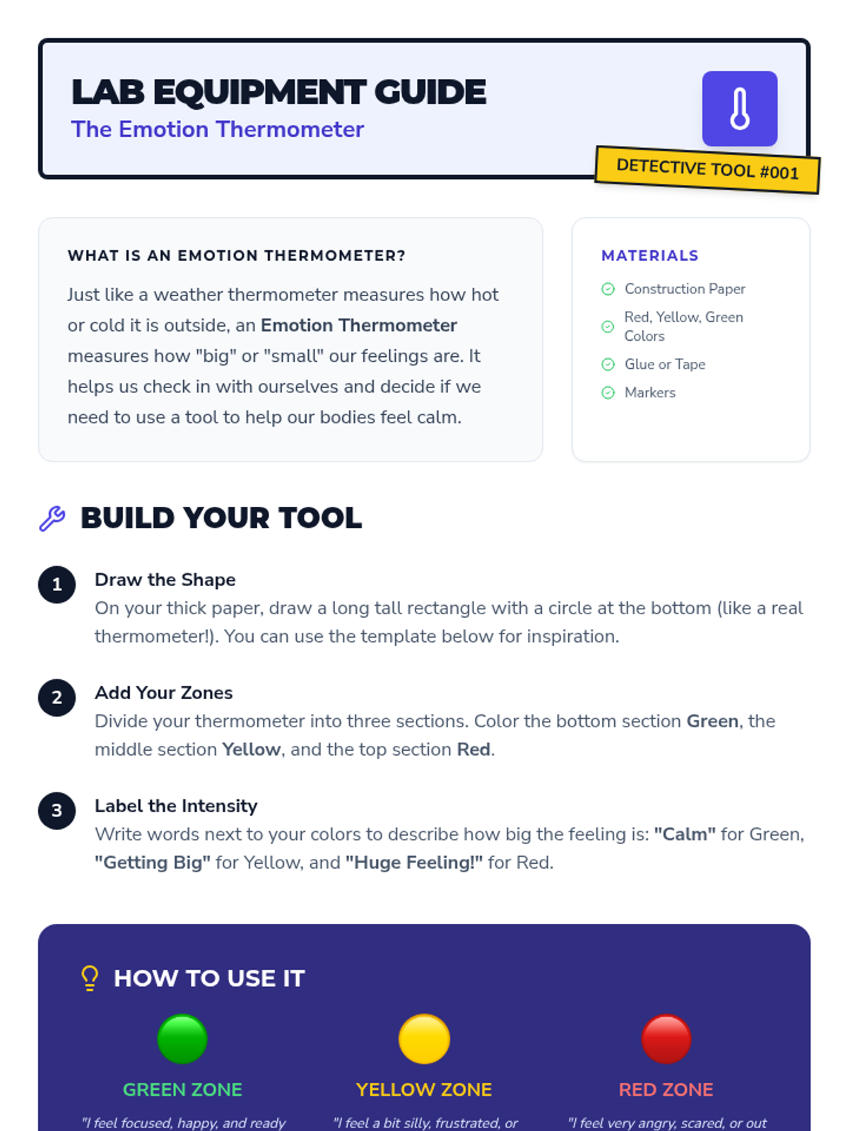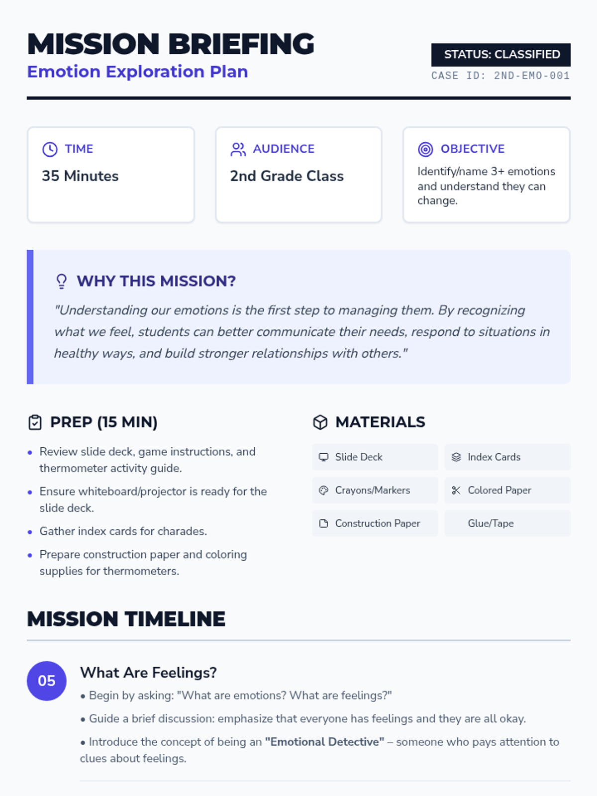 A 35-minute lesson for 2nd graders to identify, name, and understand the intensity of their emotions using a detective theme.