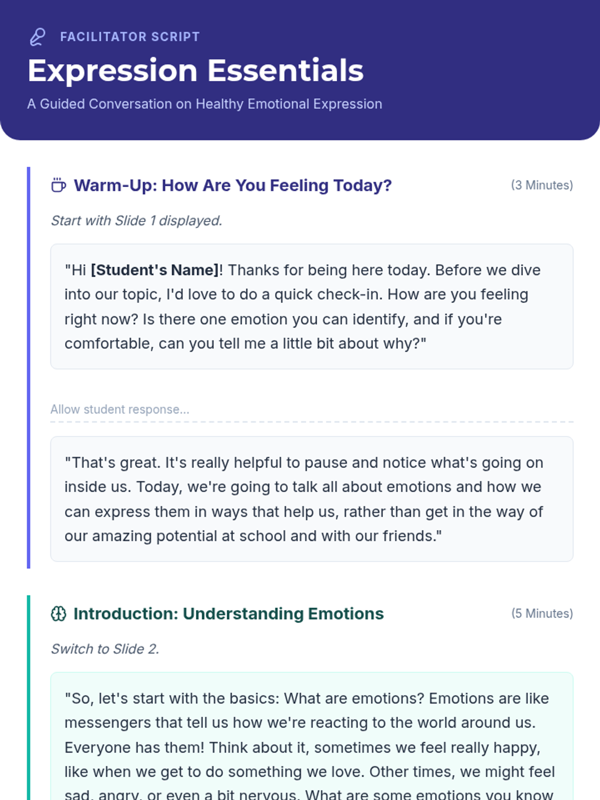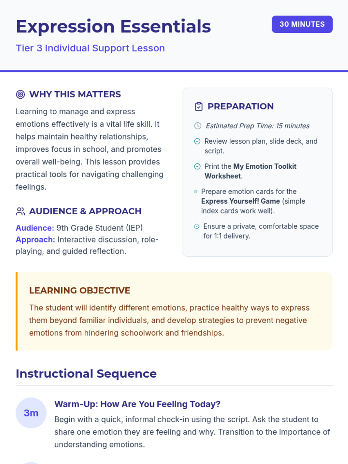 A 30-minute Tier 3 lesson for a 9th-grade student with an IEP, focusing on identifying emotions, developing a coping toolkit, and practicing healthy expression to maintain academic and social success.