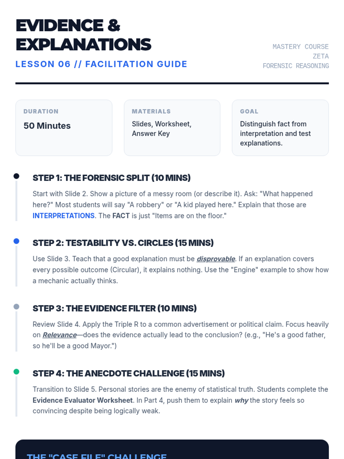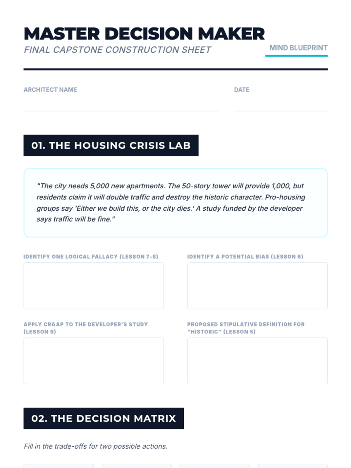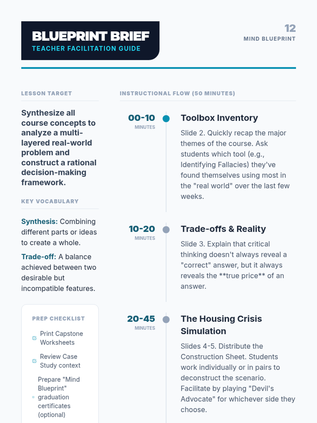 A comprehensive review of the course concepts applied to complex logic problems. Includes the course Posttest.