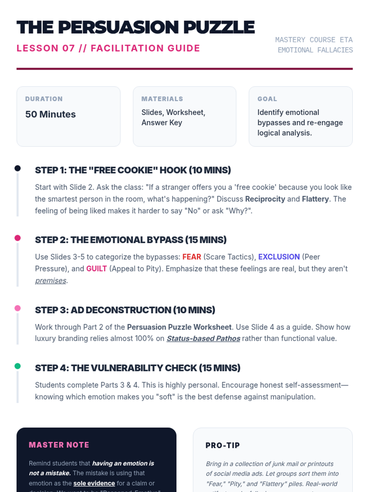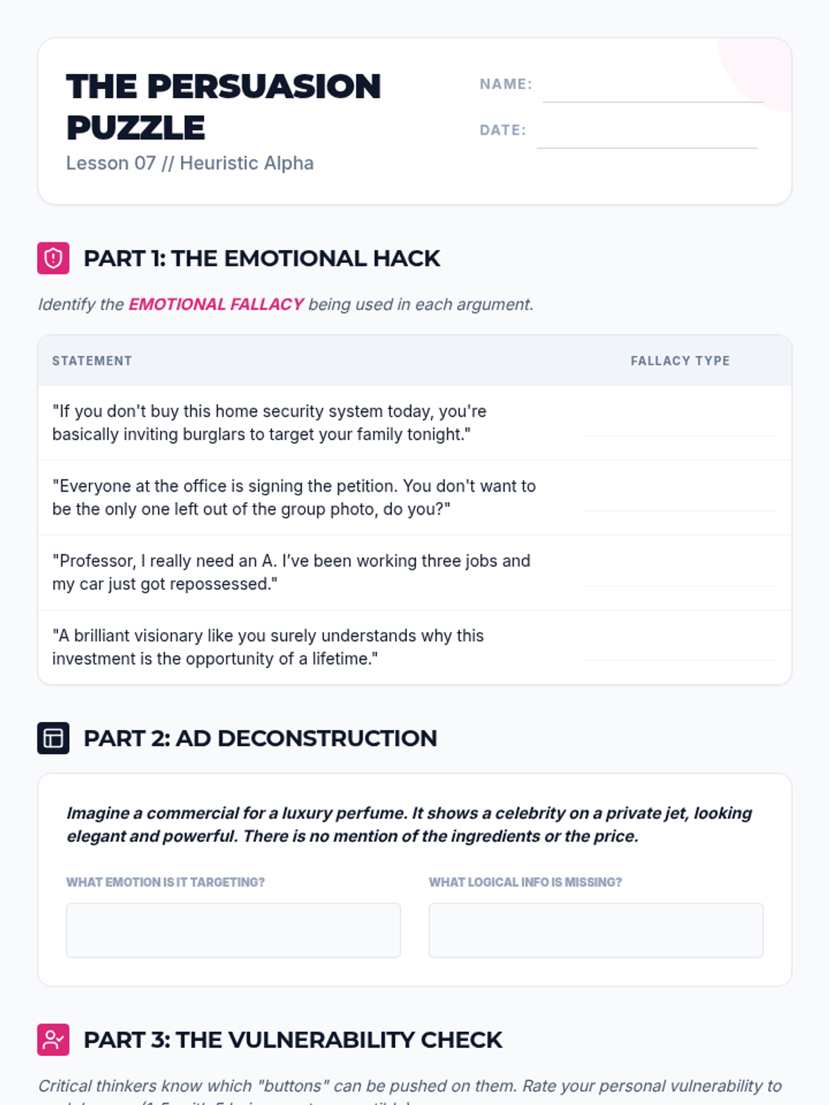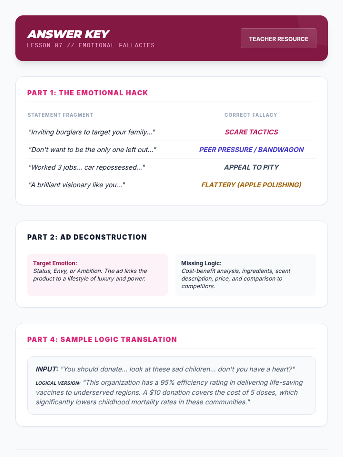 Identifying fallacies that bypass logic to target emotions: scare tactics, flattery, peer pressure, and appeals to pity.