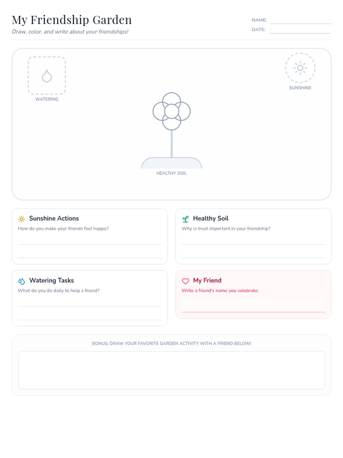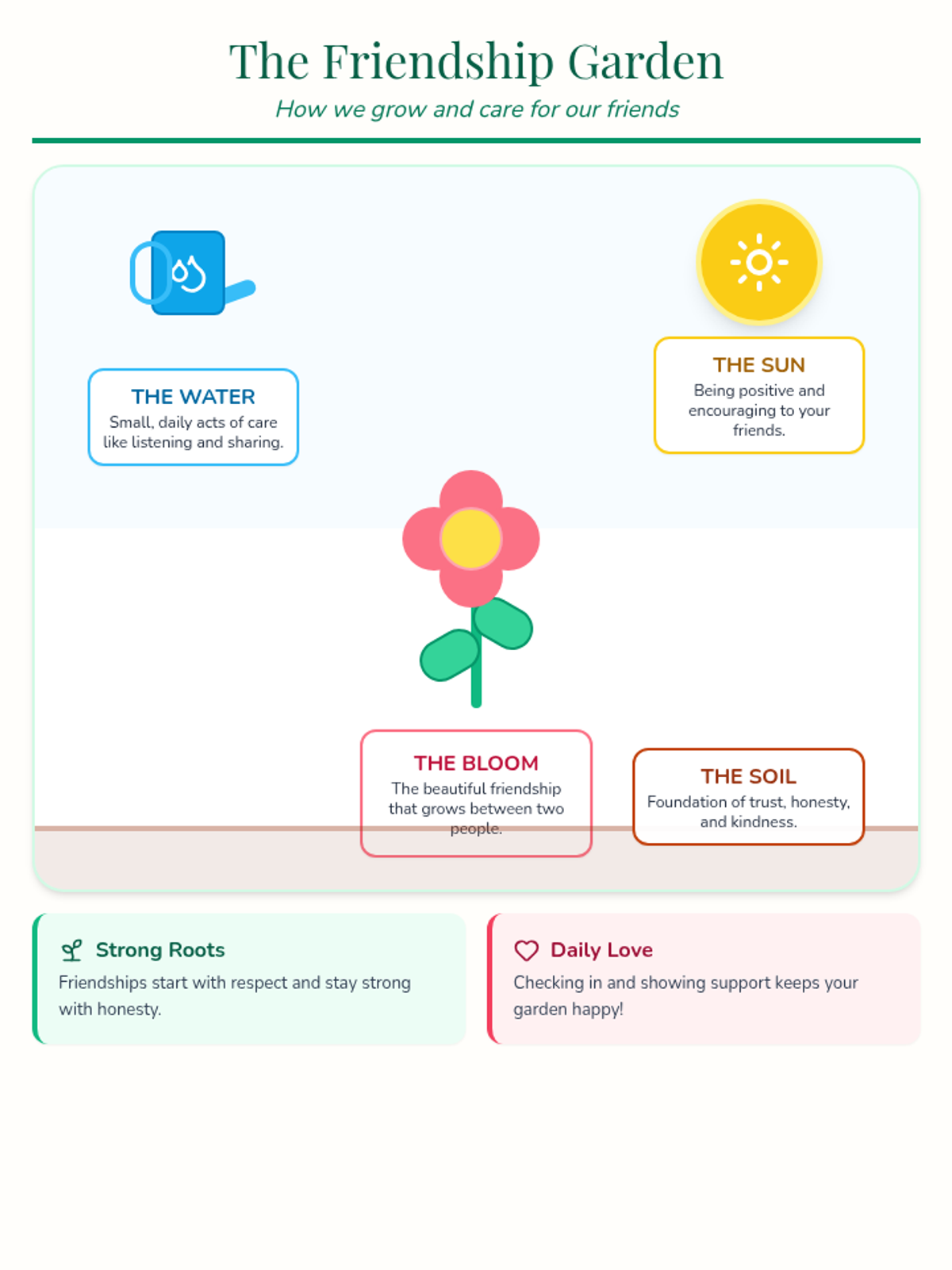 A lesson exploring the metaphor of a garden to understand how to build and maintain healthy friendships through kindness, support, and care.