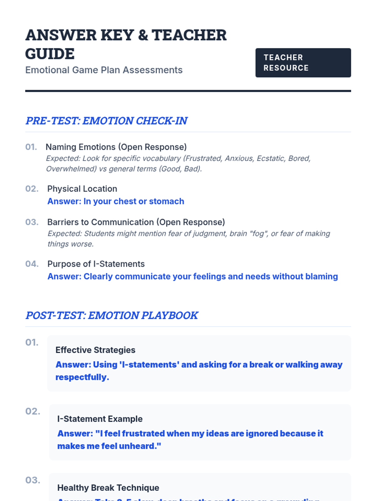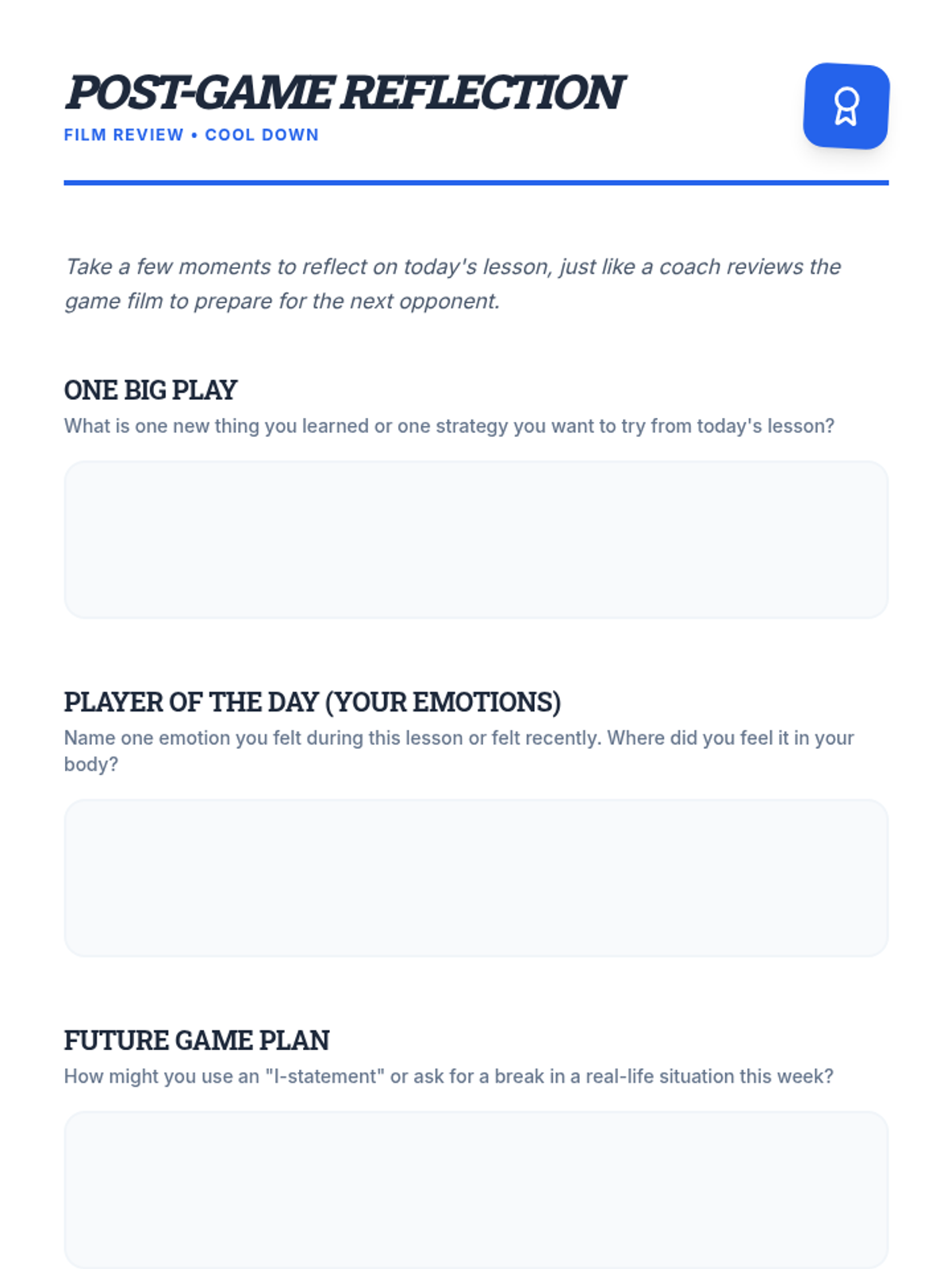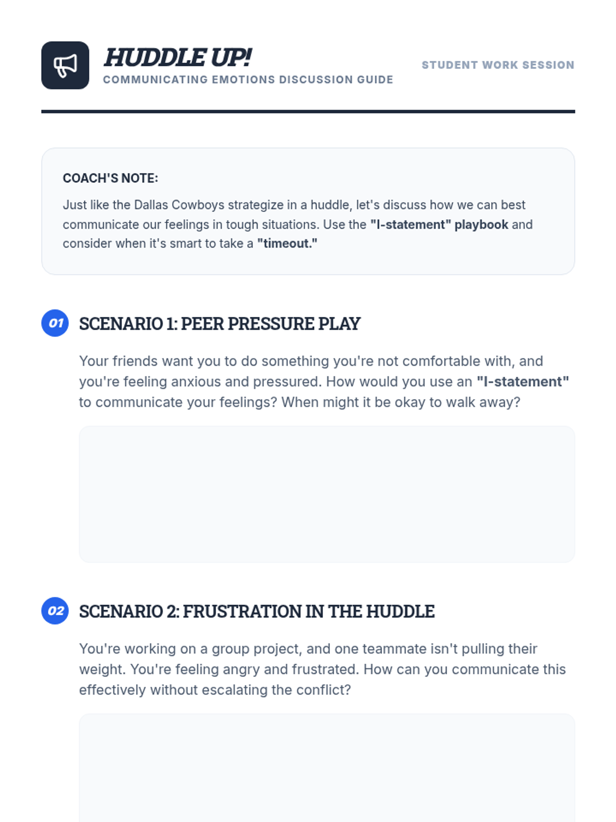This 45-minute lesson for 9th graders uses a sports "game plan" theme to teach students how to name emotions, recognize physical sensations, and use I-statements for effective communication during high-stress situations.