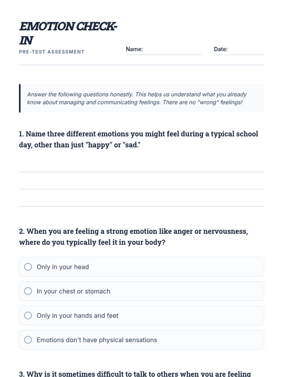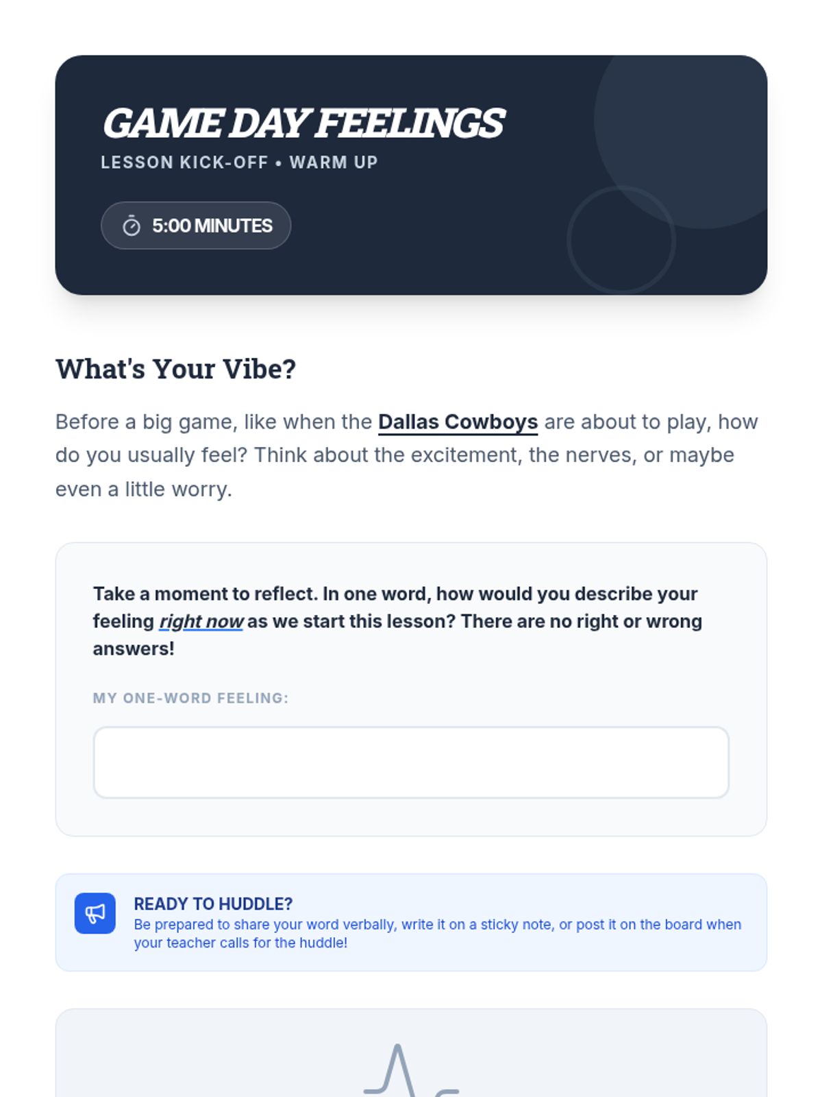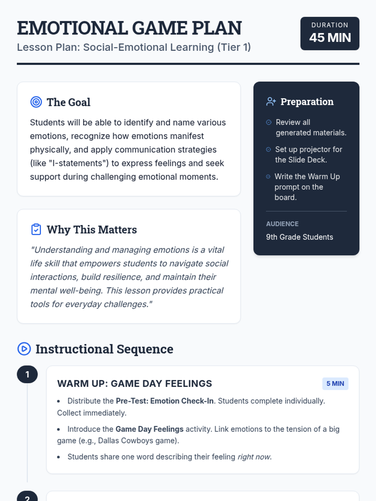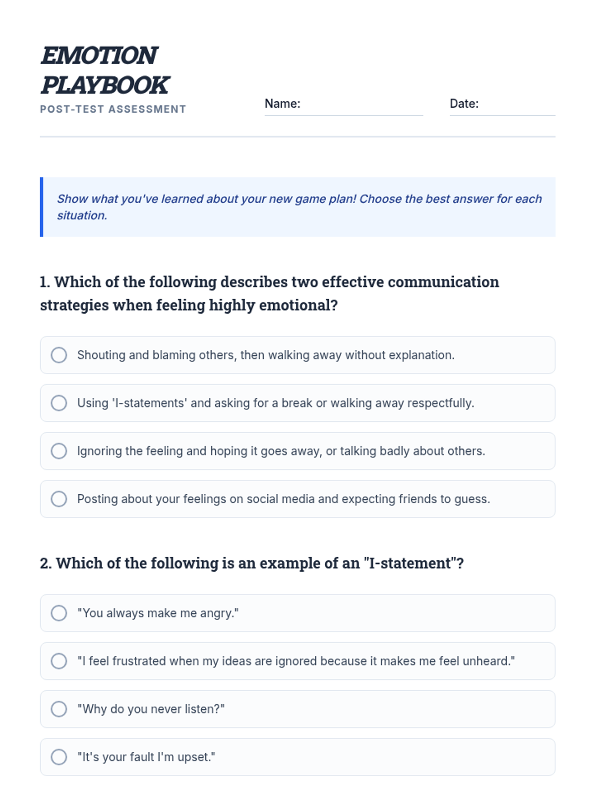 This 45-minute lesson for 9th graders uses a sports "game plan" theme to teach students how to name emotions, recognize physical sensations, and use I-statements for effective communication during high-stress situations.