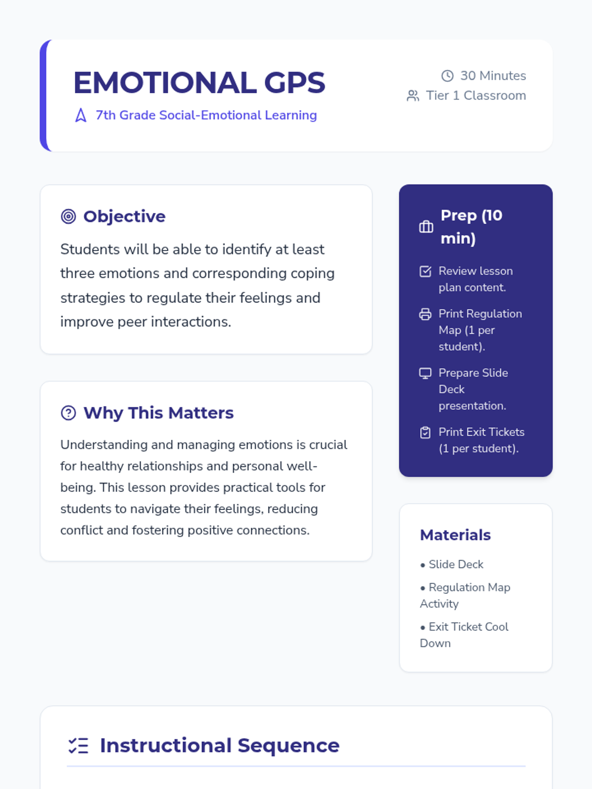 This lesson helps 7th-grade students develop stronger self-regulation skills and improve their interactions with peers. Students will learn to identify and manage their emotions in a healthy way, leading to more positive social experiences.