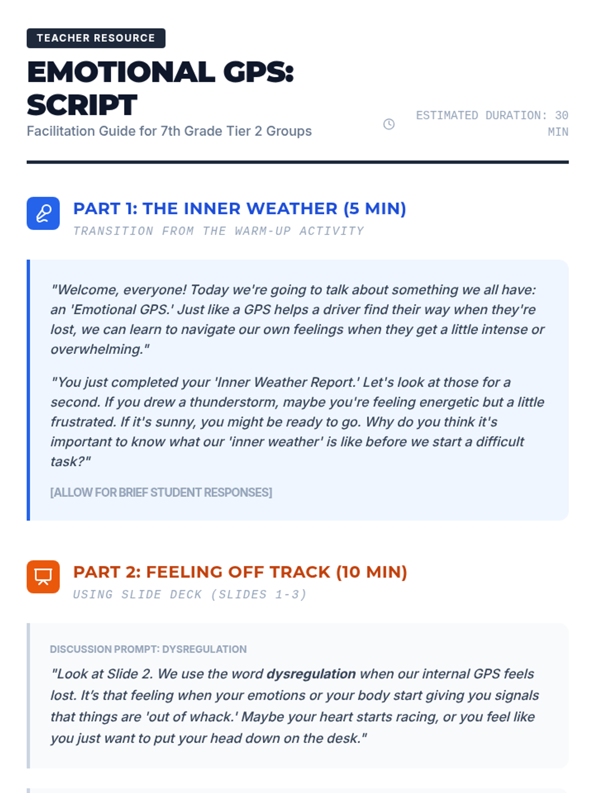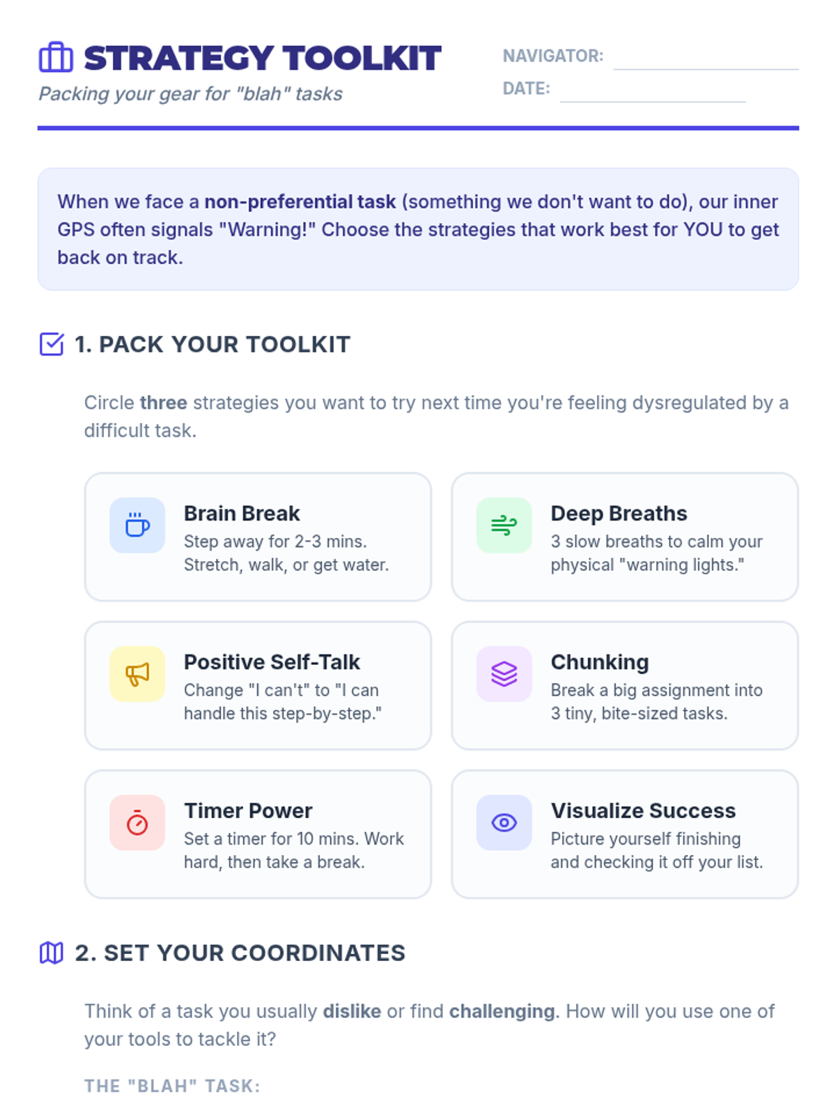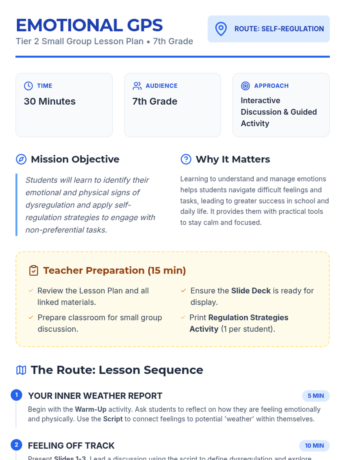 A 30-minute Tier 2 small group lesson for 7th graders to help them identify signs of emotional dysregulation and use regulation strategies to tackle non-preferential tasks.