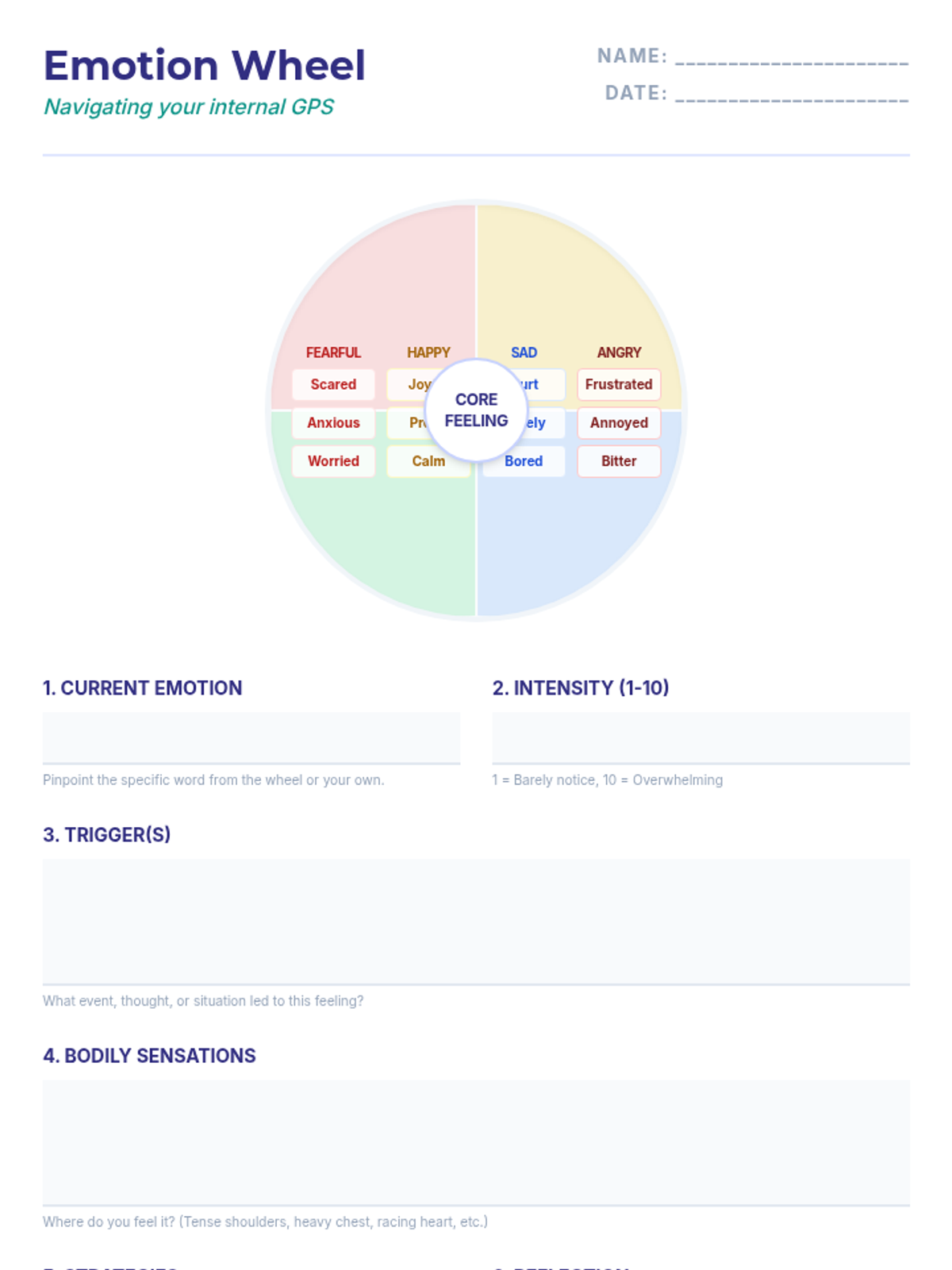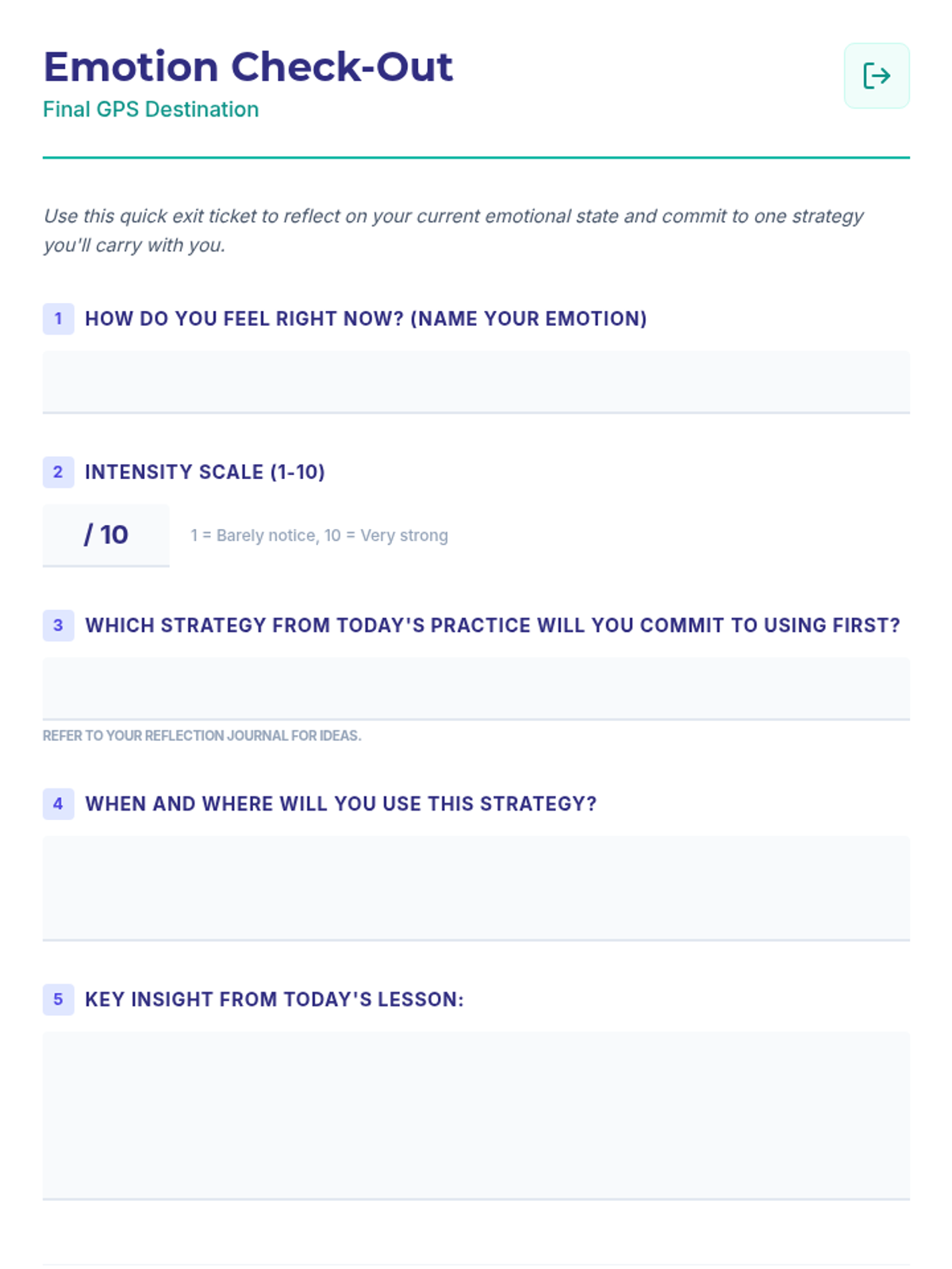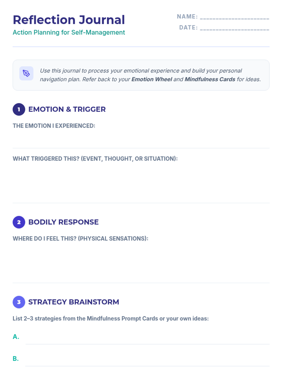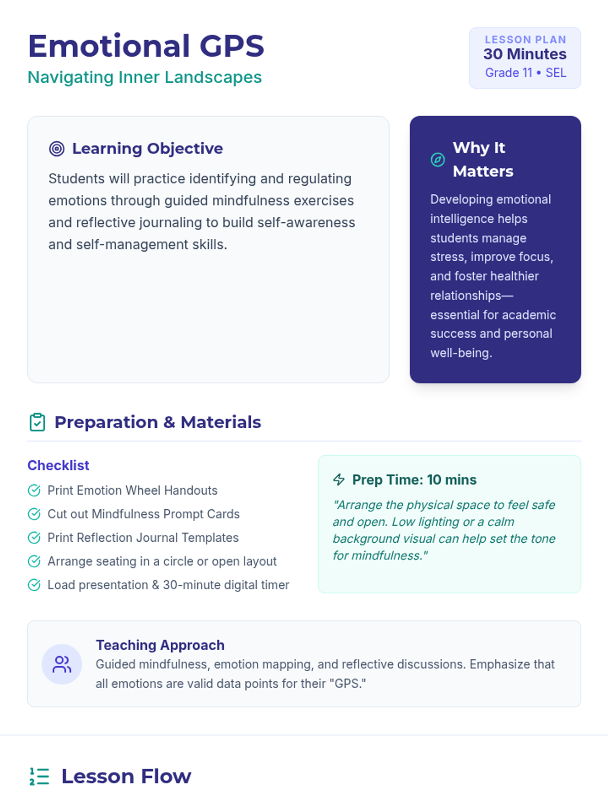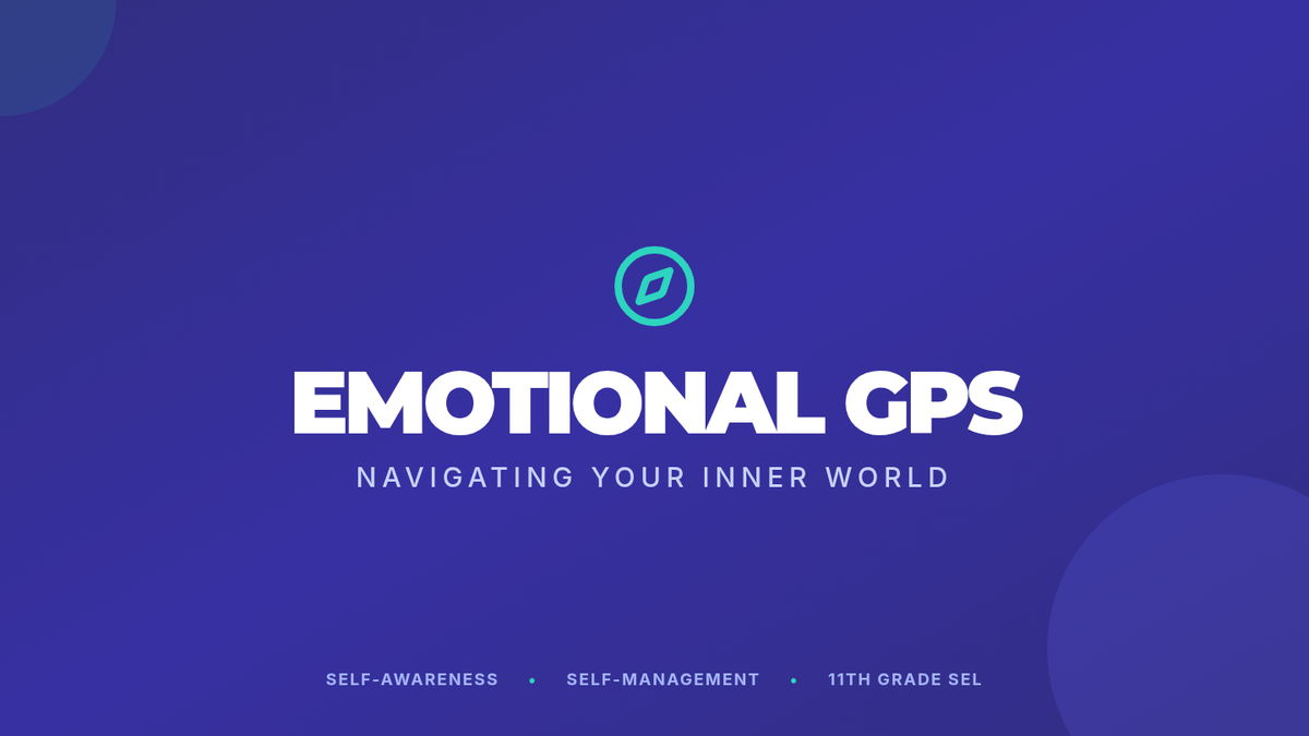 A 30-minute Social-Emotional Learning (SEL) lesson for 11th graders focused on identifying and regulating emotions using the 'Emotional GPS' framework. Students engage in mindfulness, emotion mapping with a visual wheel, and reflective journaling to build self-awareness and self-management.