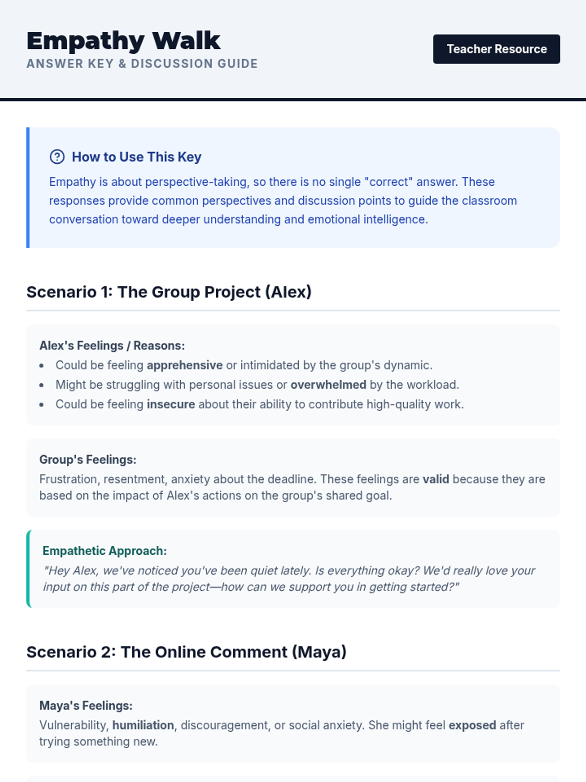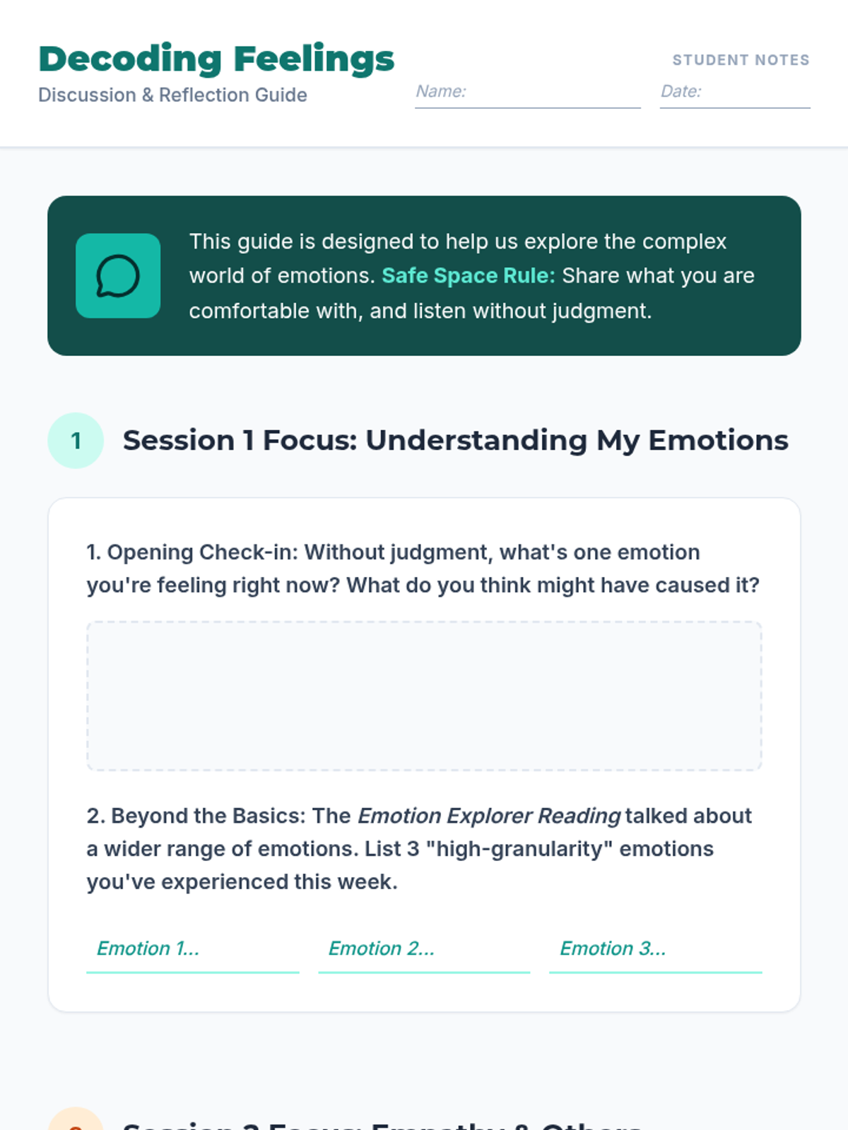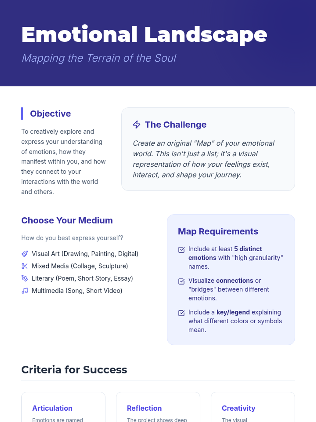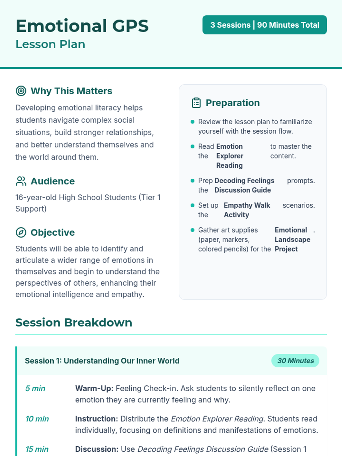 A three-session lesson helping 16-year-old students explore, identify, and articulate their emotions while fostering empathy for their peers through discussion, reading, and a creative mapping project.