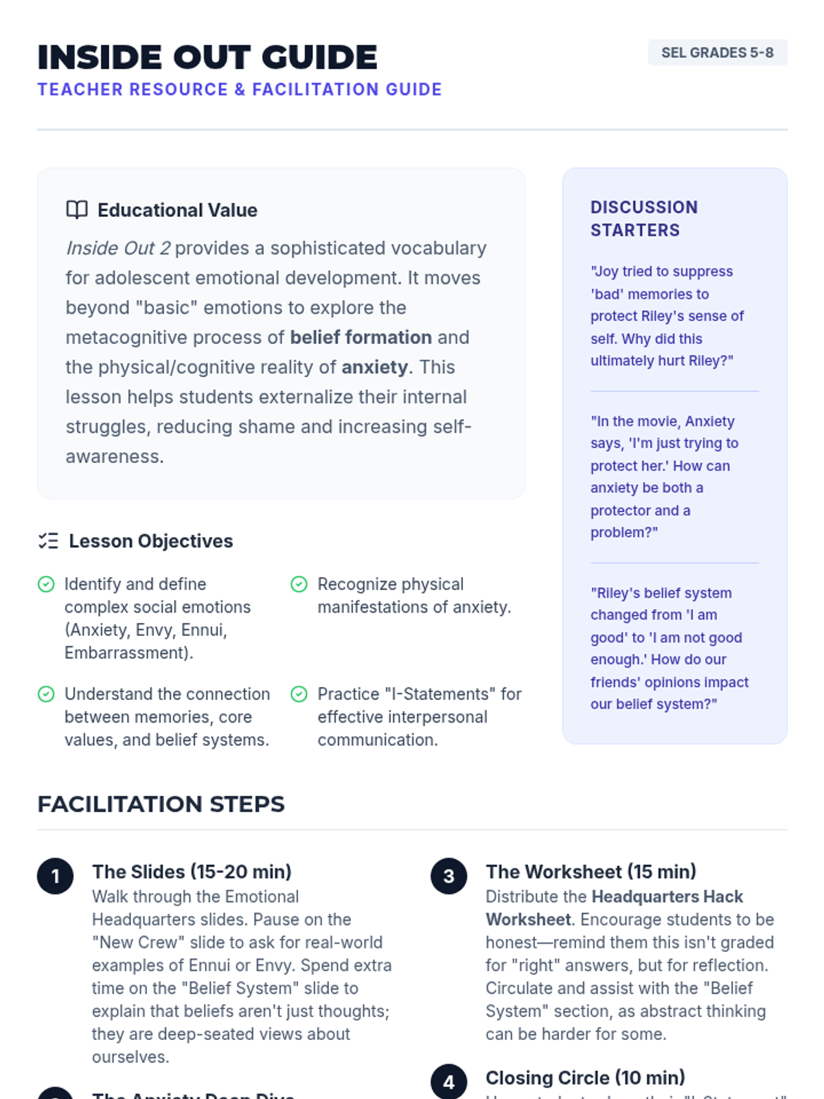 This lesson explores the emotional complexity of 'Inside Out 2', focusing on identifying new, sophisticated emotions, managing anxiety, and understanding how our belief systems shape our interactions with the world.