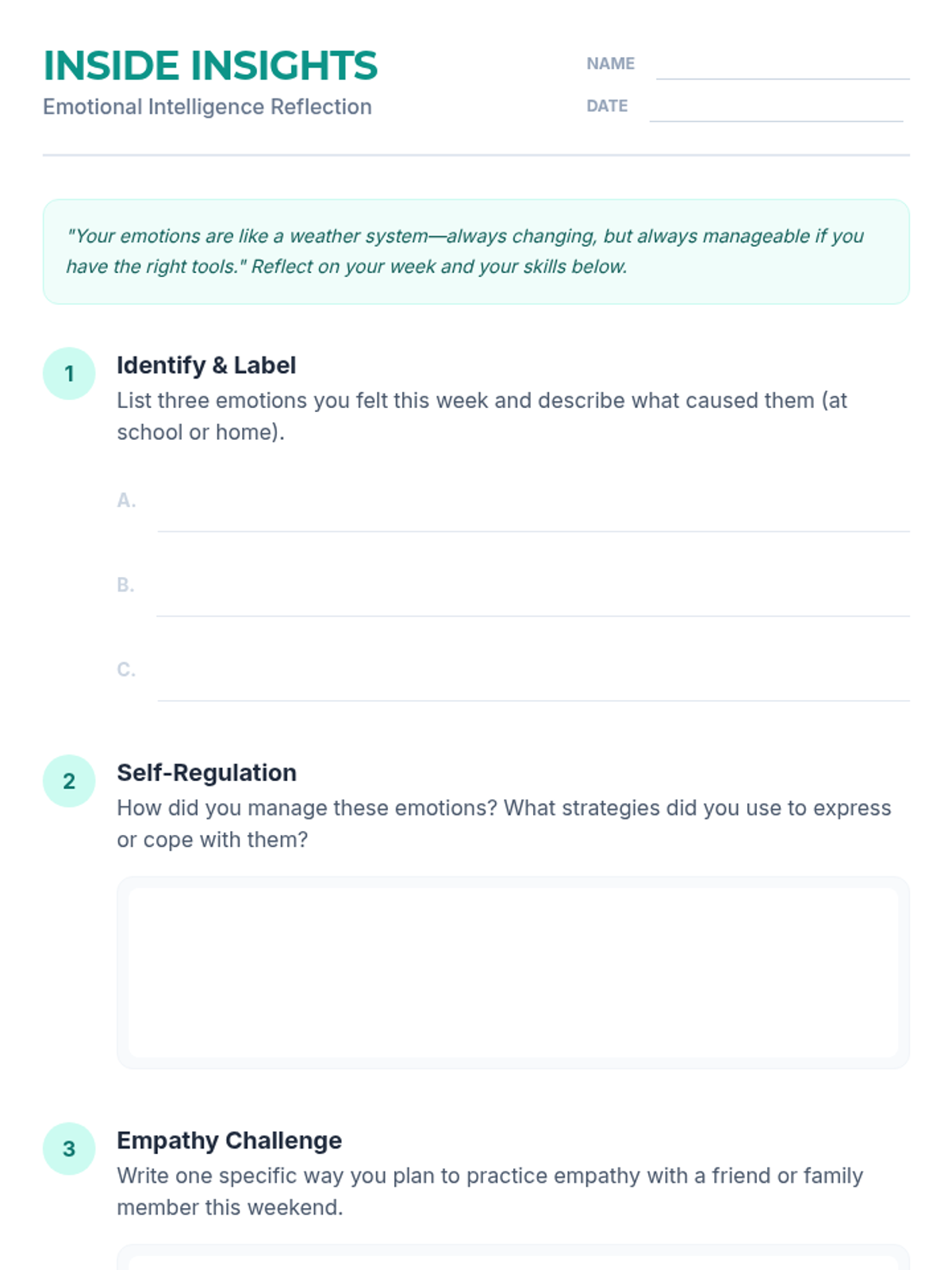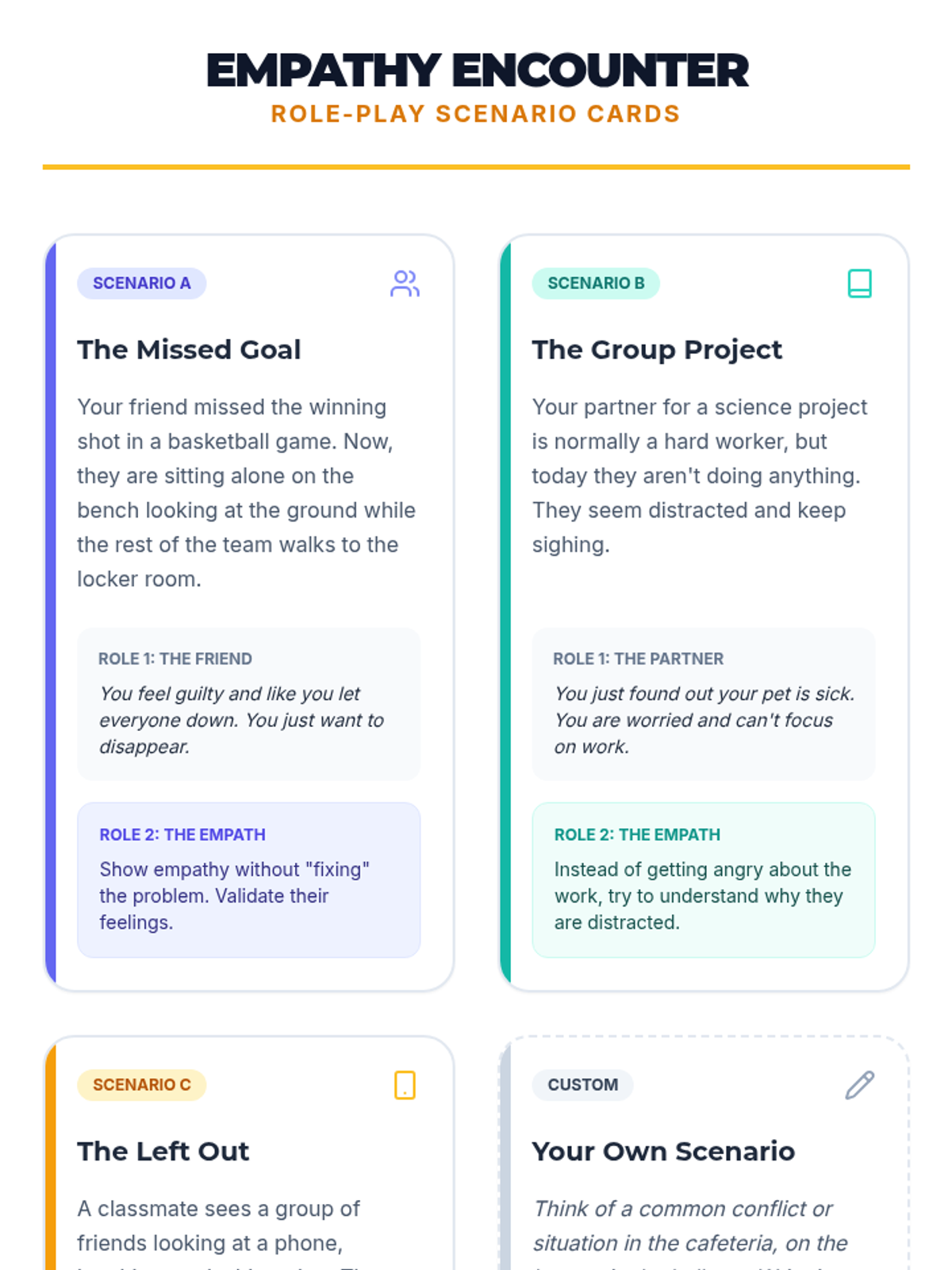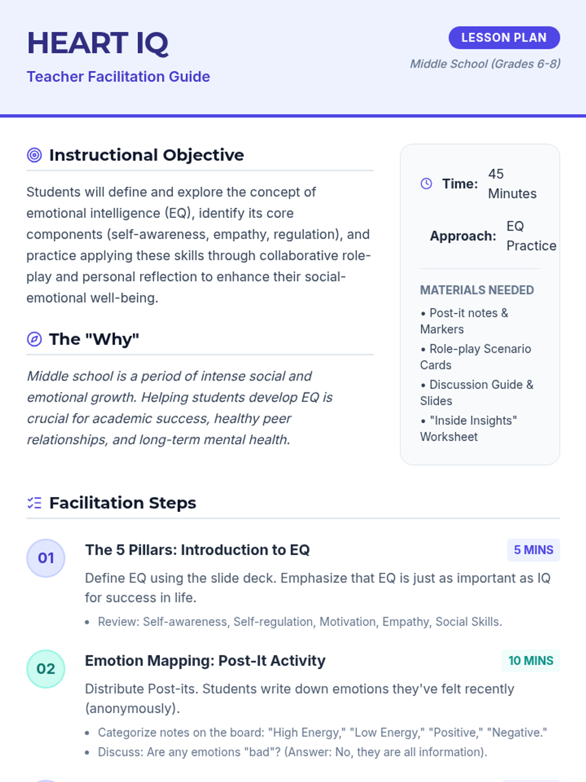 A comprehensive introduction to emotional intelligence for middle schoolers, focusing on self-awareness, empathy, and social skills through interactive role-play and reflection.