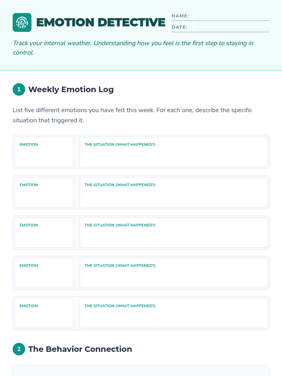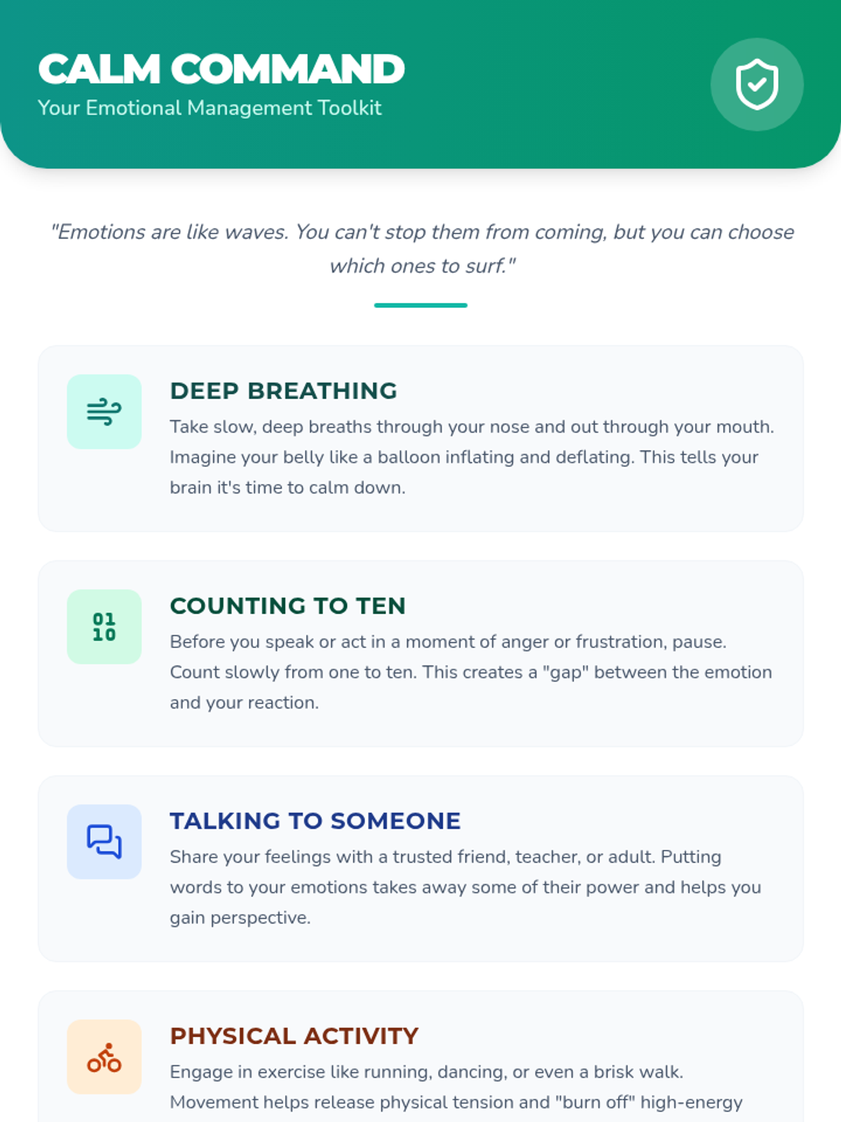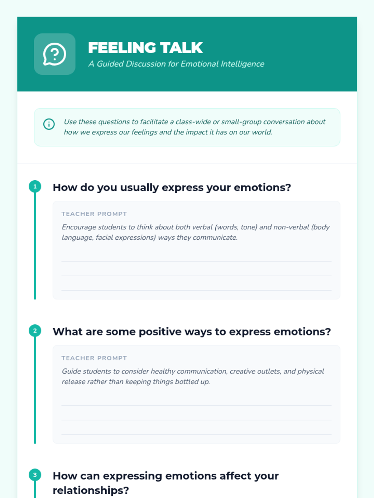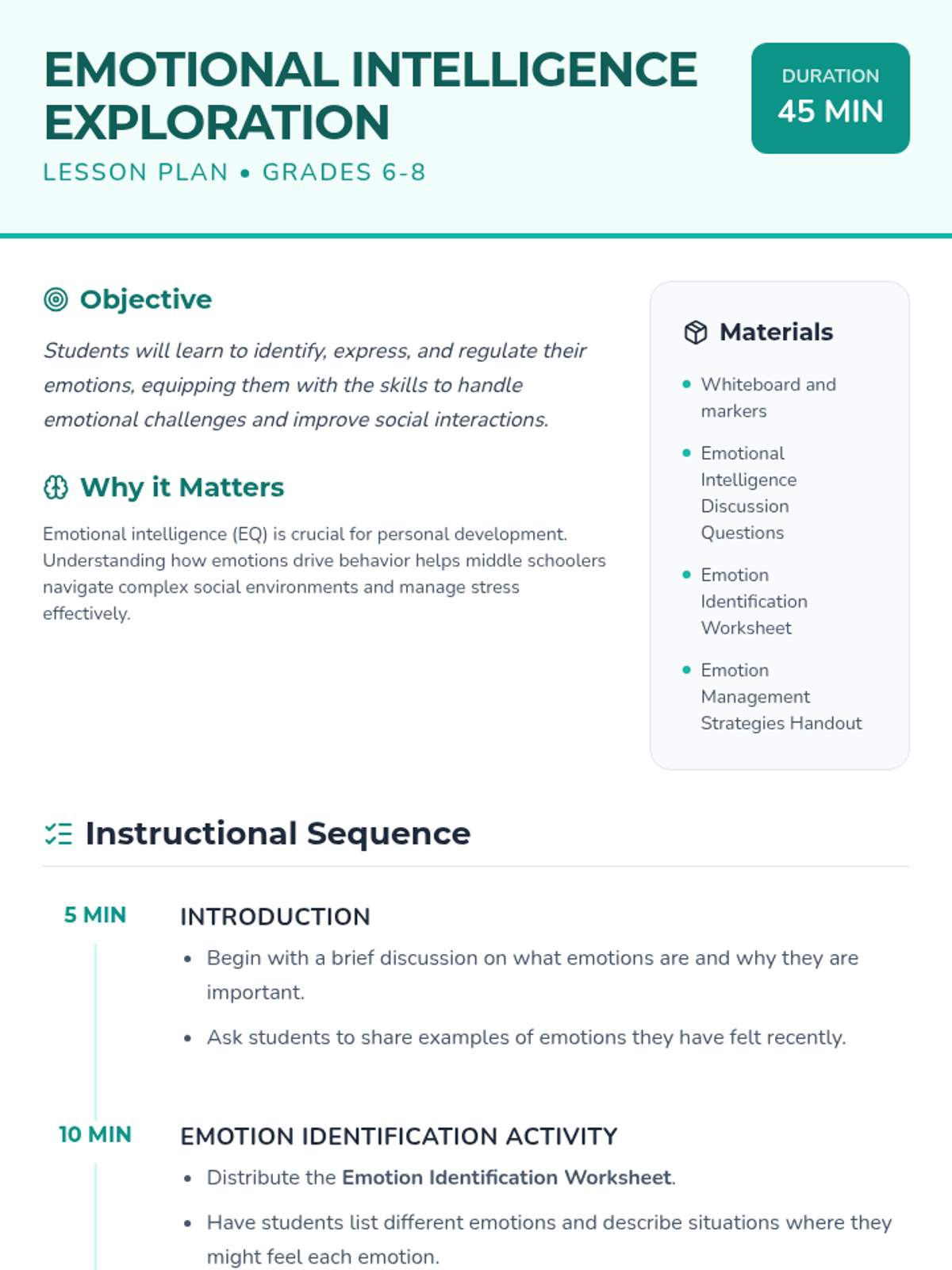 A comprehensive lesson for middle school students to identify, understand, and manage their emotions through interactive discussion and practical strategies.