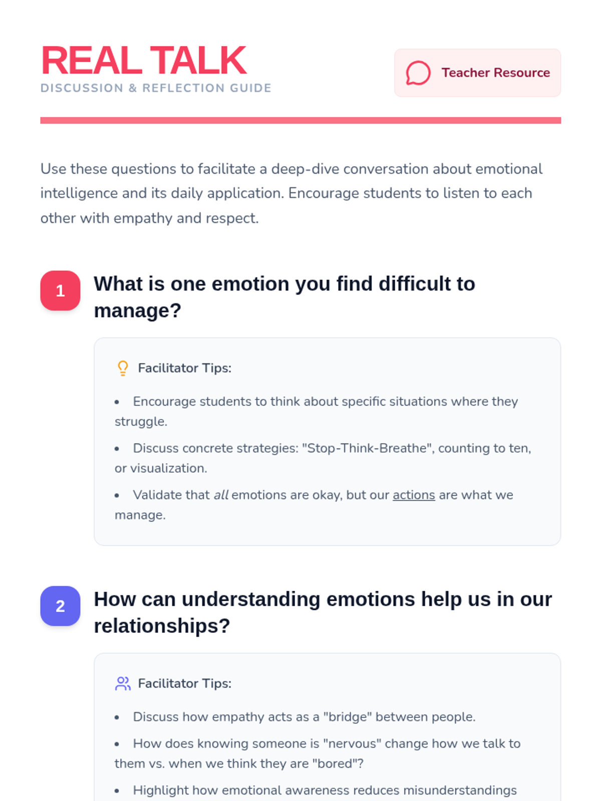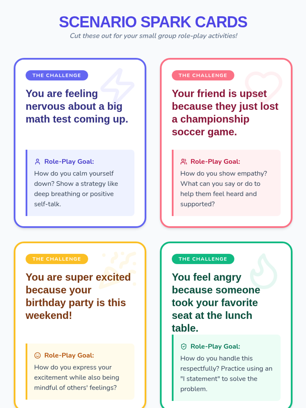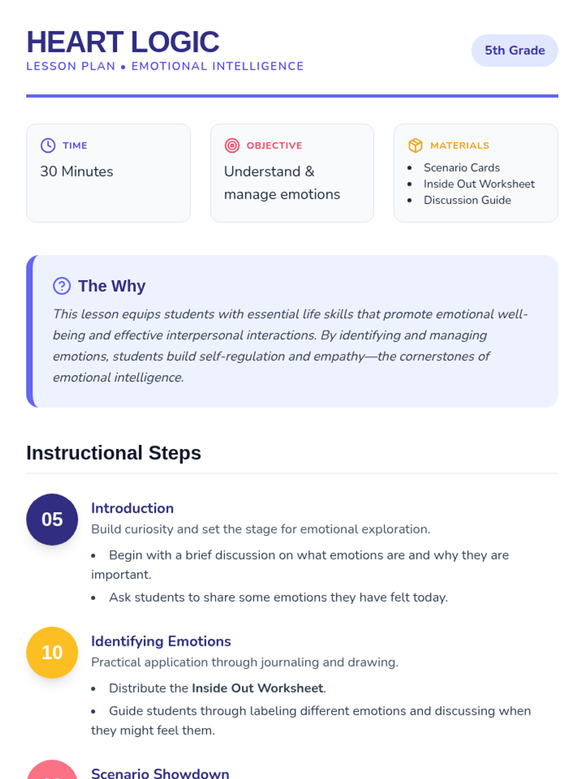 A comprehensive introduction to emotional intelligence for 5th graders, focusing on identifying emotions, self-regulation, and empathy through interactive role-play and reflection.