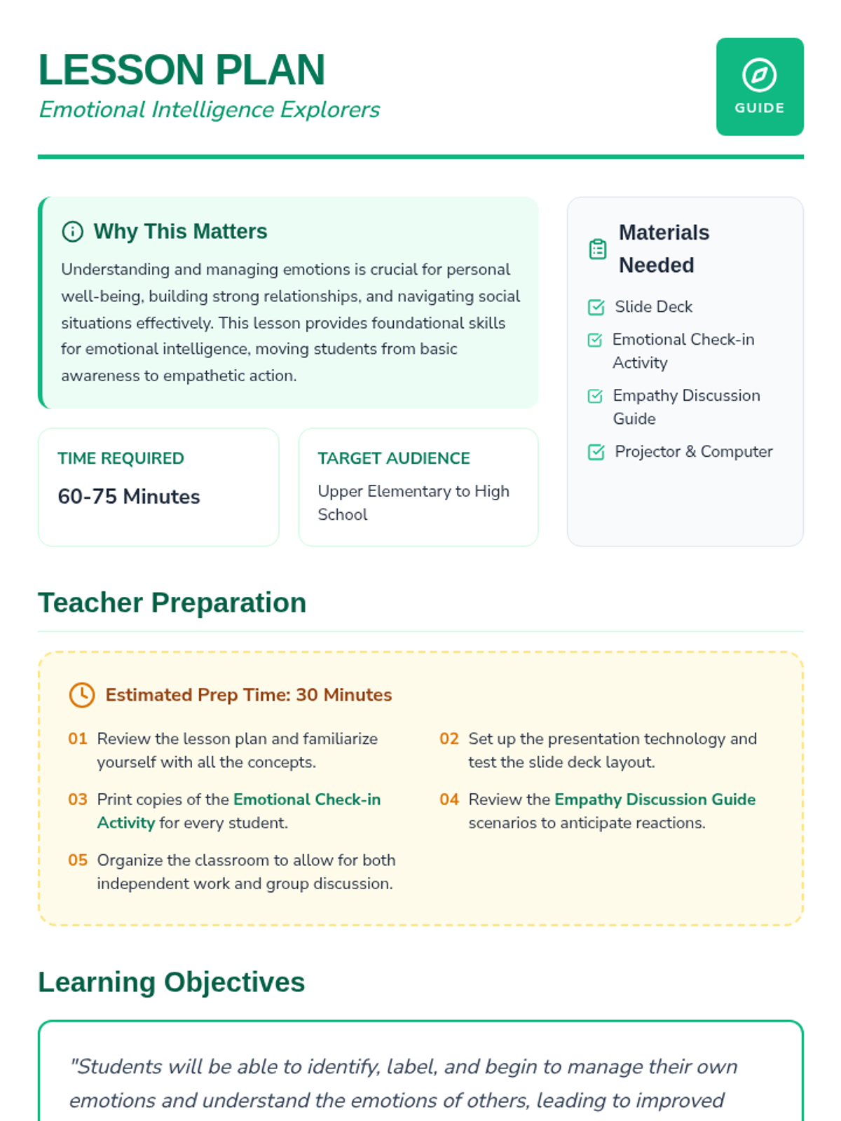 A foundational lesson on emotional intelligence where students learn to identify, label, and manage their own emotions while developing empathy for others through scenarios and reflection.