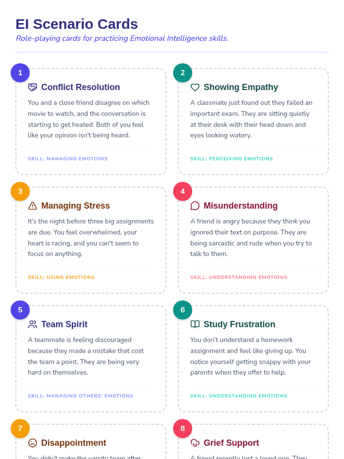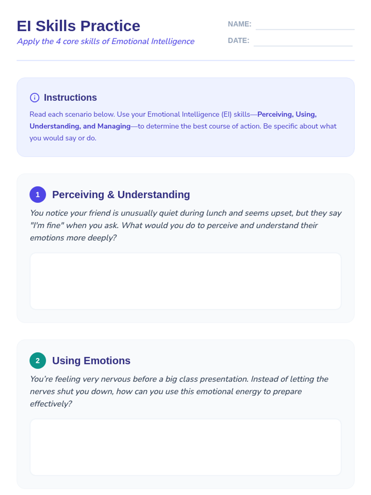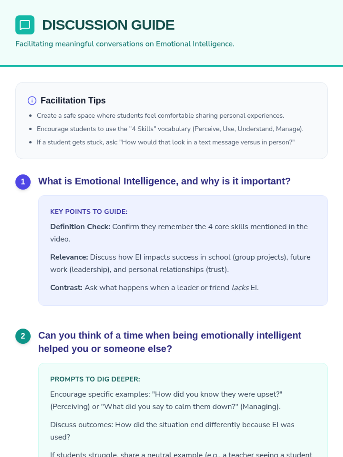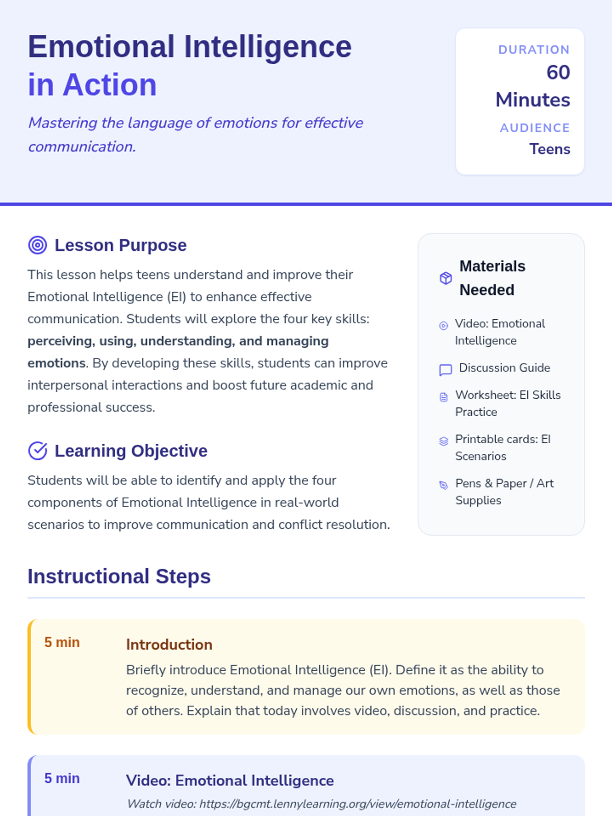 A comprehensive lesson designed for teens to understand and practice the four key components of Emotional Intelligence: perceiving, using, understanding, and managing emotions. Students engage with video content, group discussions, role-playing, and creative reflection.