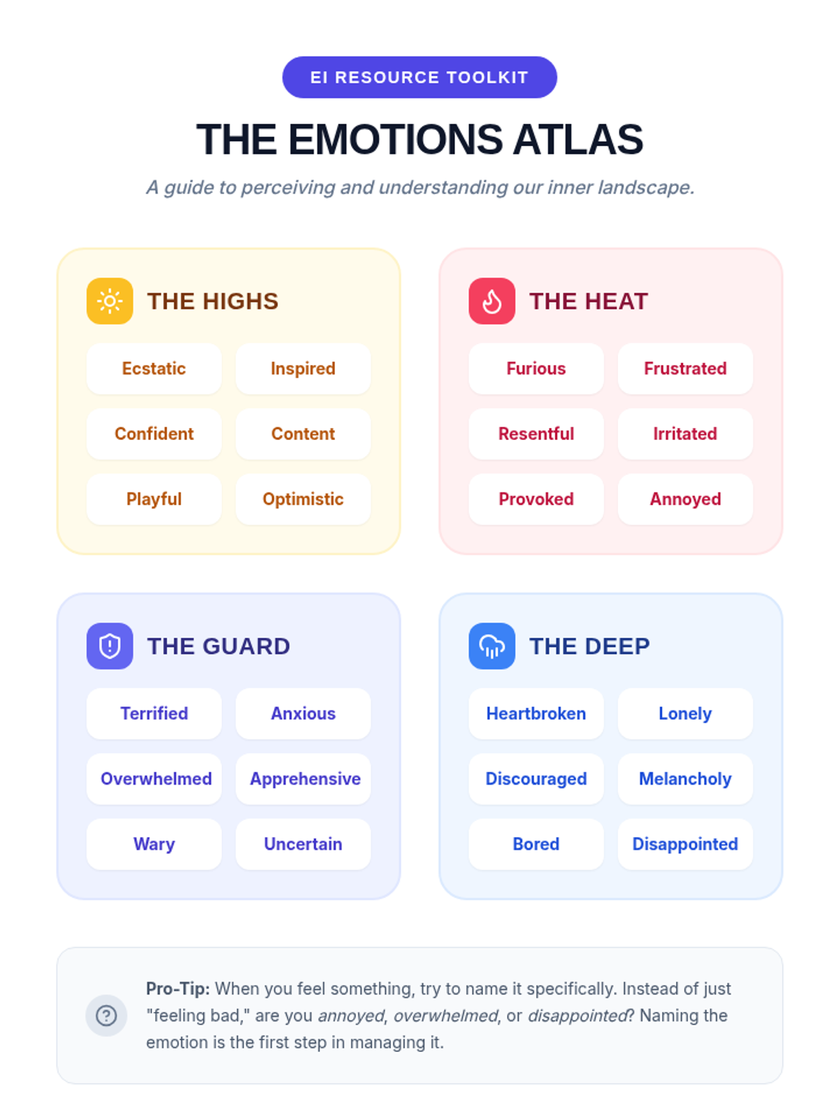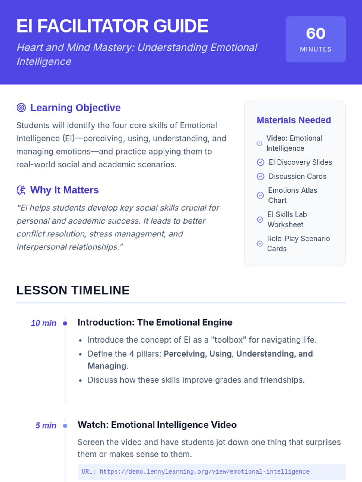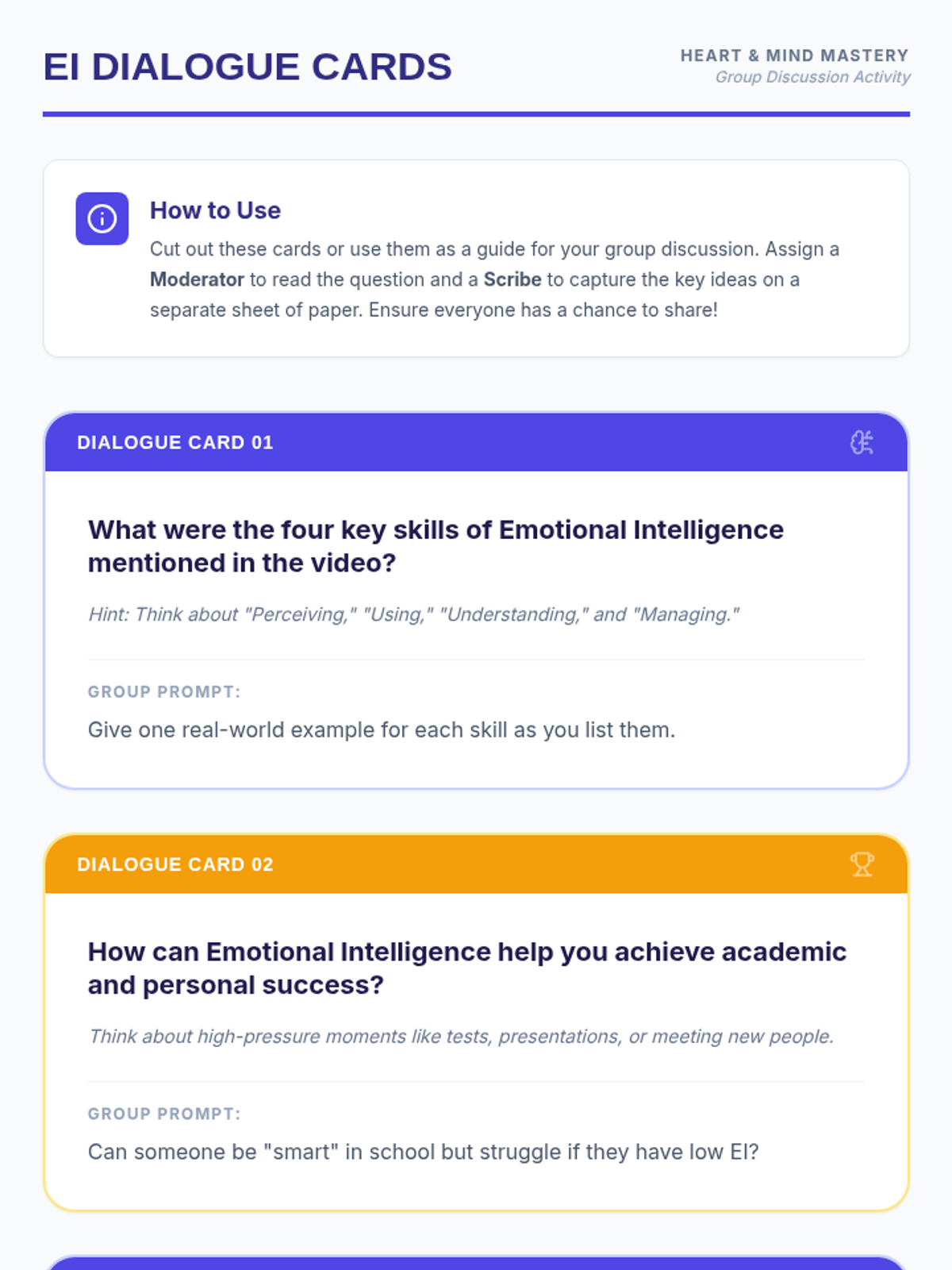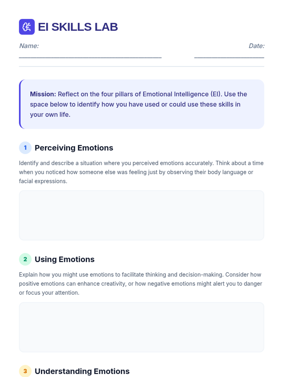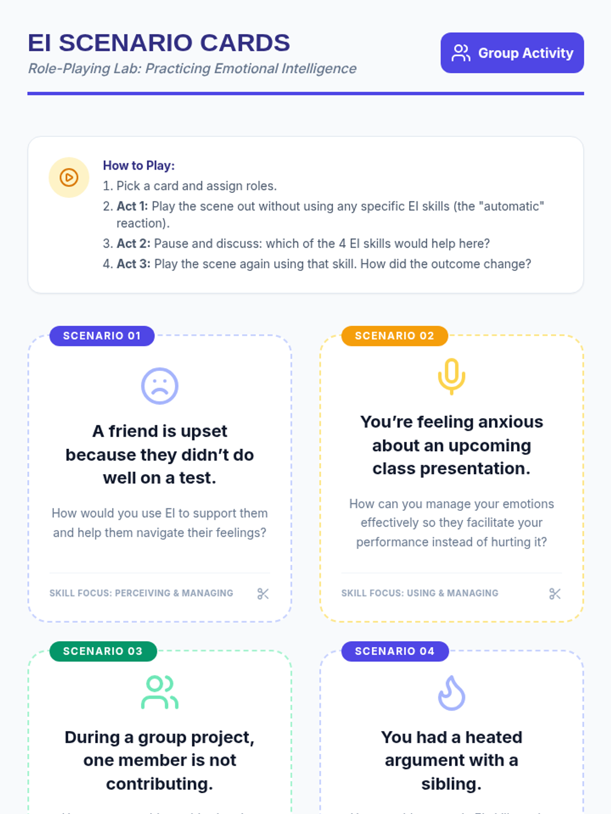A comprehensive lesson for middle schoolers to explore and practice the four pillars of Emotional Intelligence: perceiving, using, understanding, and managing emotions through interactive role-play and reflection.