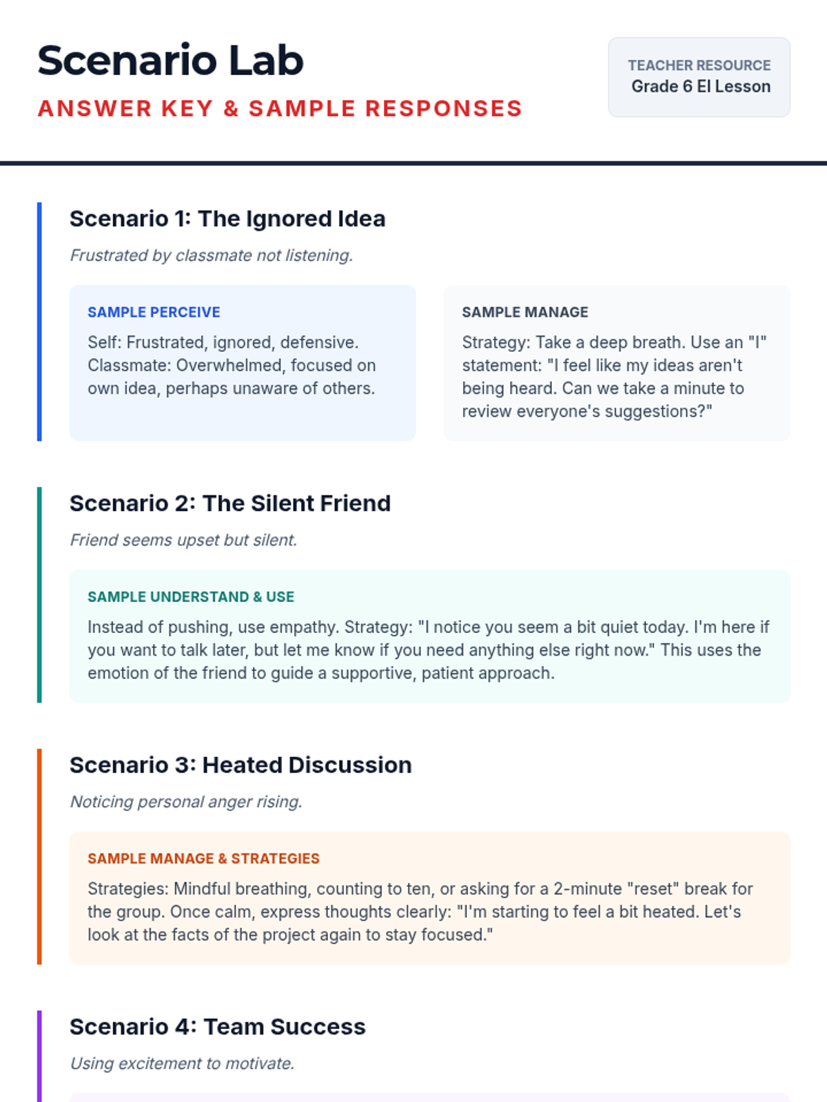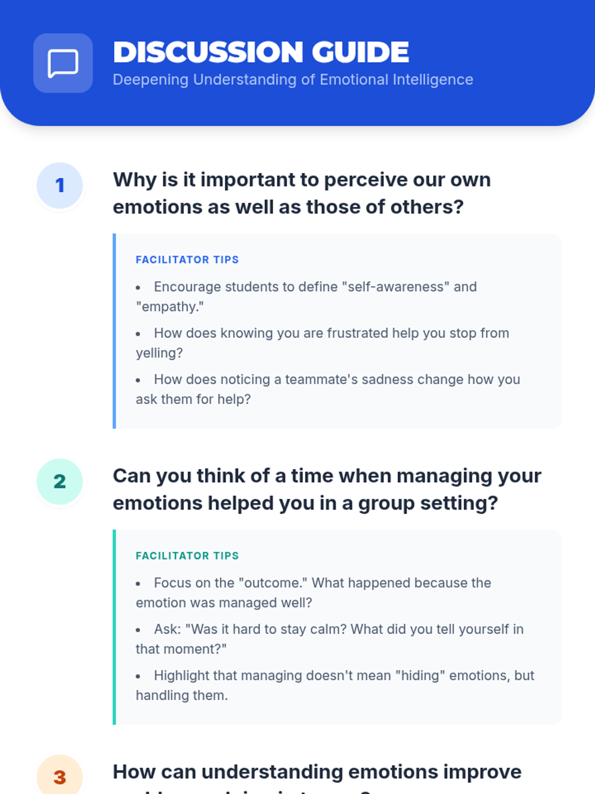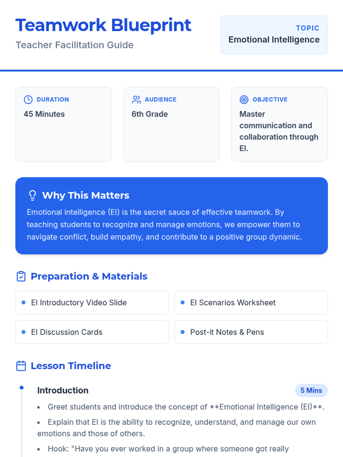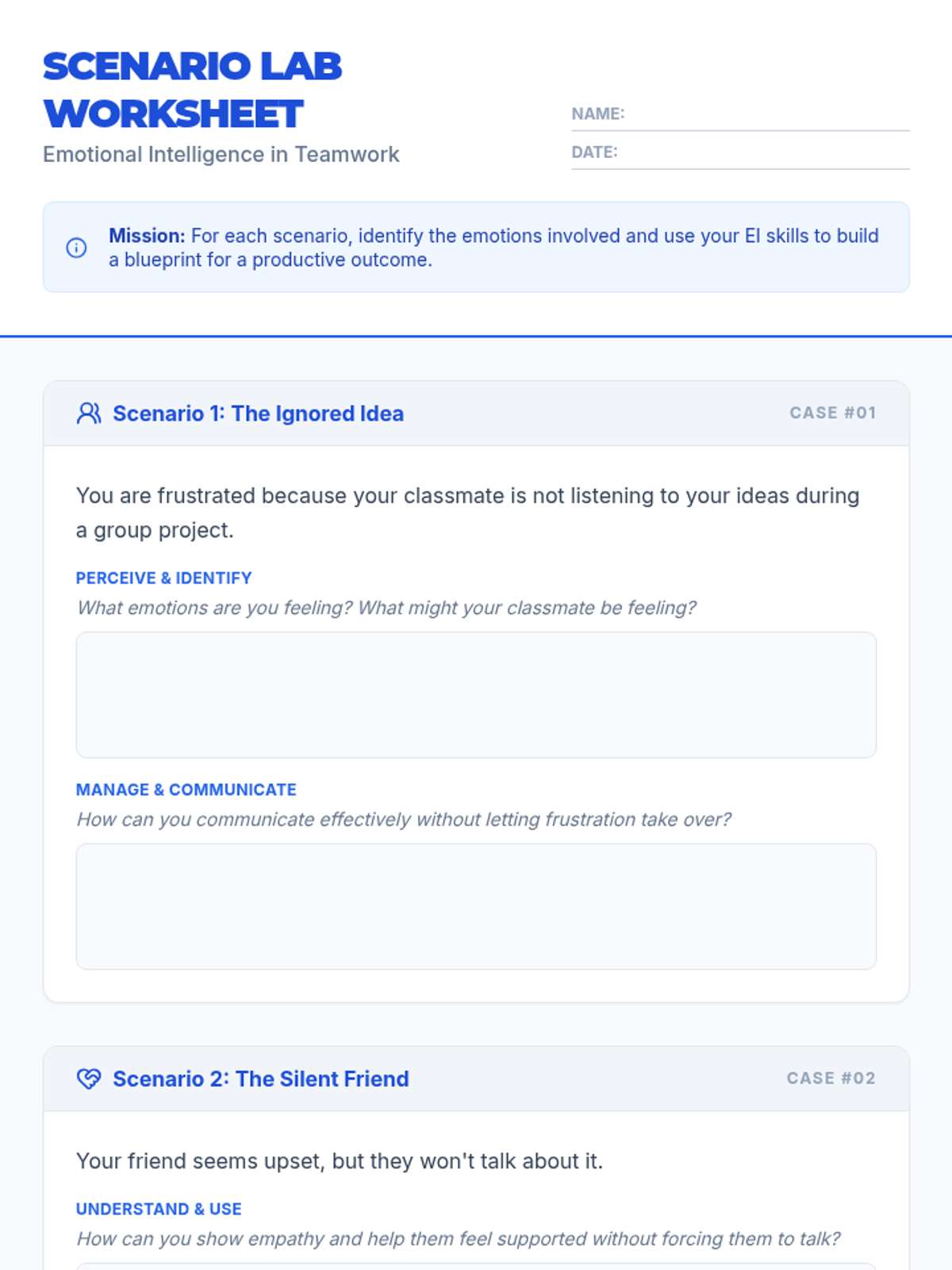 Students will learn the basics of emotional intelligence (EI) and its impact on communication and collaboration. By understanding and managing their own emotions and recognizing those of others, students can enhance teamwork and empathy in group settings.