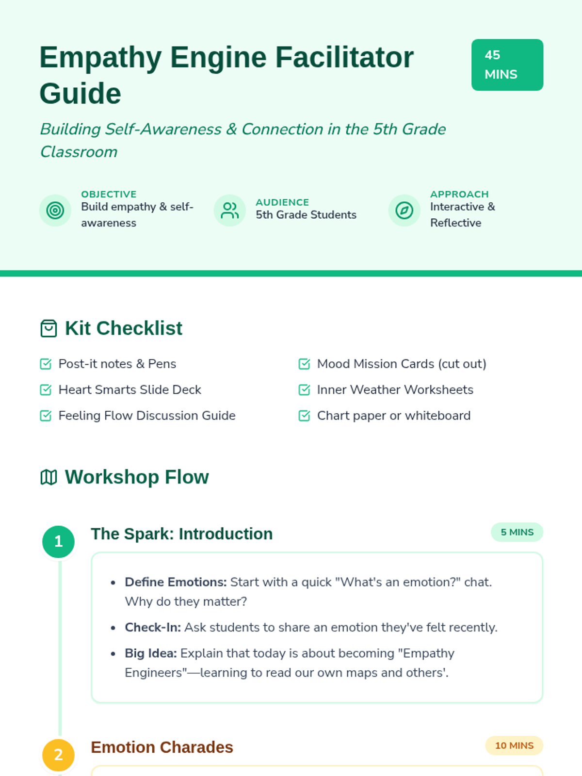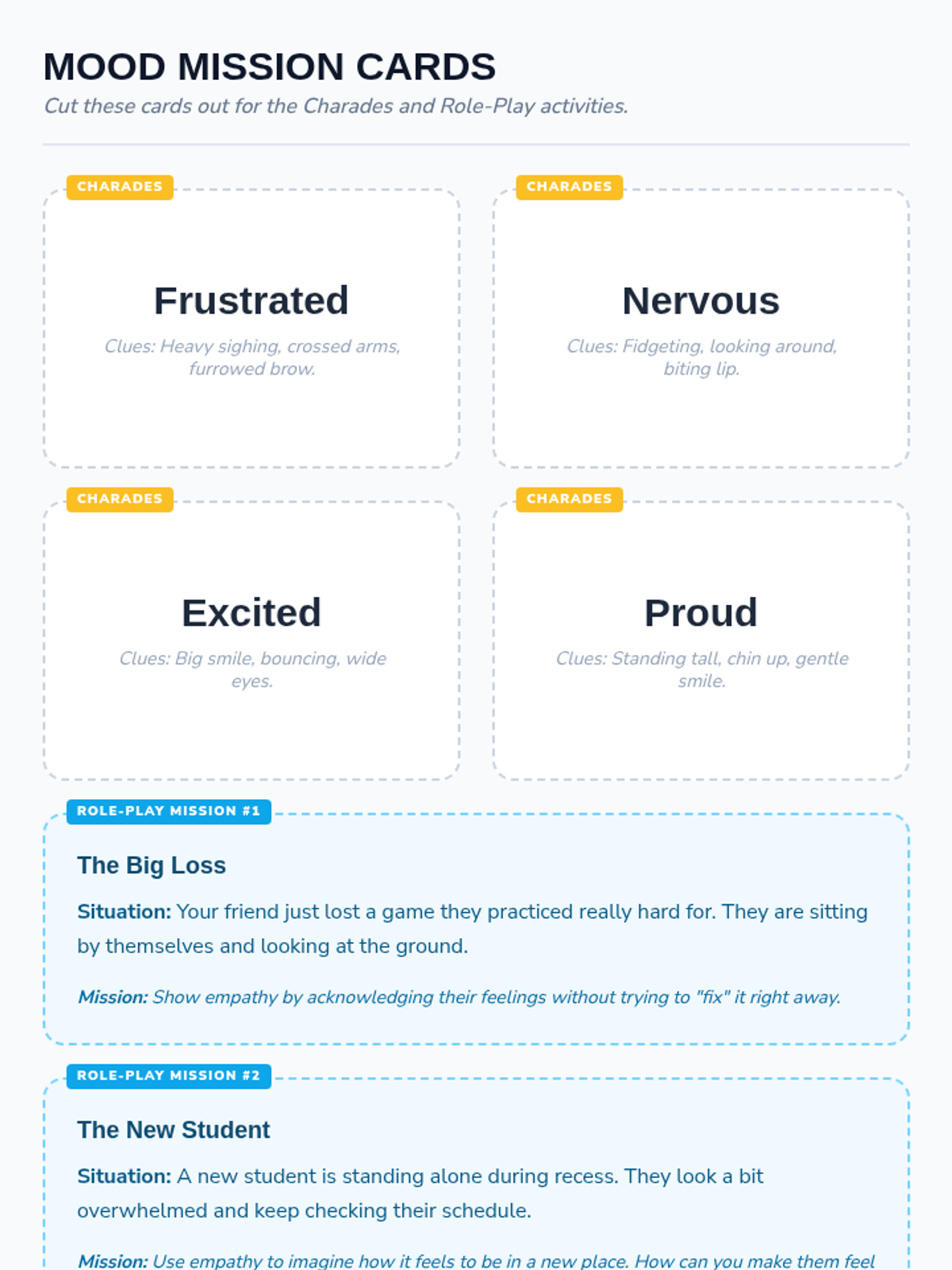 A 45-minute workshop designed for 5th graders to explore self-awareness and empathy through interactive charades, role-playing, and guided reflection. Students will learn to identify emotions and develop strategies for managing them in social situations.