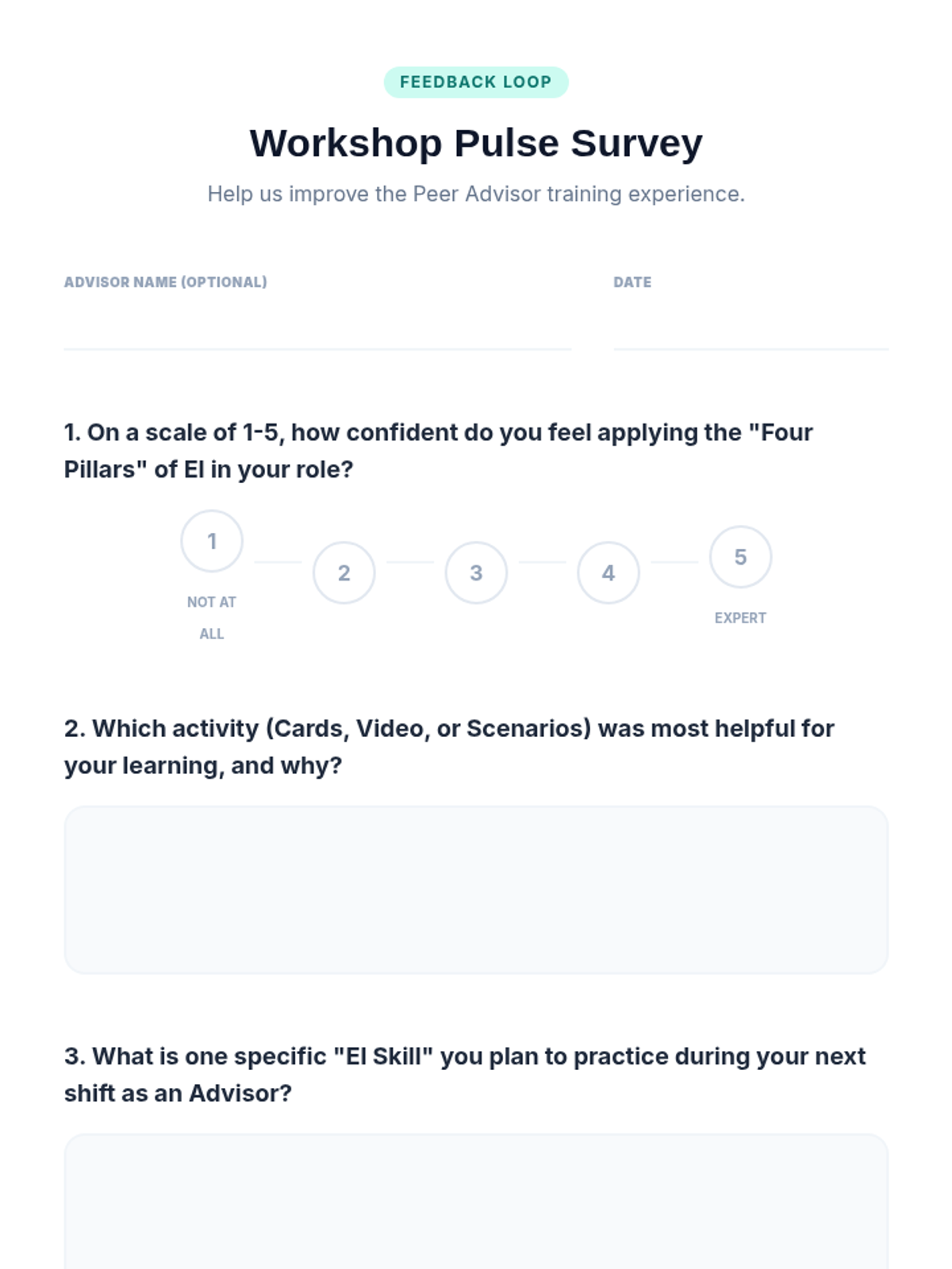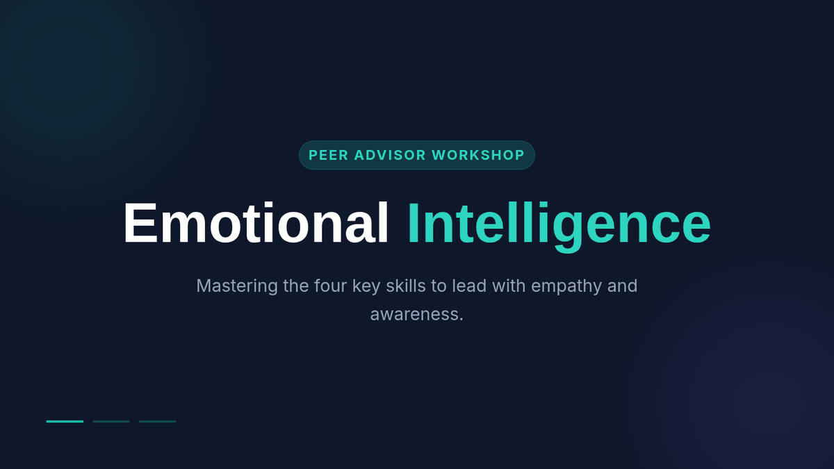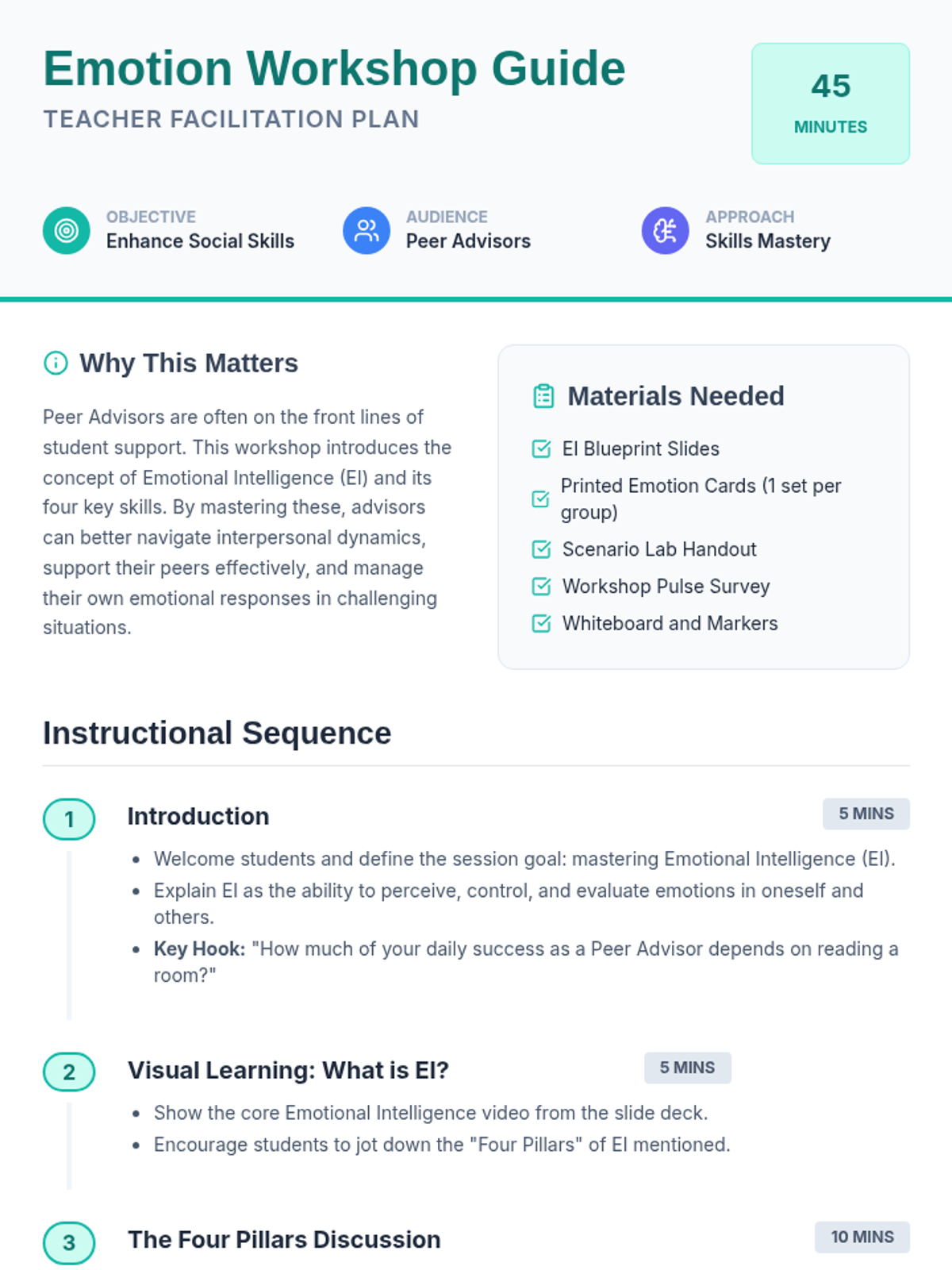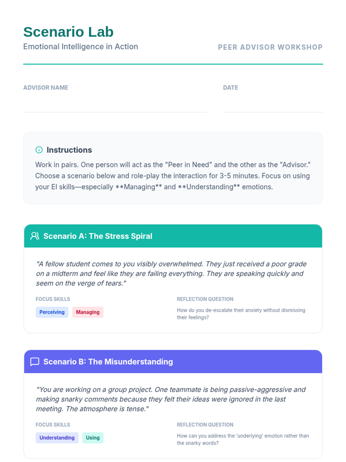 An interactive workshop for Peer Advisors to develop Emotional Intelligence skills, focusing on perceiving, using, understanding, and managing emotions through role-play and discussion.