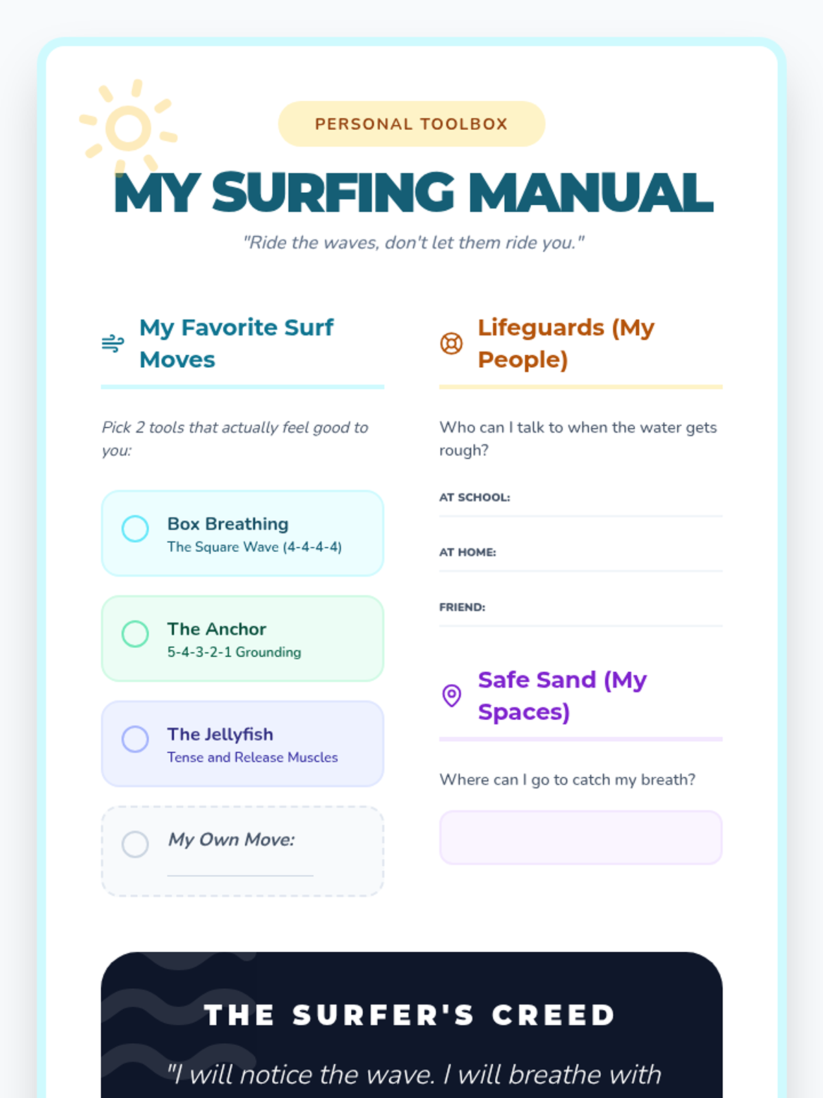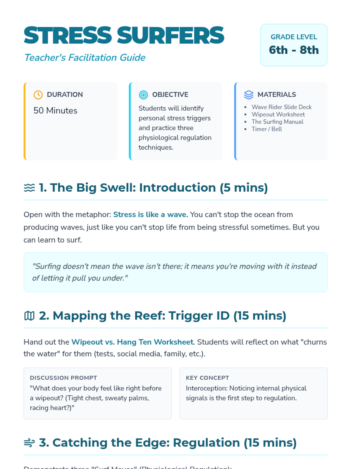 A mental health lesson for middle schoolers that uses a surfing metaphor to teach stress management, trigger identification, and physiological regulation techniques. Students create a personal toolkit for navigating high-pressure situations.