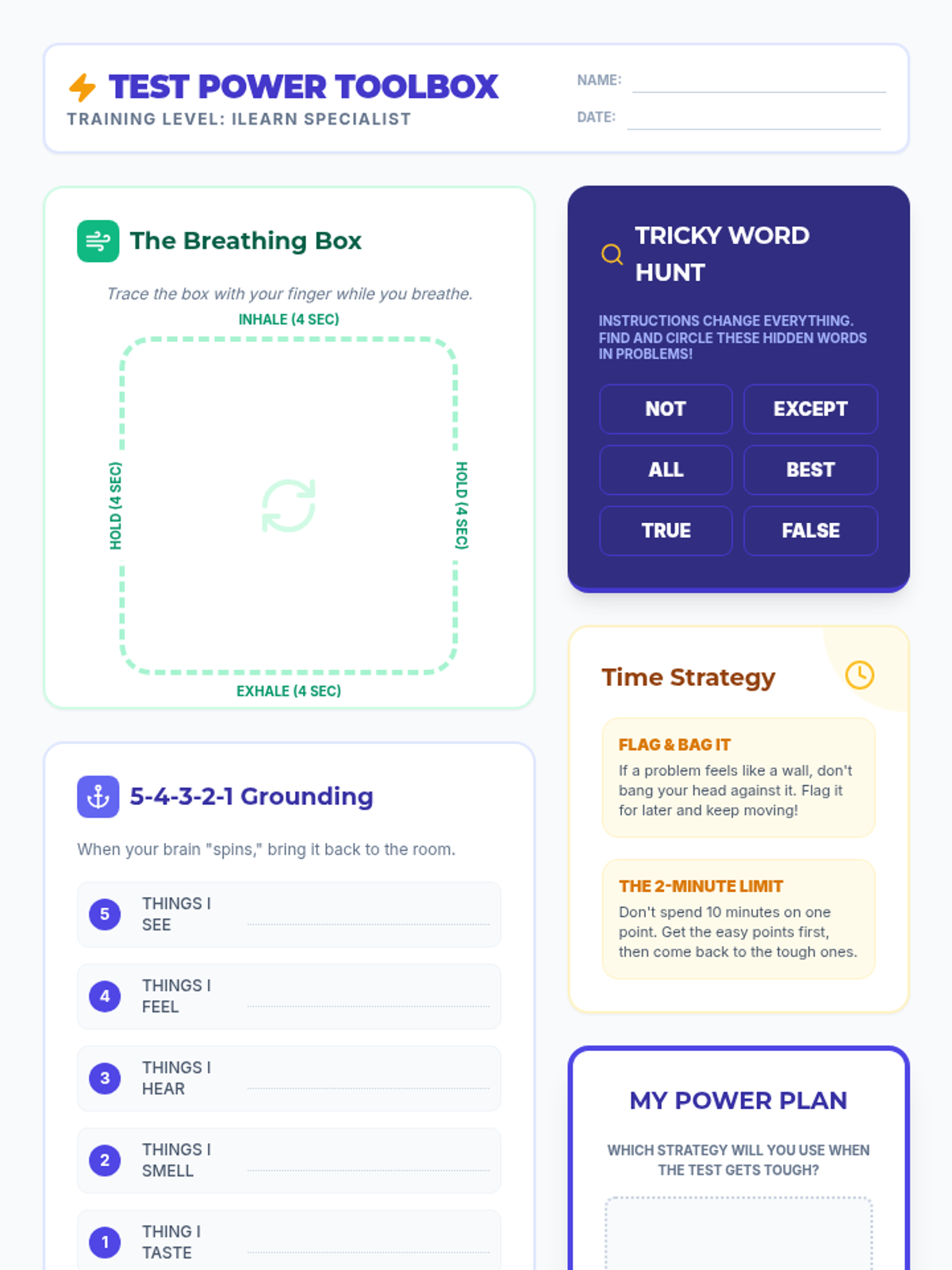 A Tier 2 small group lesson for grades 3-5 focusing on non-academic test-taking strategies, stress management, and relaxation techniques to help 'bubble' students succeed on the ILEARN math assessment.