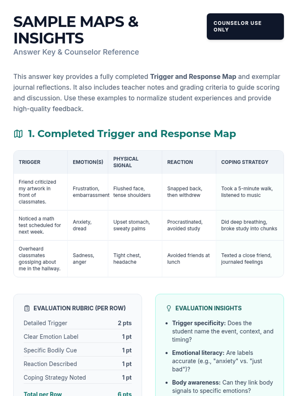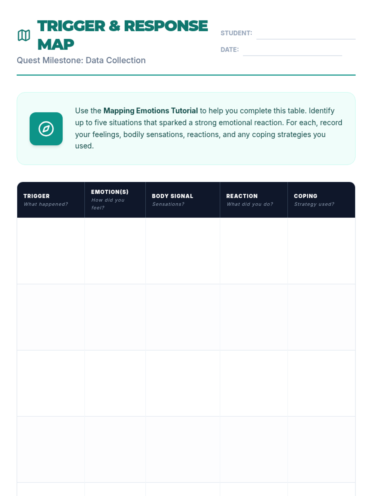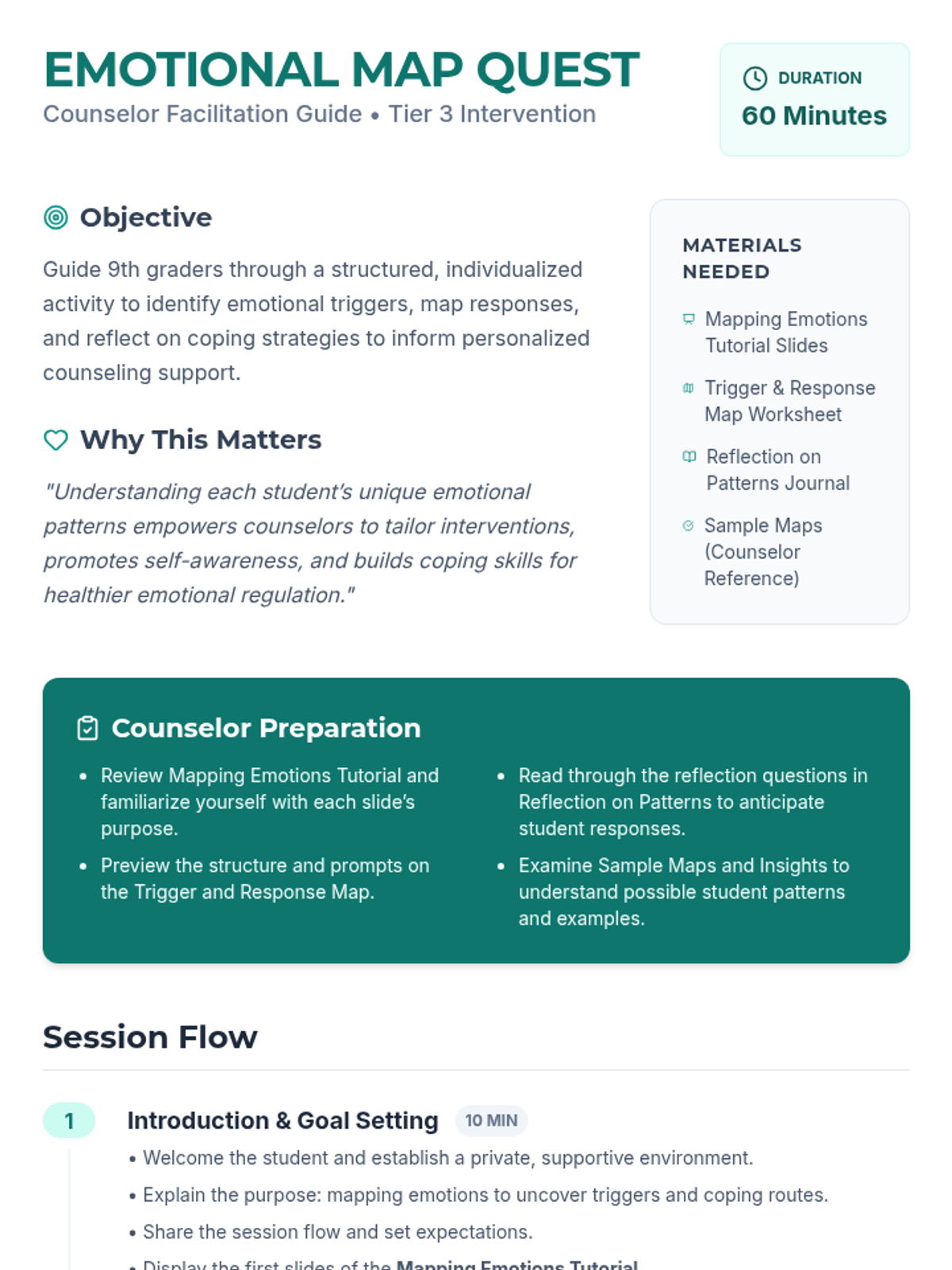 A 60-minute Tier 3 counseling lesson for 9th graders focused on identifying personal emotional triggers, physical responses, and coping strategies through a structured 'mapping' approach.