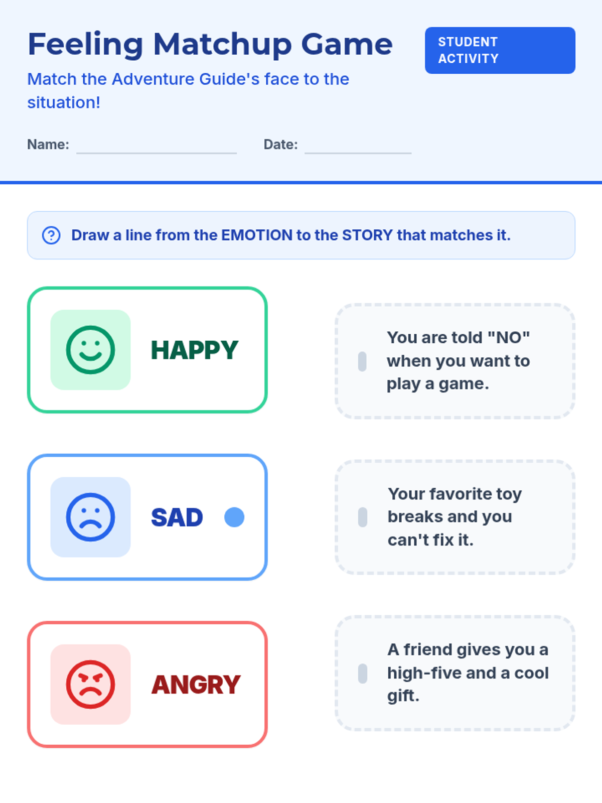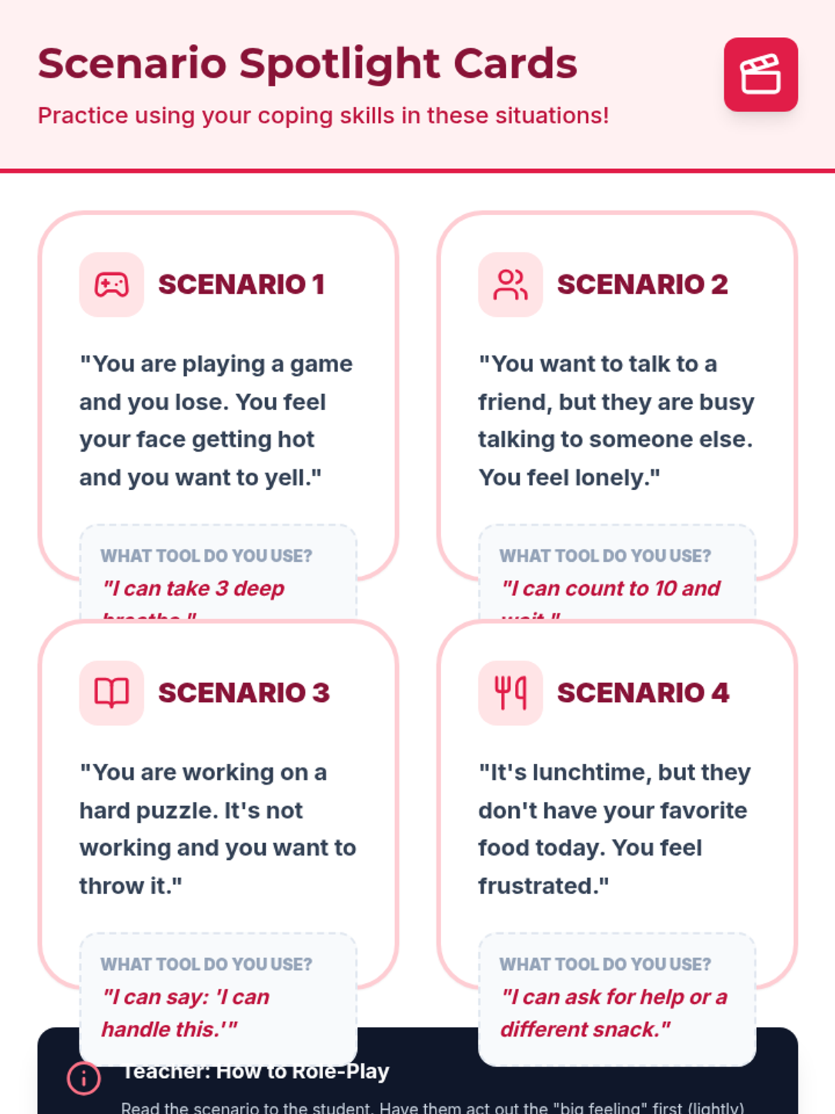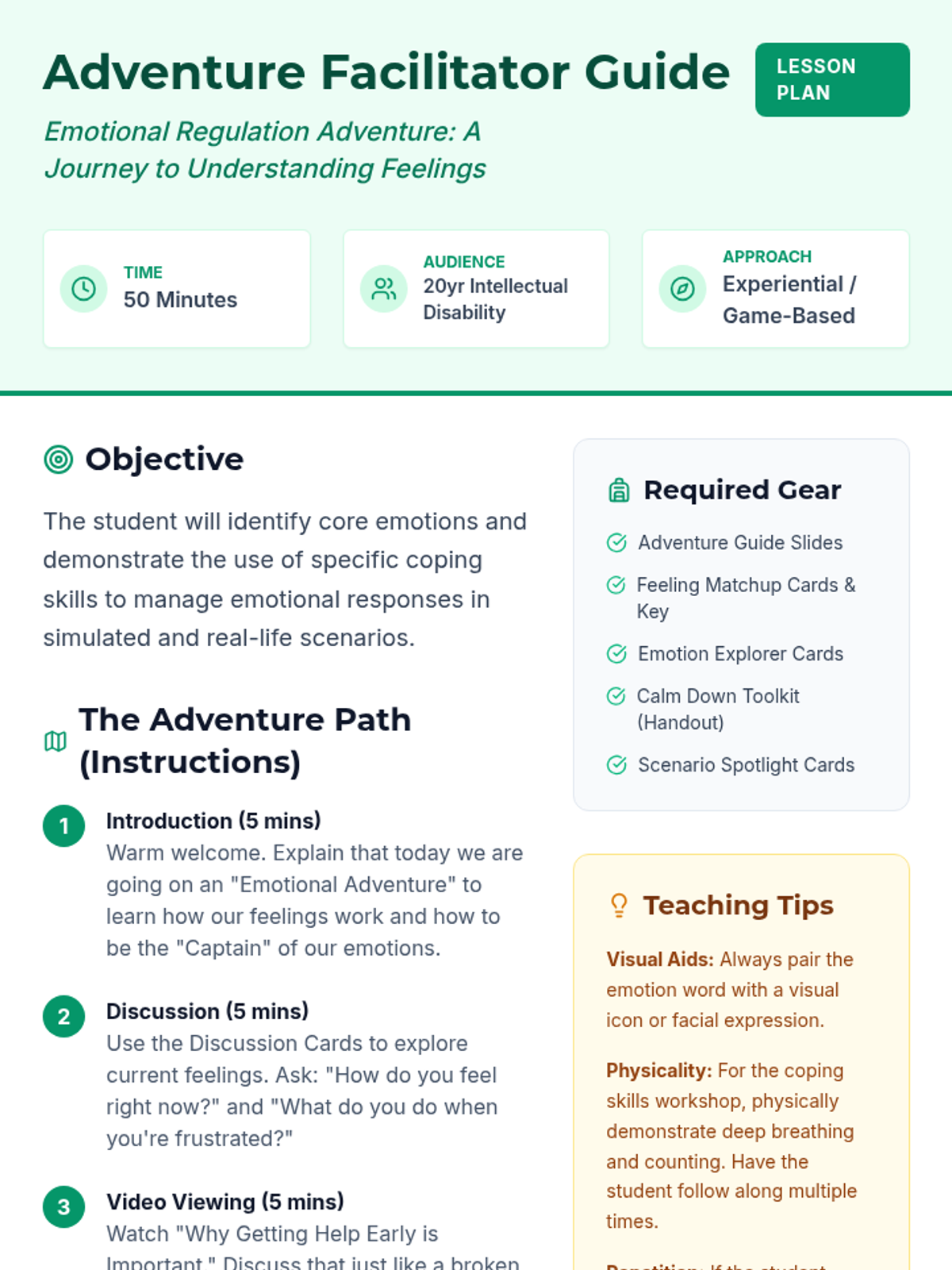 An experiential, game-based lesson for a 20-year-old intellectually disabled student to identify emotions and develop practical coping strategies through an adventure-themed journey.